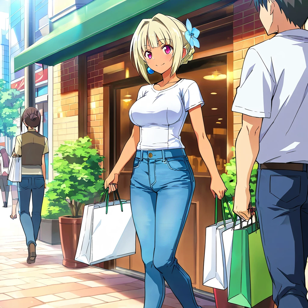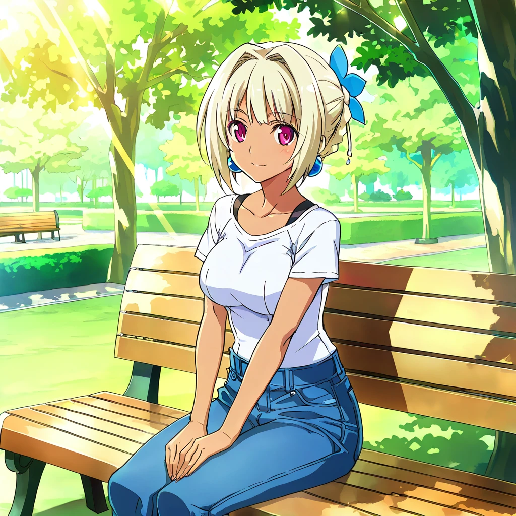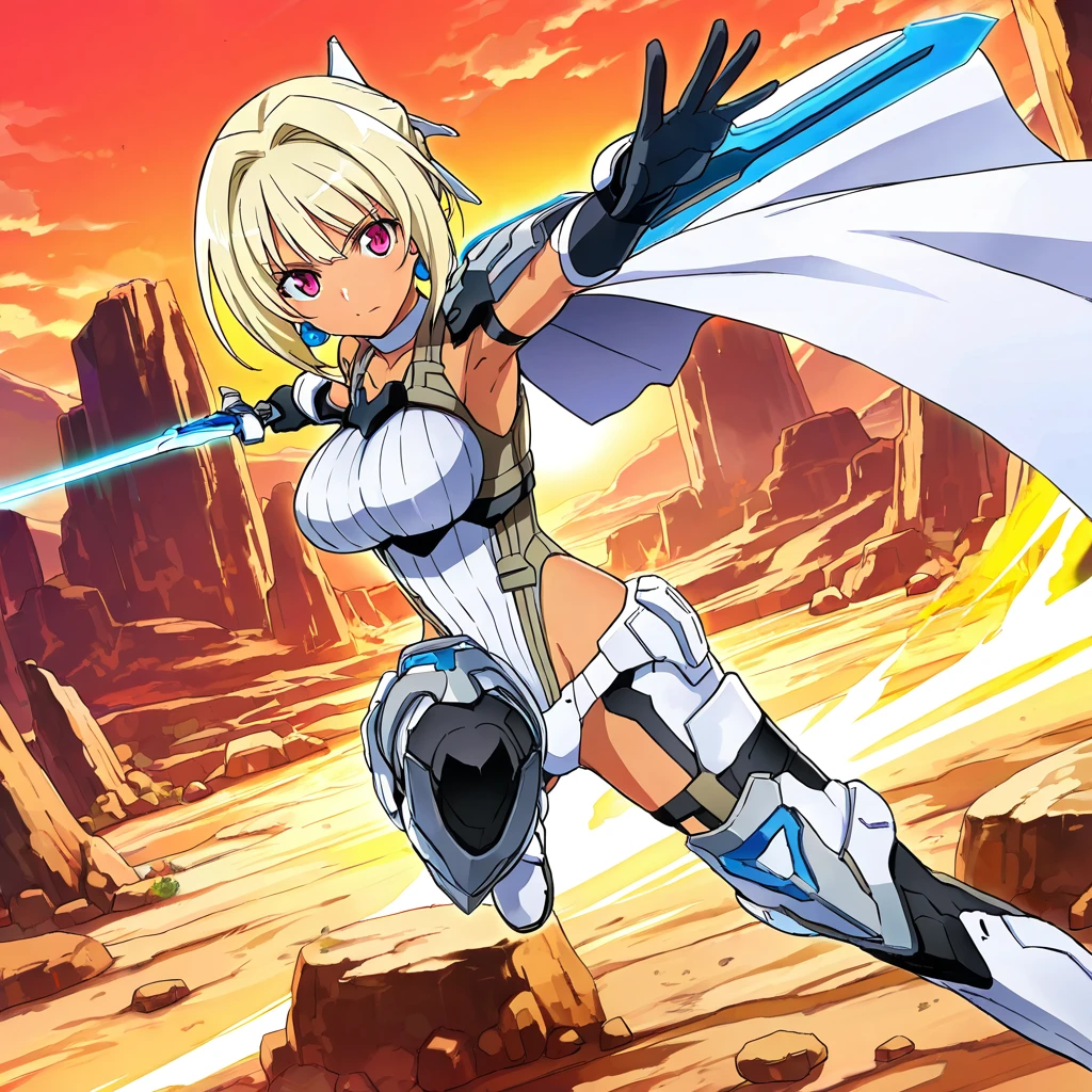 30ms_valkyrie, blue earrings, blonde hair, short hair, pink eyes, tan skin, white armor, breastplate, vertical-striped shirt, white bodysuit, exposed sides, cutouts, white panties, white gauntlets, single cape, cape on left shoulder, illustration, anime style, masterpiece, ultra-detailed