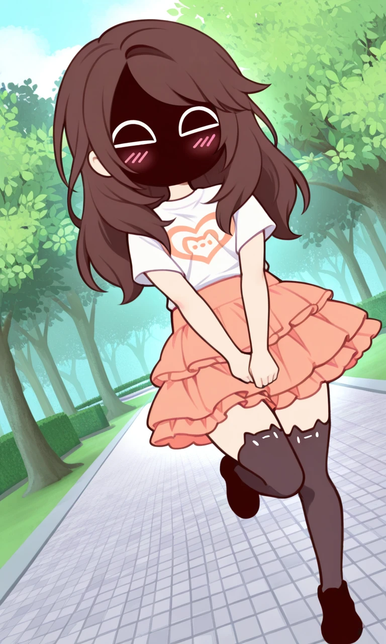 L1n1rl, 1girl, chibi, solo, long hair, looking at viewer, brown hair, small breasts, swept bangs, no nose, white eyes, no pupils, no mouth, glowing eyes, mask-like face, black face,
