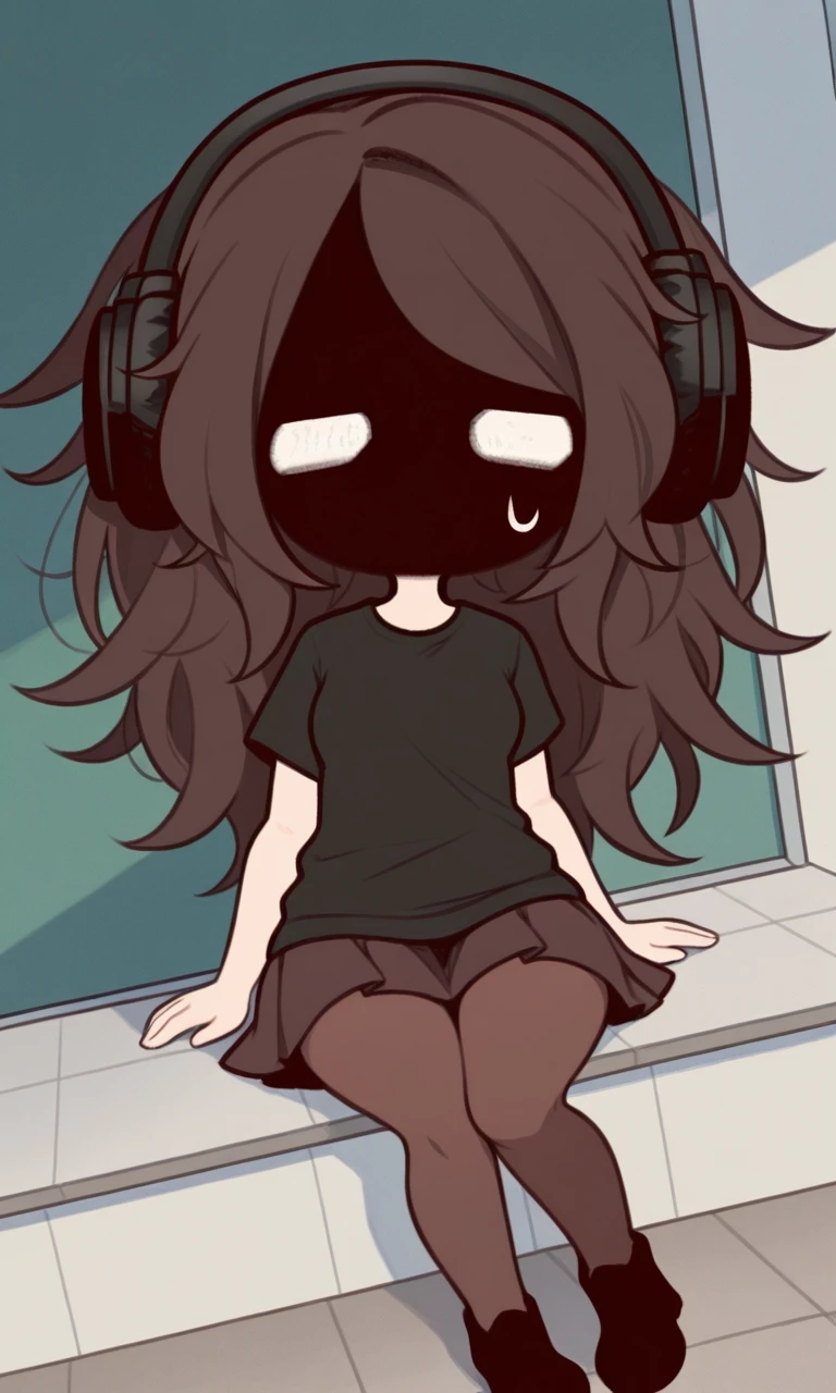 short sleeves, pleated skirt, black skirt, miniskirt, black footwear, black shirt, headphones, t-shirt, messy hair, brown pantyhose, brown skirt