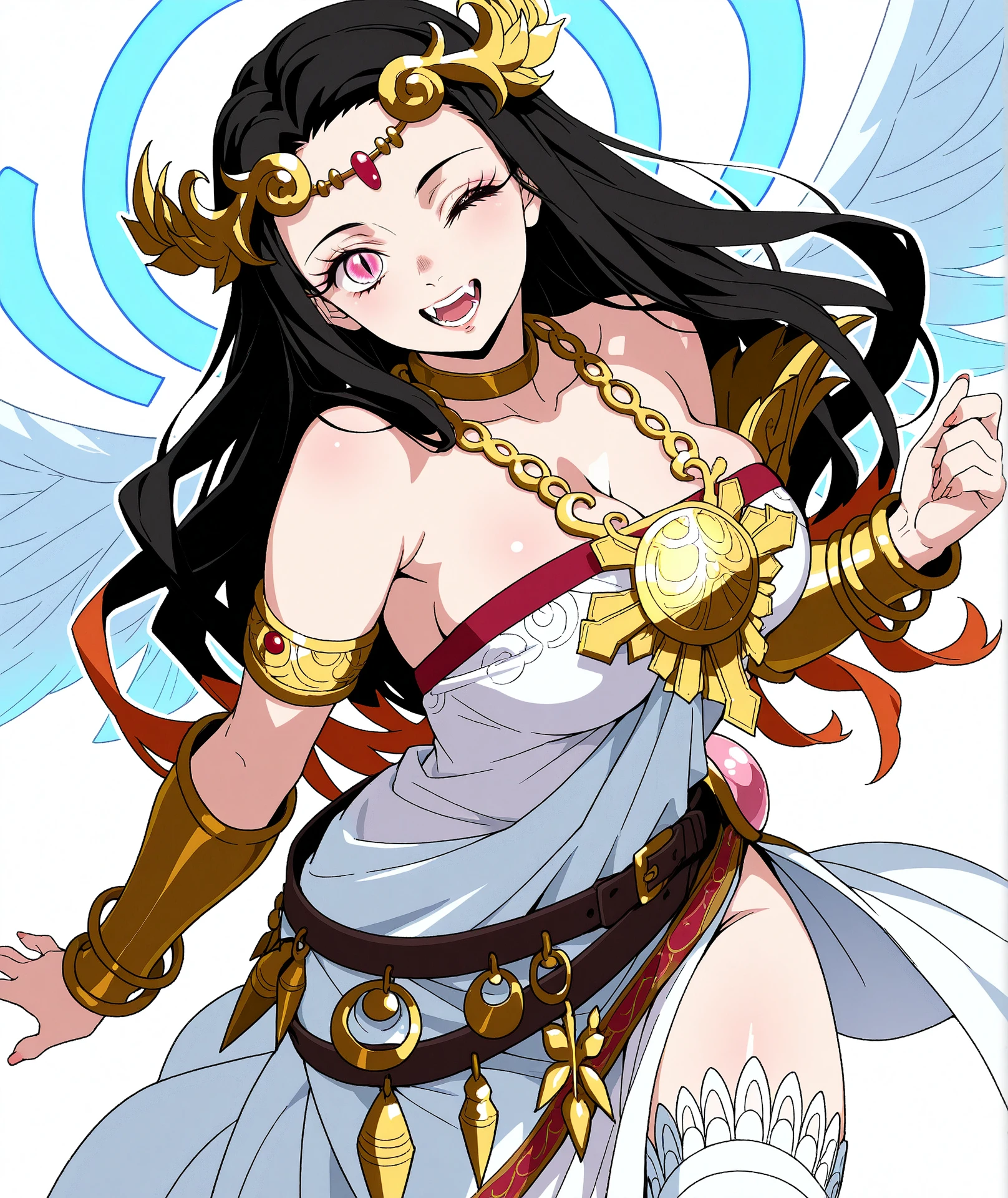 dress, jewelry, bare shoulders, choker, belt, white dress, necklace, bracelet, strapless, chain, strapless dress, side slit, neck ring, armlet, pendant, circlet, vambraces, bracer,