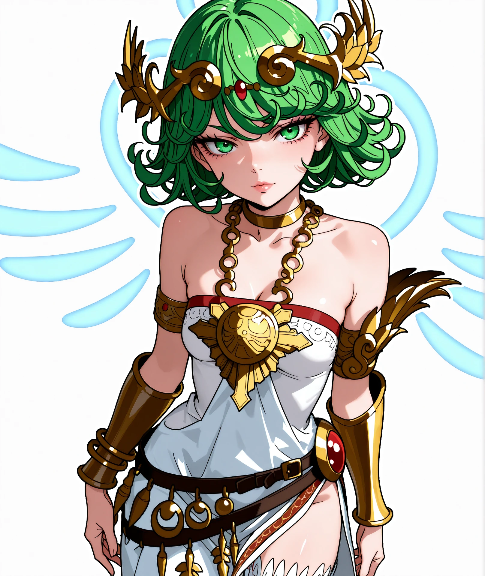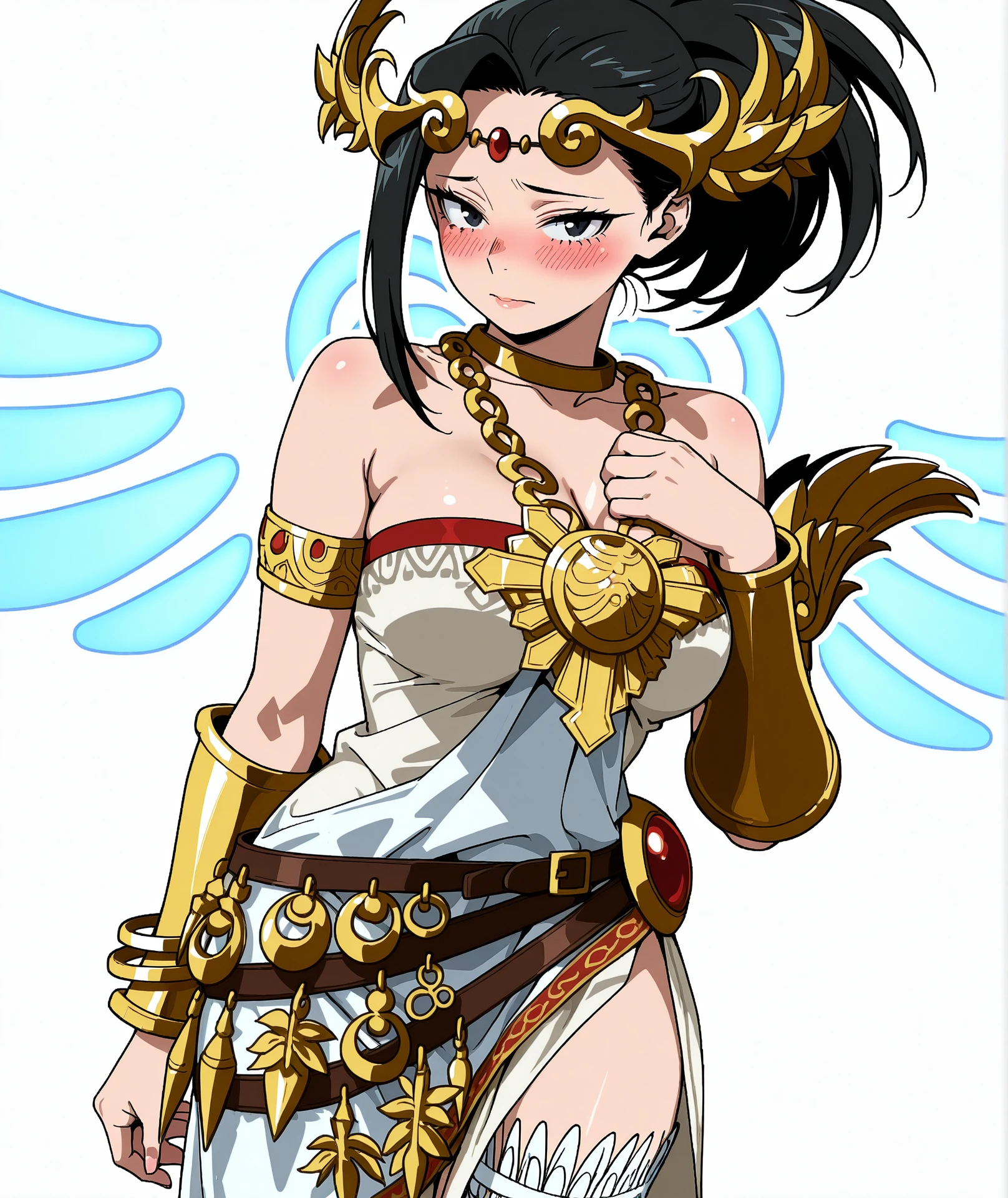 dress, jewelry, shoulders, choker, belt, white dress, necklace, bracelet, strapless, chain, strapless dress, side slit, neck ring, armlet, pendant, circlet, vambraces, bracer,