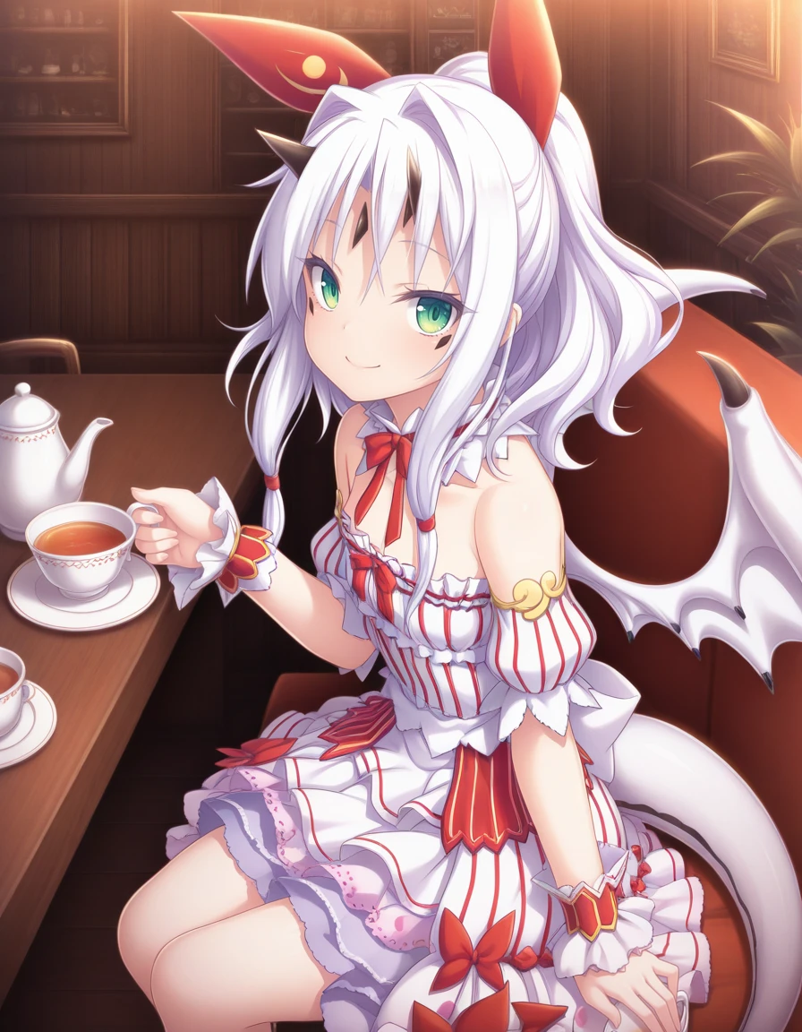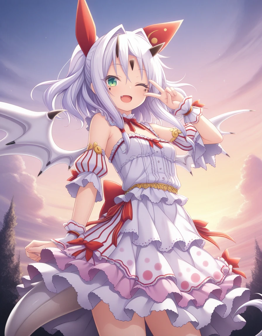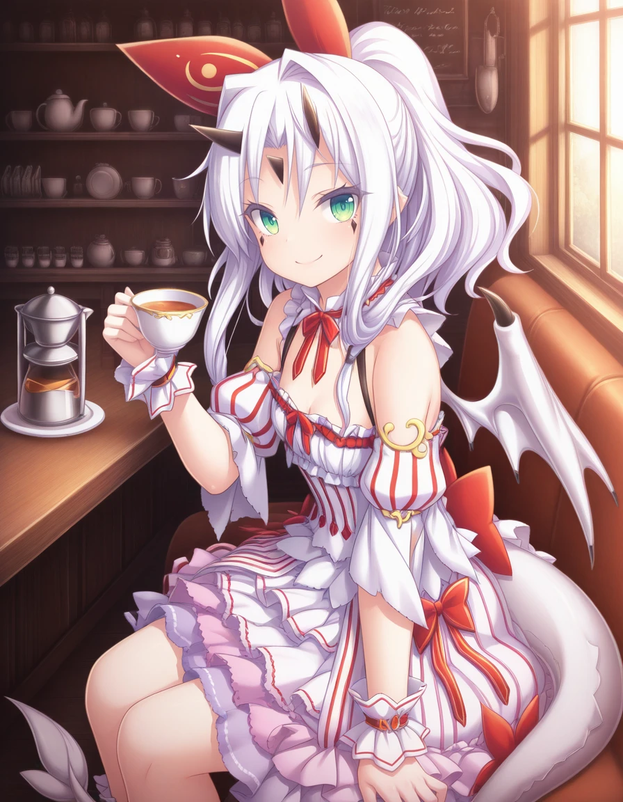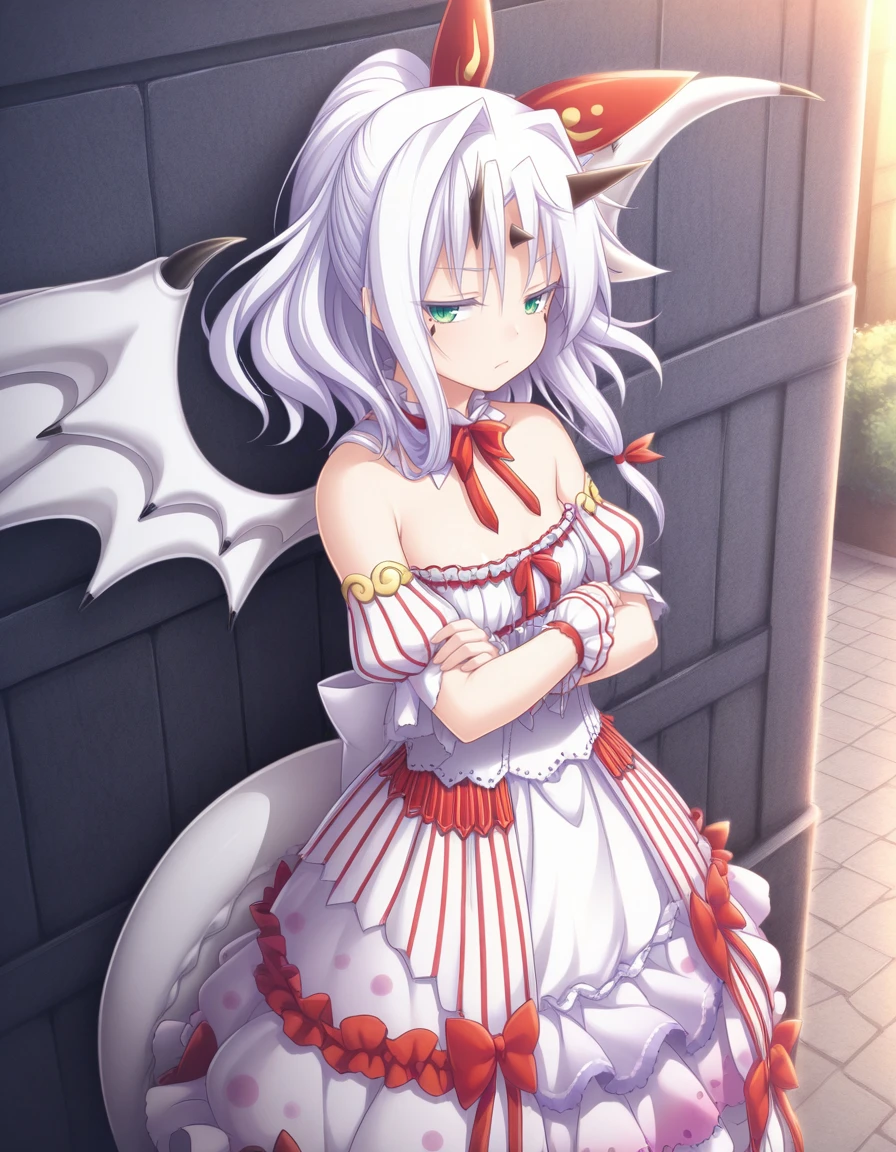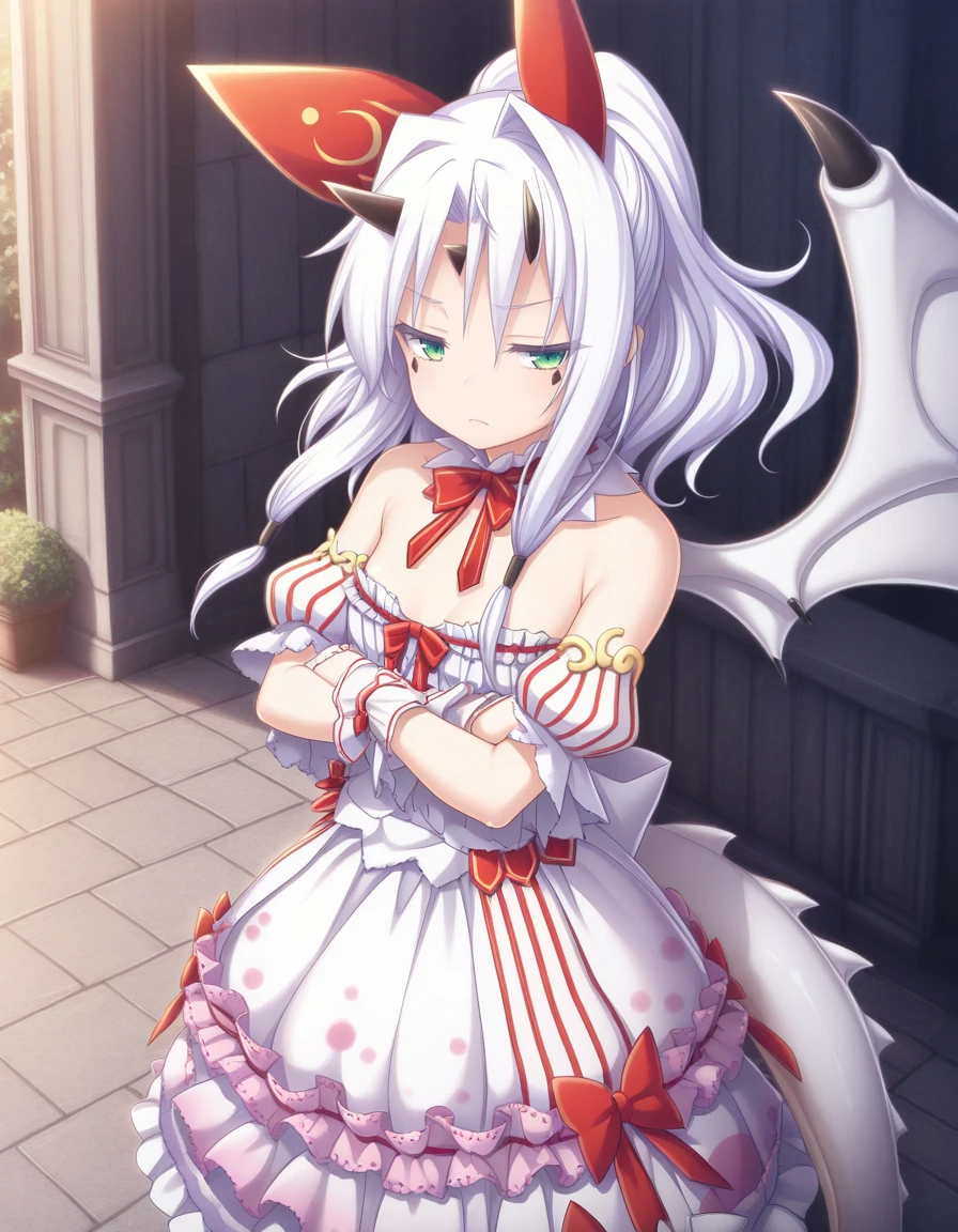 As usual, some prompts helps, like wings, white hair, horns, green eyes, tail, long hair, dragon girl, dragon tail, dress, wrist cuffs, and naturally the trigger word also helps.
