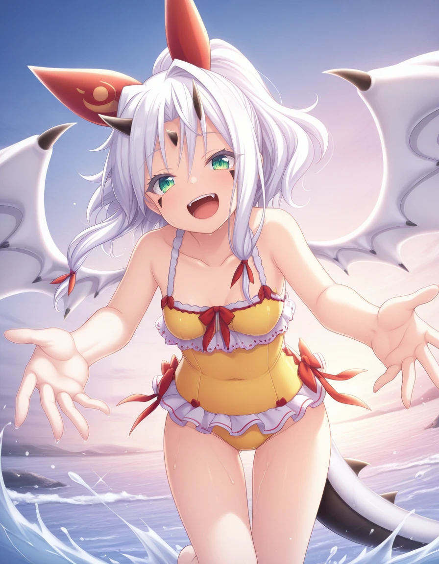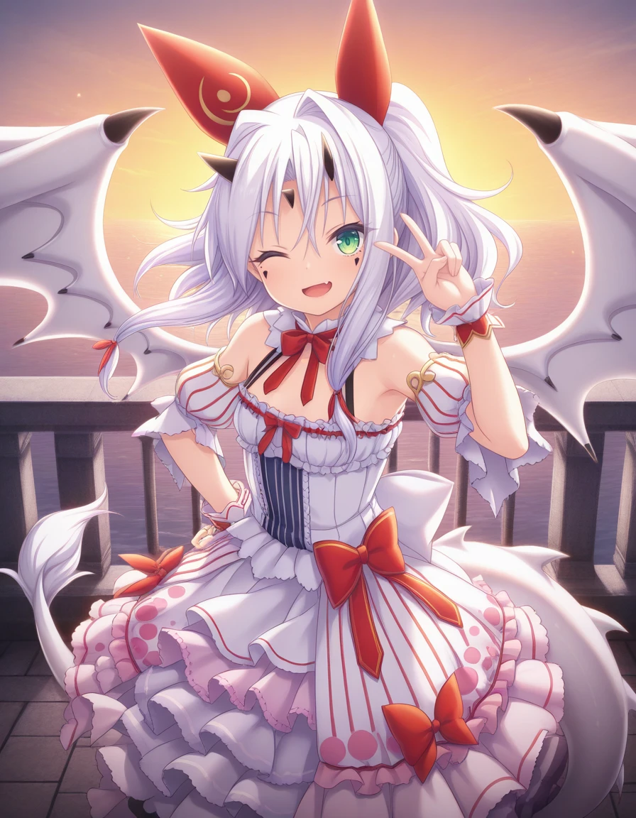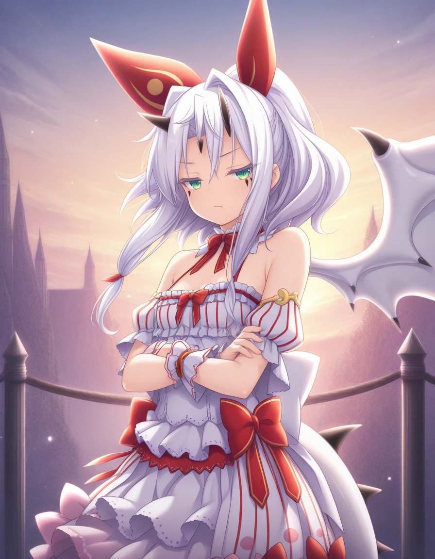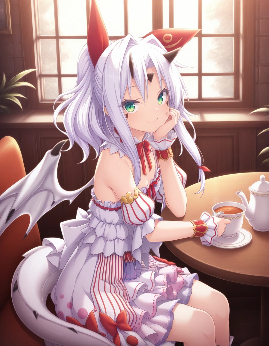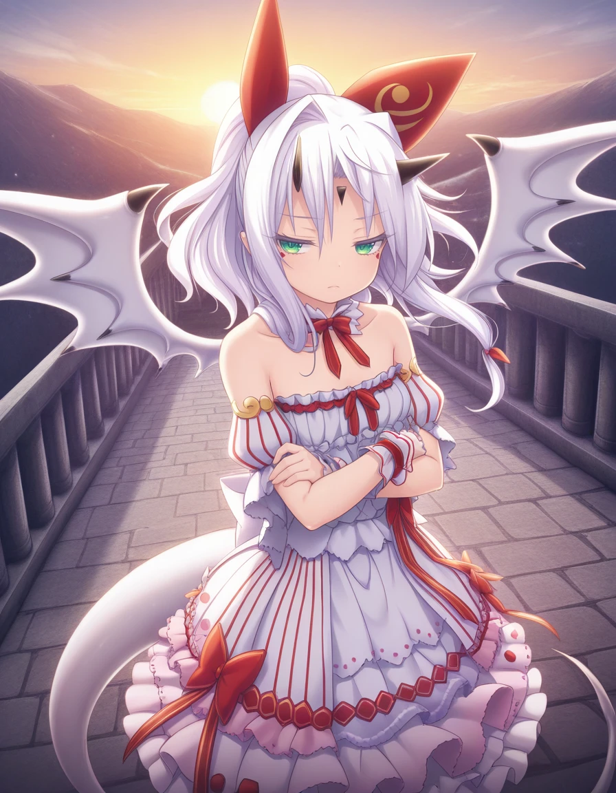 As usual, some prompts helps, like wings, white hair, horns, green eyes, tail, long hair, dragon girl, dragon tail, dress, wrist cuffs, and naturally the trigger word also helps.