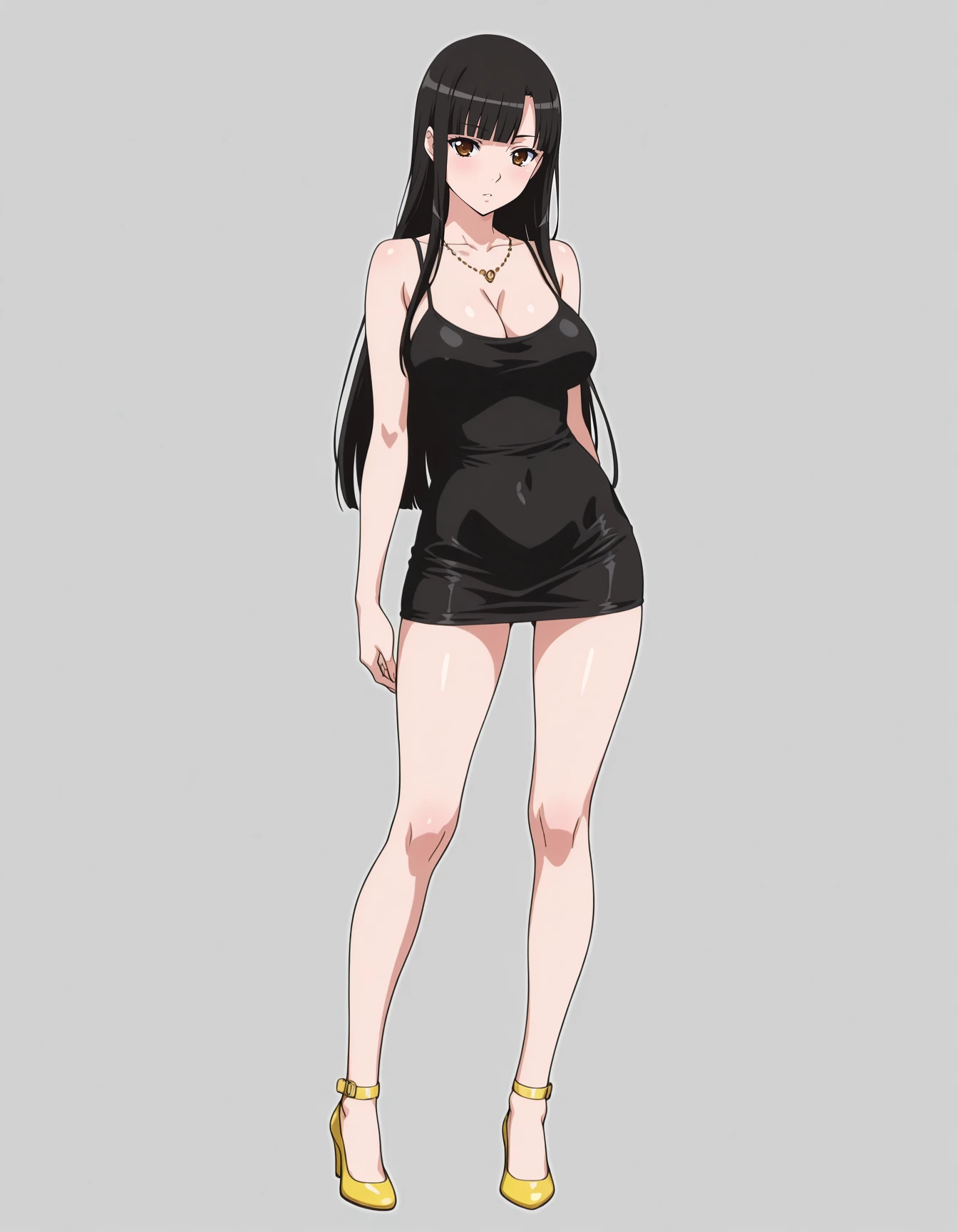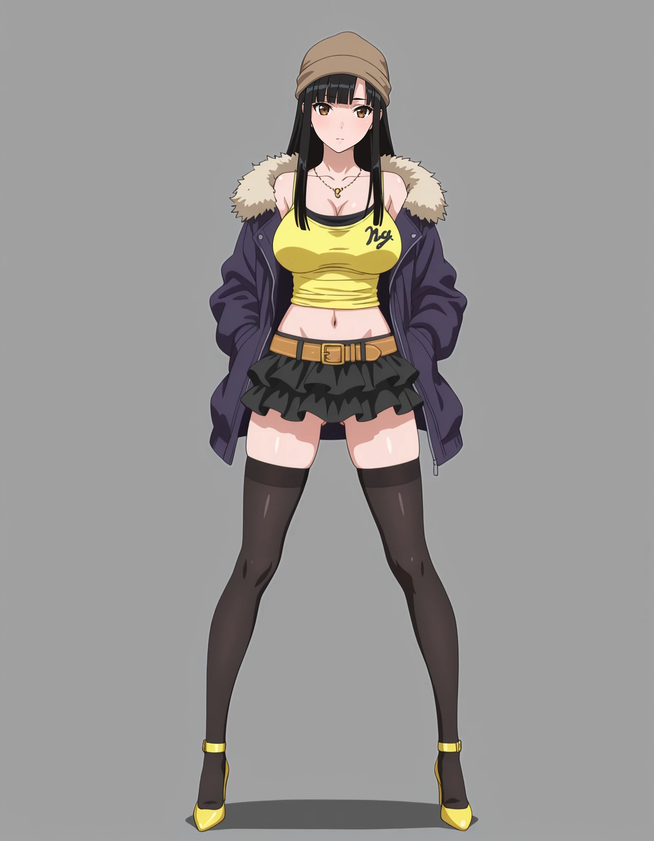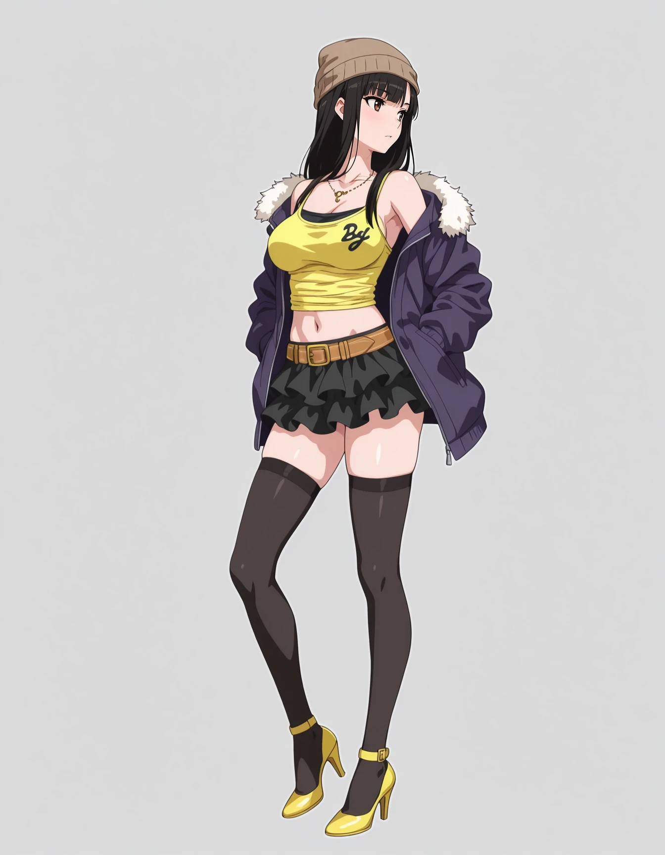 mai_kurobane_mizutsu,long_hair,black_hair,brown_eyes,hat,dark_purple_jacket,fur_trim,necklace,midriff,tank_top,belt,layered_skirt,thighhighs,yellow_high_heels,ankle_strapRecommend preferred Strength: 0.7~1.