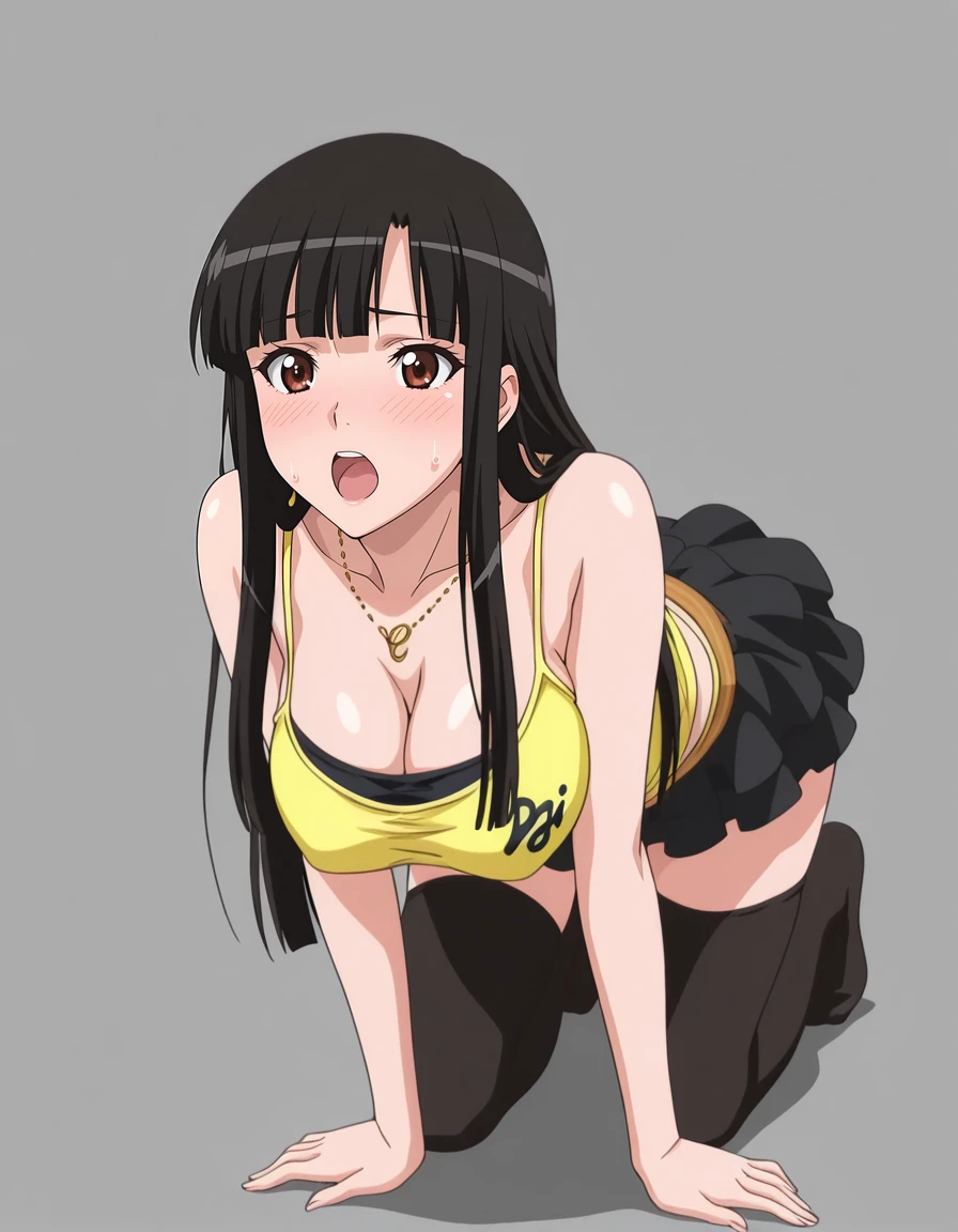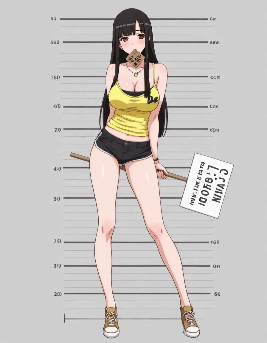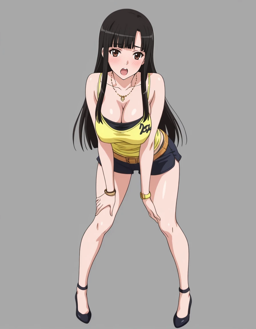 mai_kurobane_mizutsu,long_hair,black_hair,brown_eyes,hat,dark_purple_jacket,fur_trim,necklace,midriff,tank_top,belt,layered_skirt,thighhighs,yellow_high_heels,ankle_strapRecommend preferred Strength: 0.7~1.
