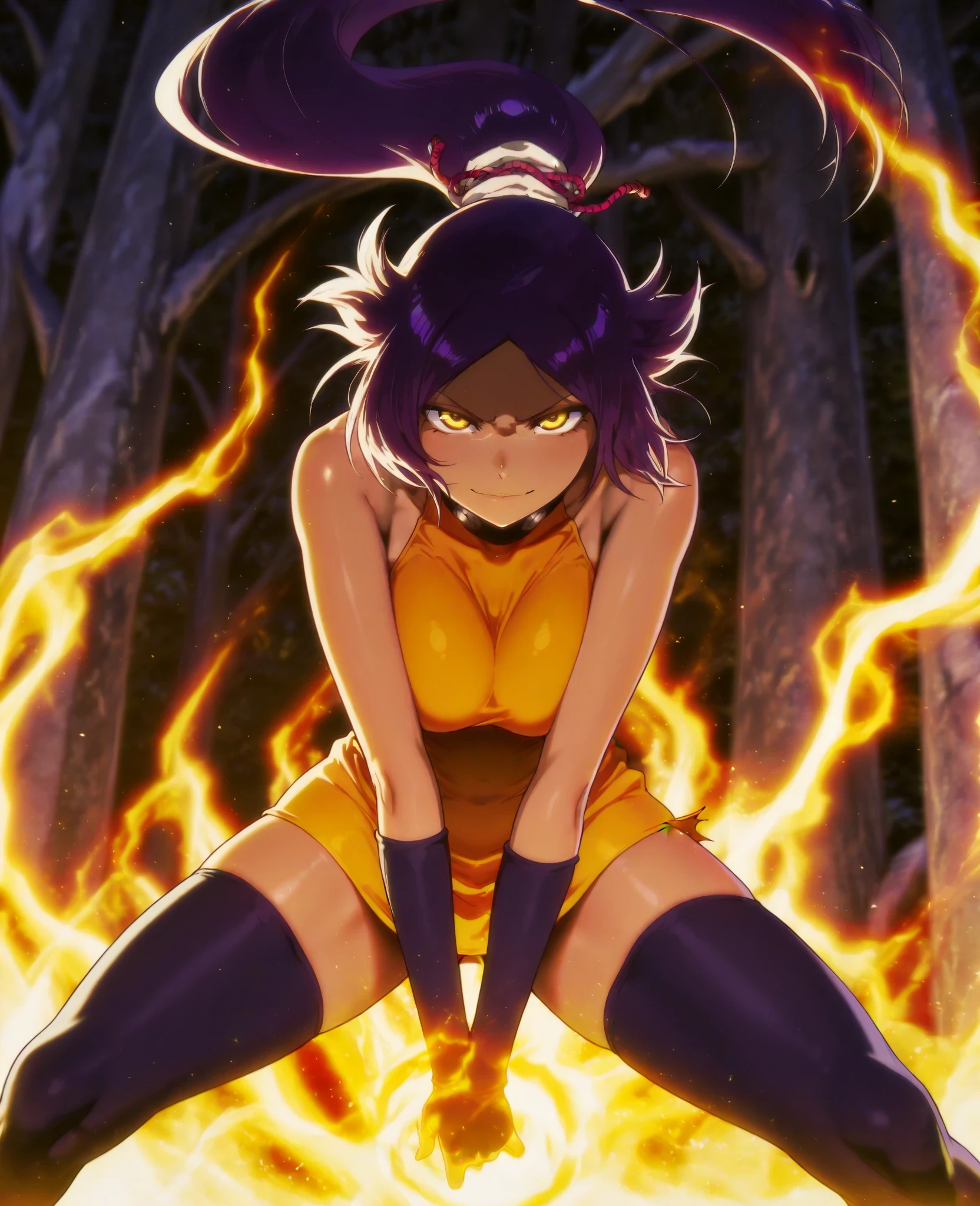 Appearance: Y0ruTYBW, 1girl, dark-skinned female, purple hair, long hair, ponytail, yellow eyes