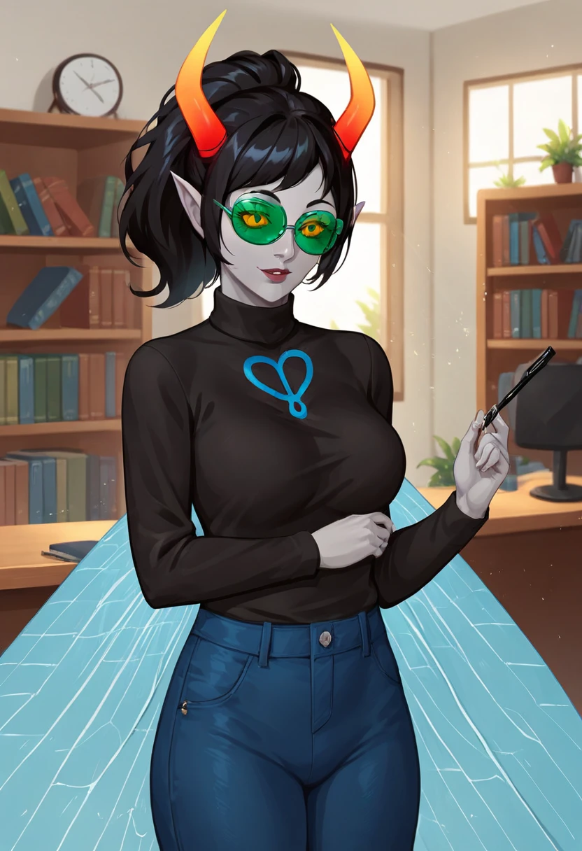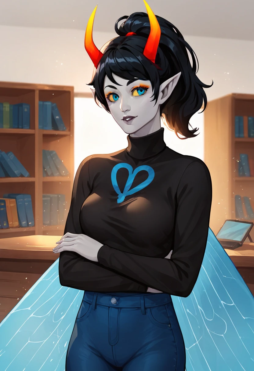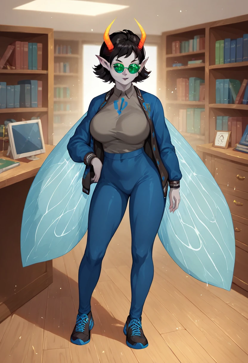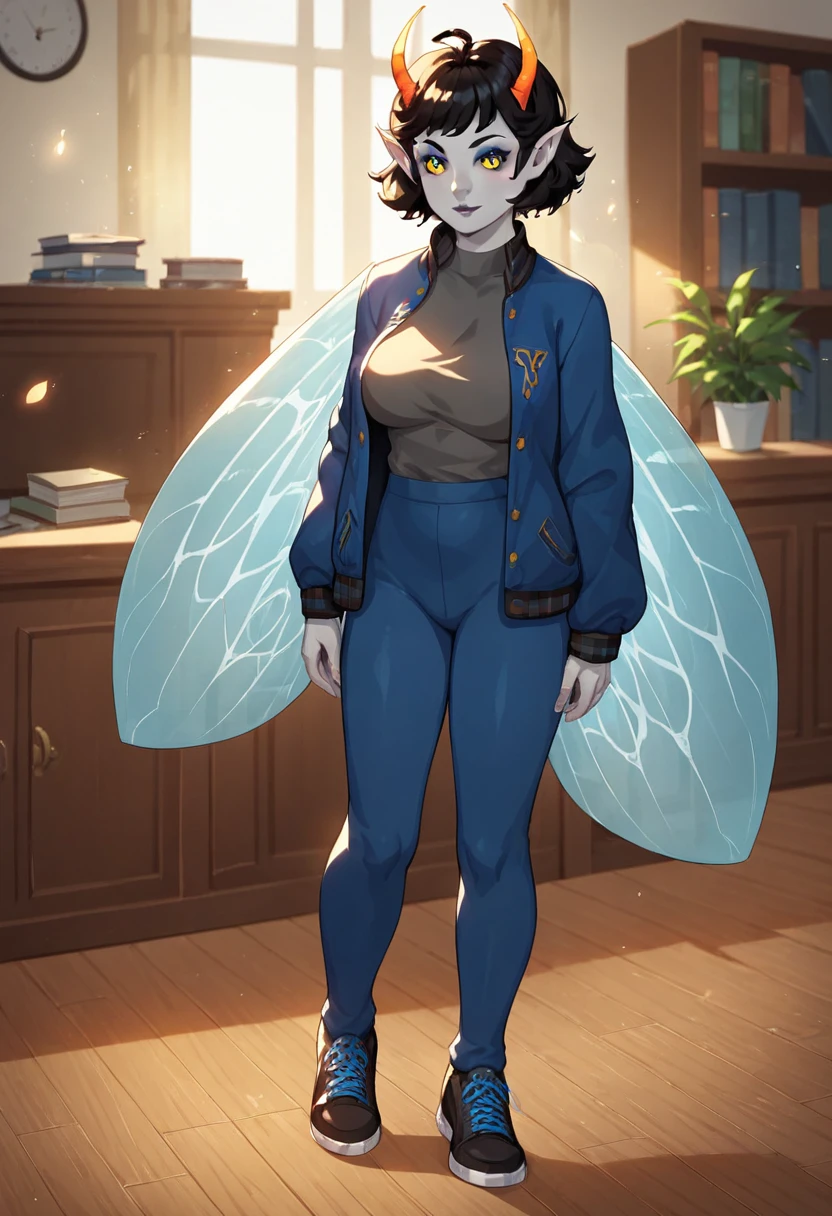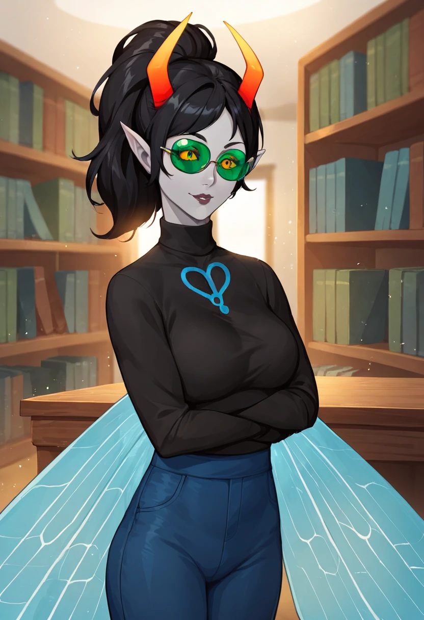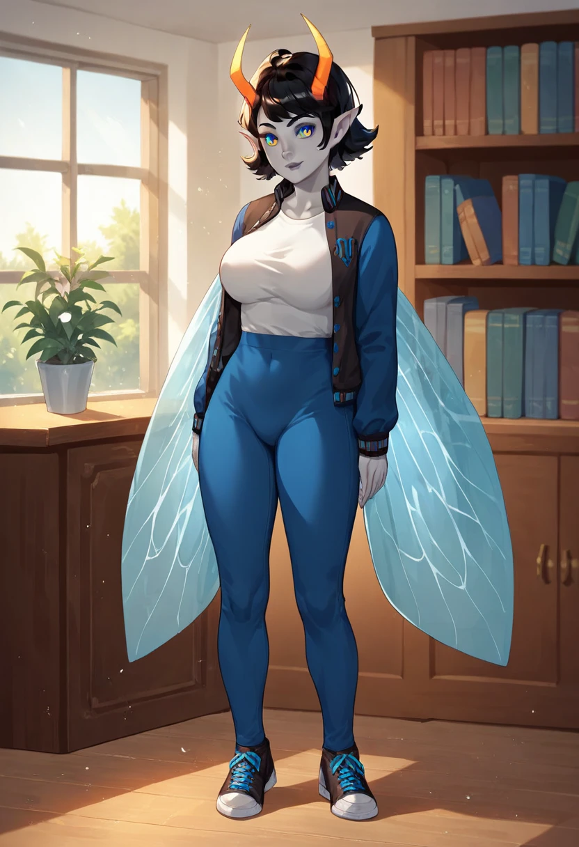 Secondary tags: black hair, horns, antennae horns, pointy ears, makeup, coloured skin, grey skin, coloured sclera, yellow sclera, blue eyes, insect wings.