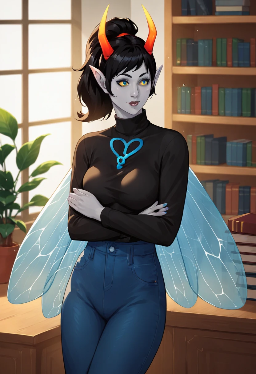 black hair, horns, antennae horns, pointy ears, makeup, coloured skin, grey skin, coloured sclera, yellow sclera, blue eyes, insect wings