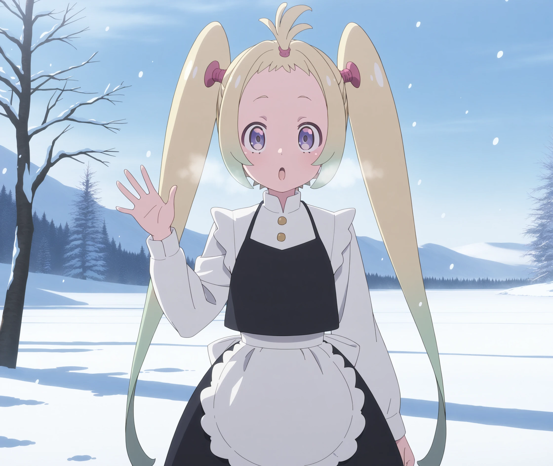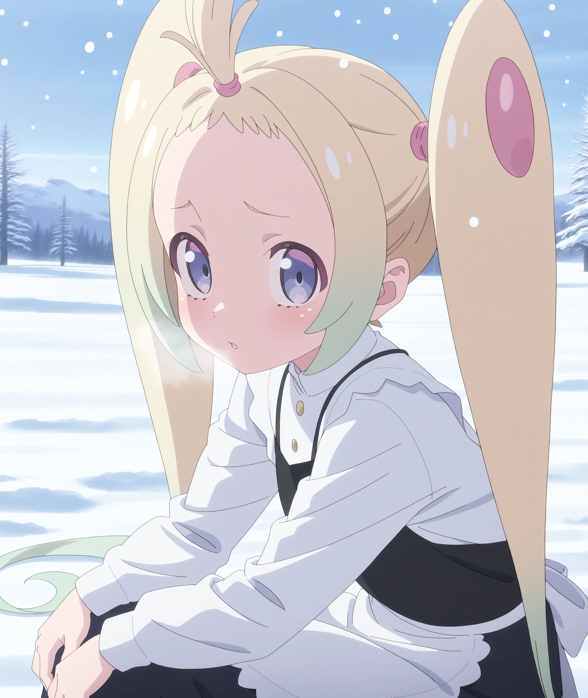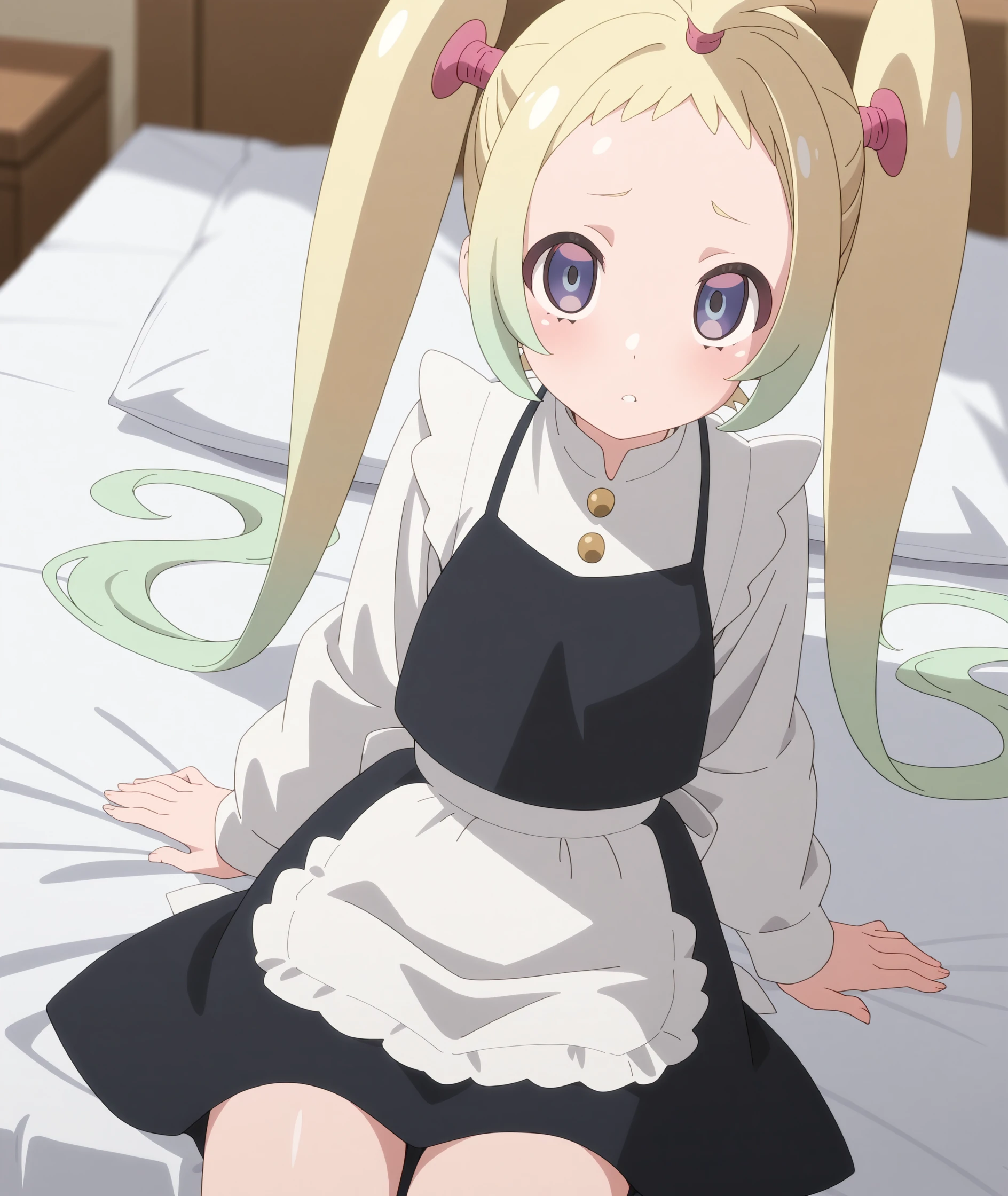 • eyelashes, long hair, blue eyes, blonde hair, twintails, purple eyes, multicolored hair, forehead