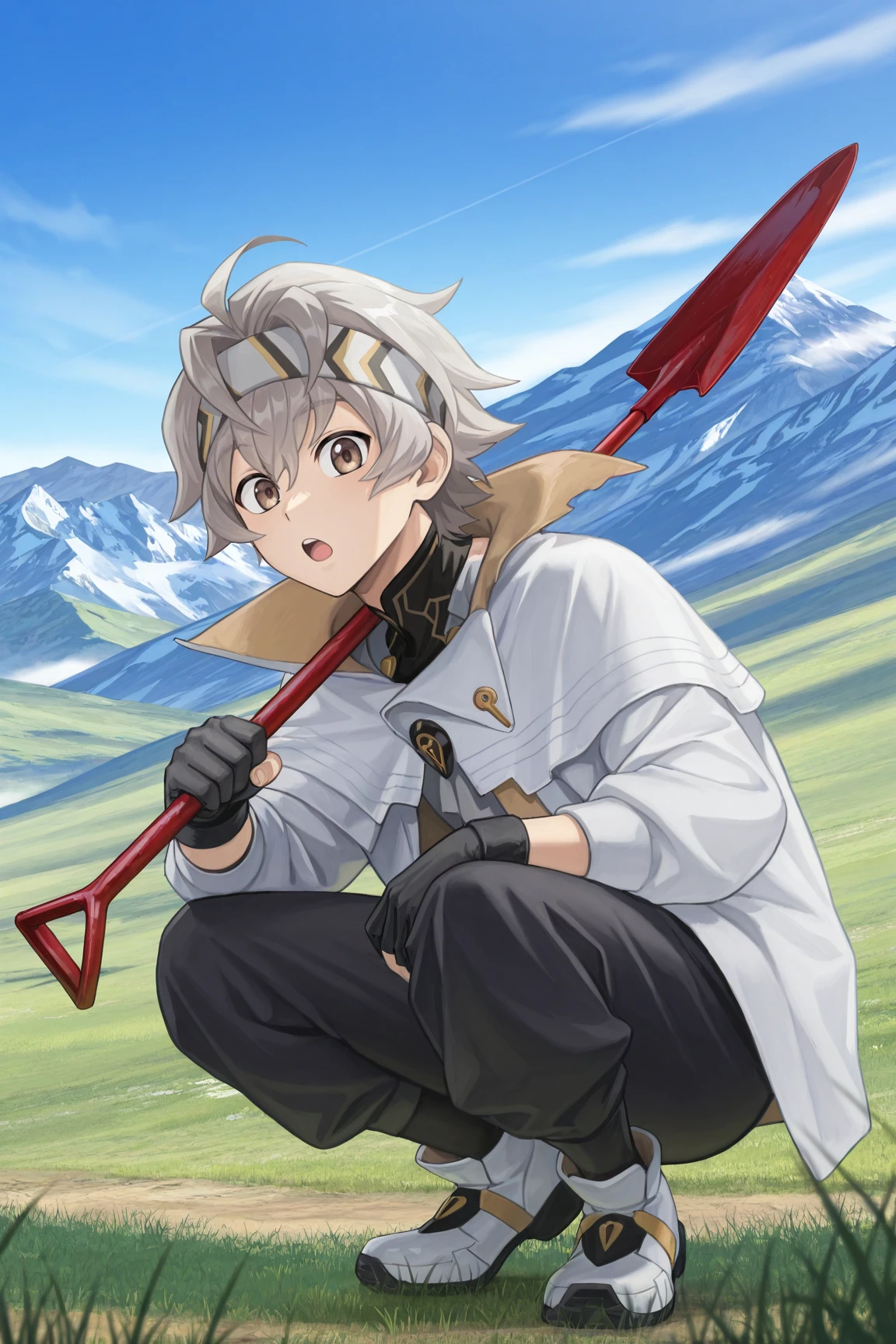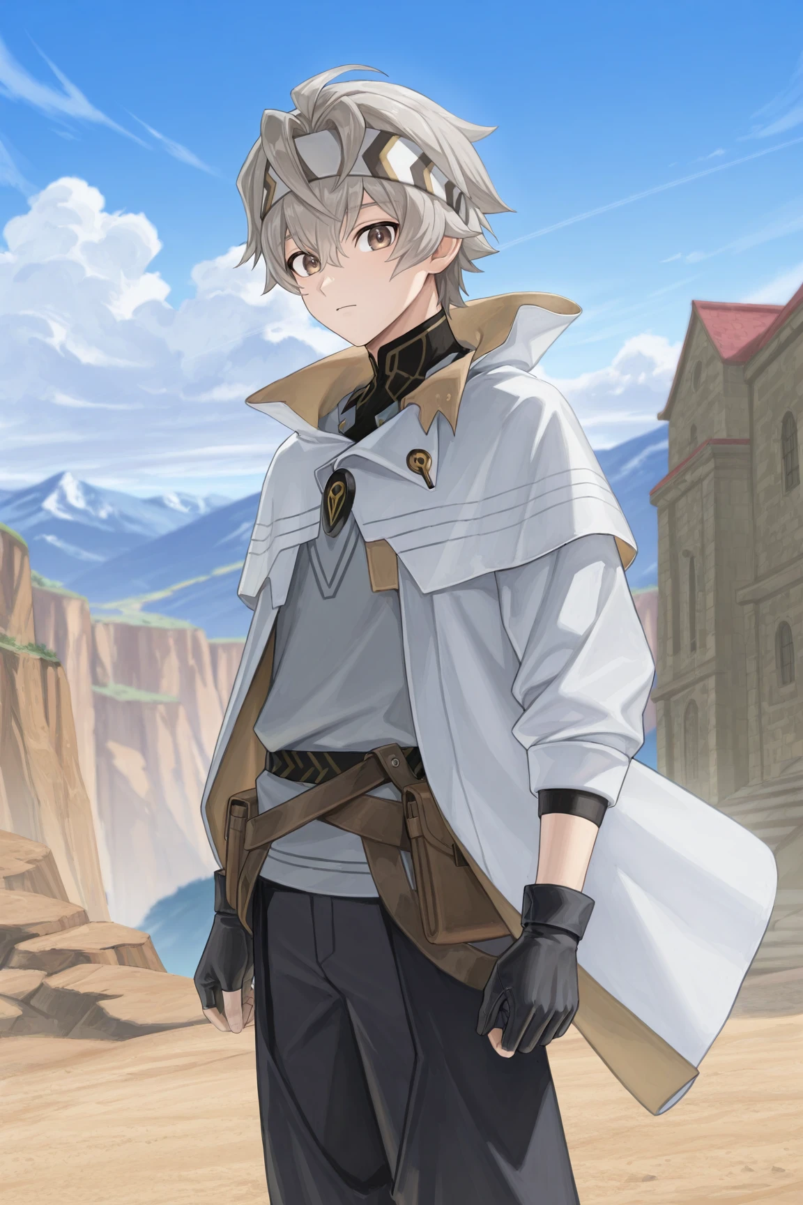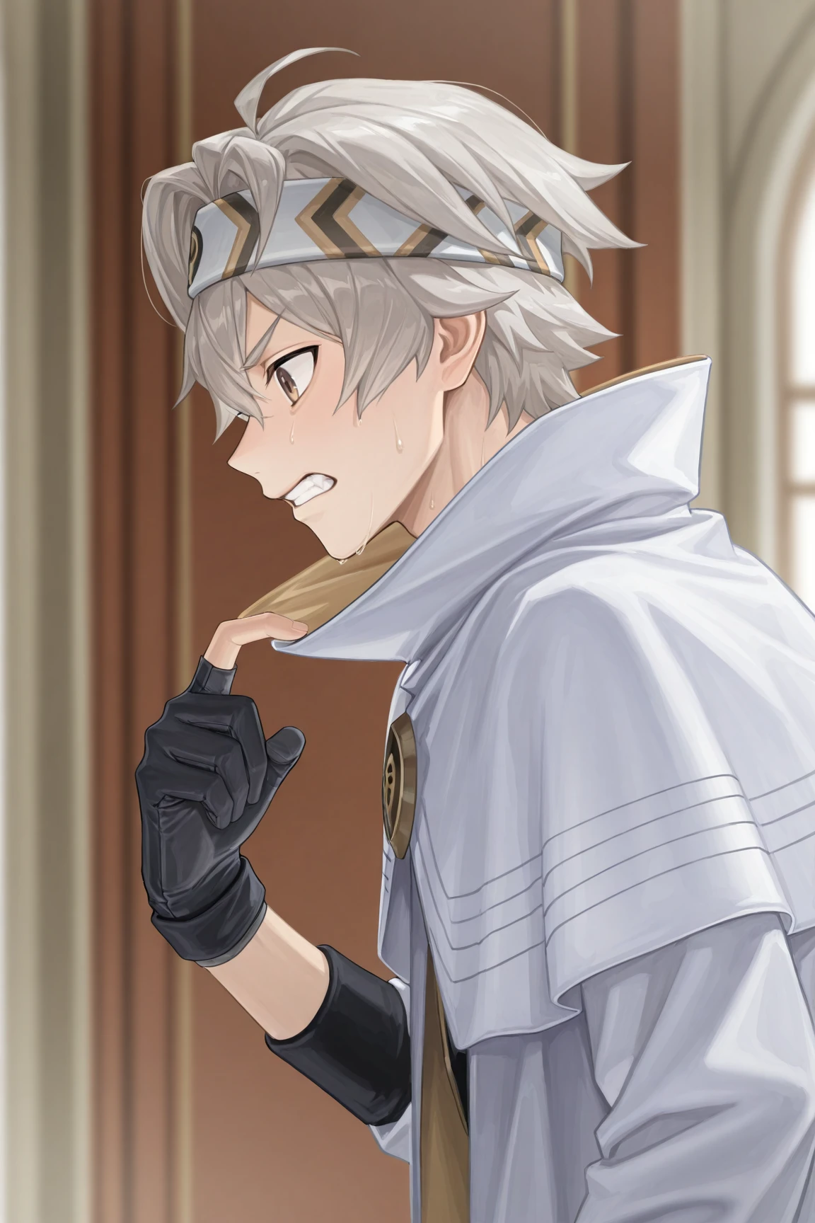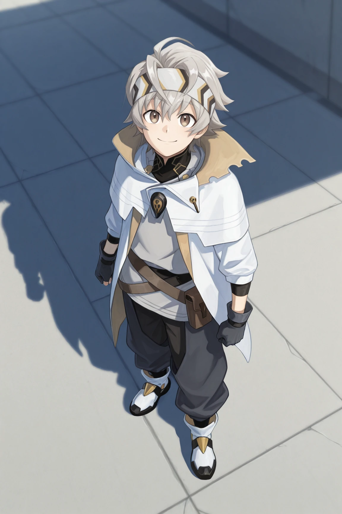 -striped headband, white coat, grey shirt, black partially fingerless gloves, black pants, white shoes, black turtleneck