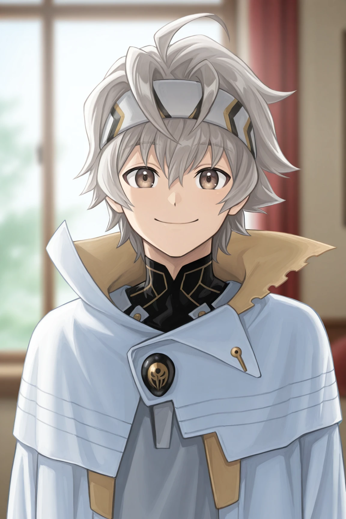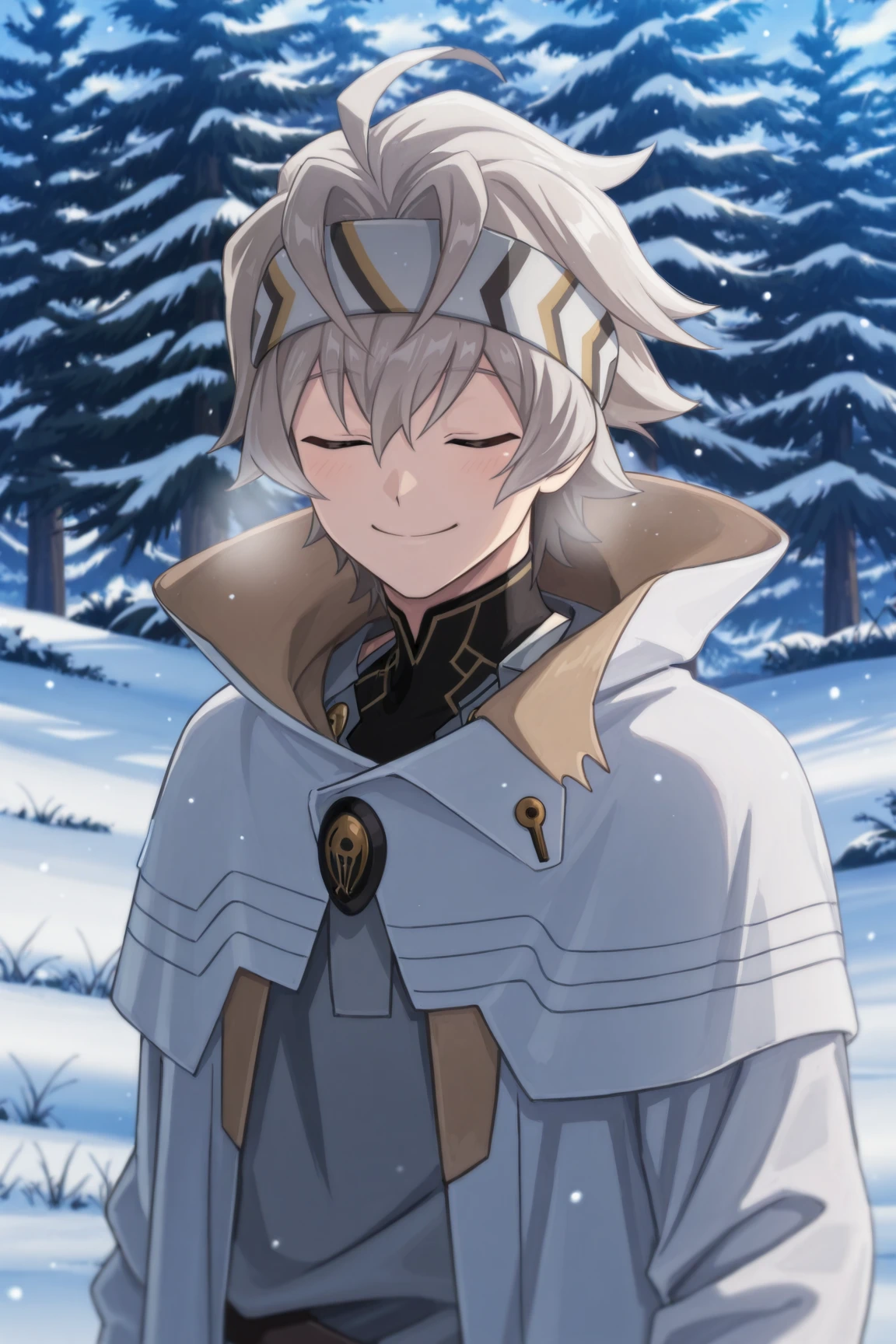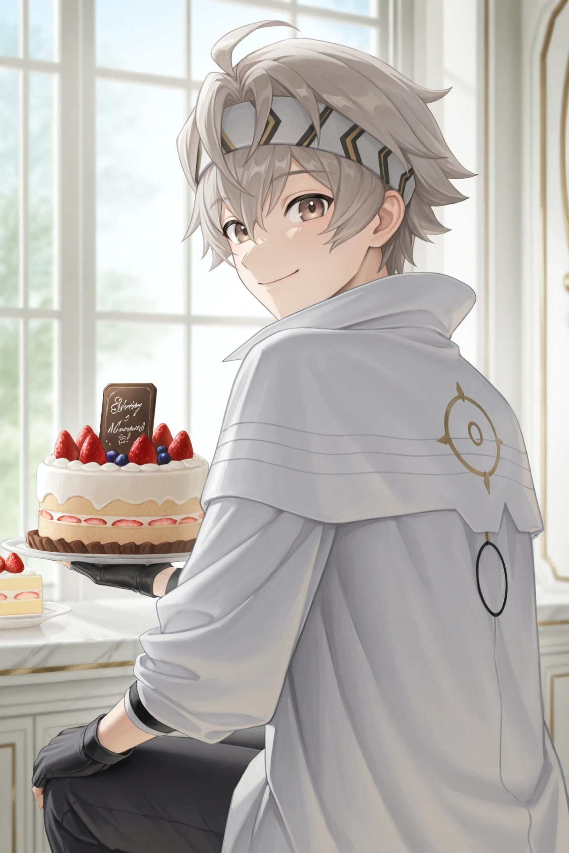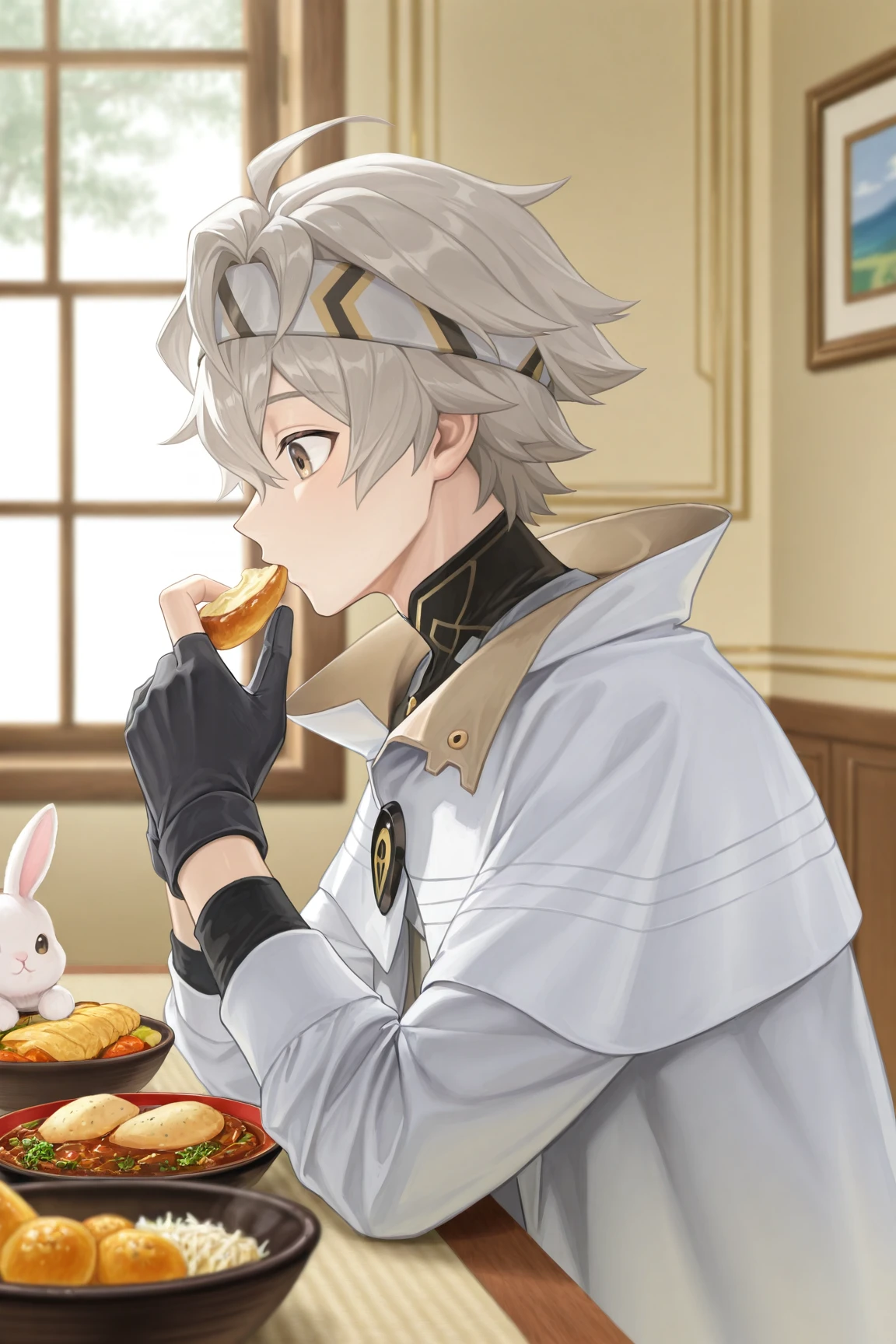 -striped headband, white coat, grey shirt, black partially fingerless gloves, black pants, white shoes, black turtleneck