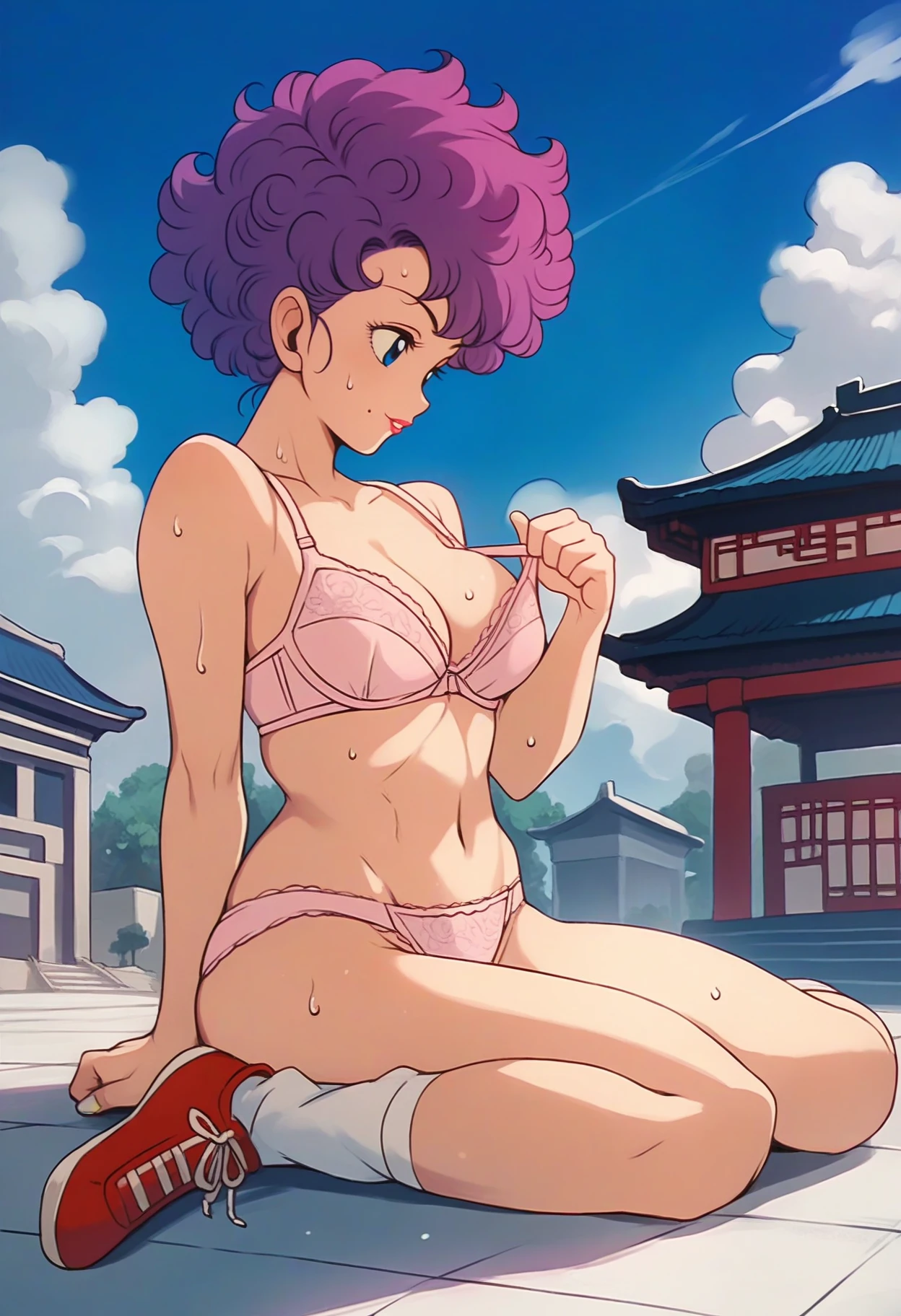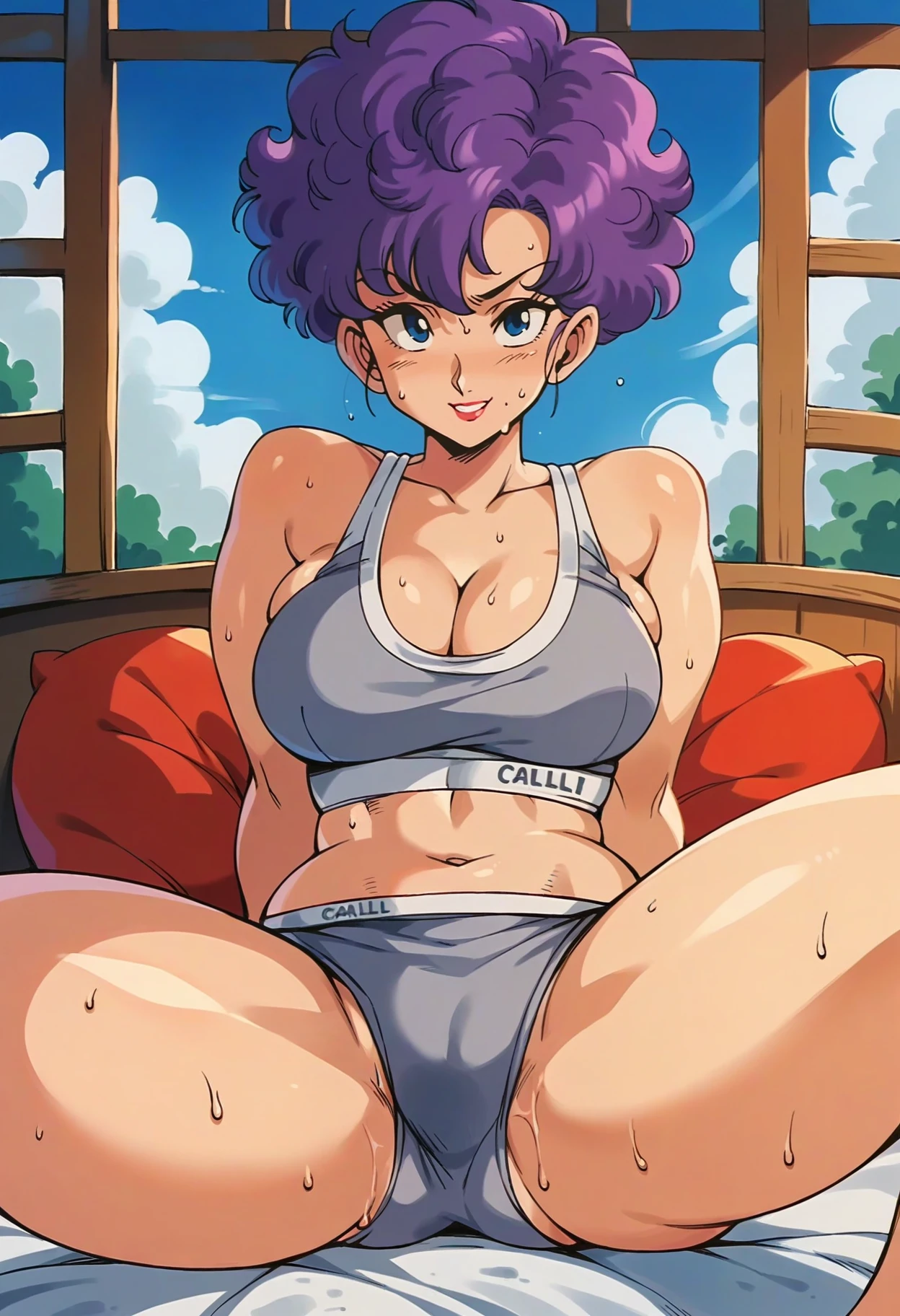 DBExtraGirl04Ranfan, purple hair, curly hair, blue eyes, lipstick, mole under mouth, large breasts, eyelashes,