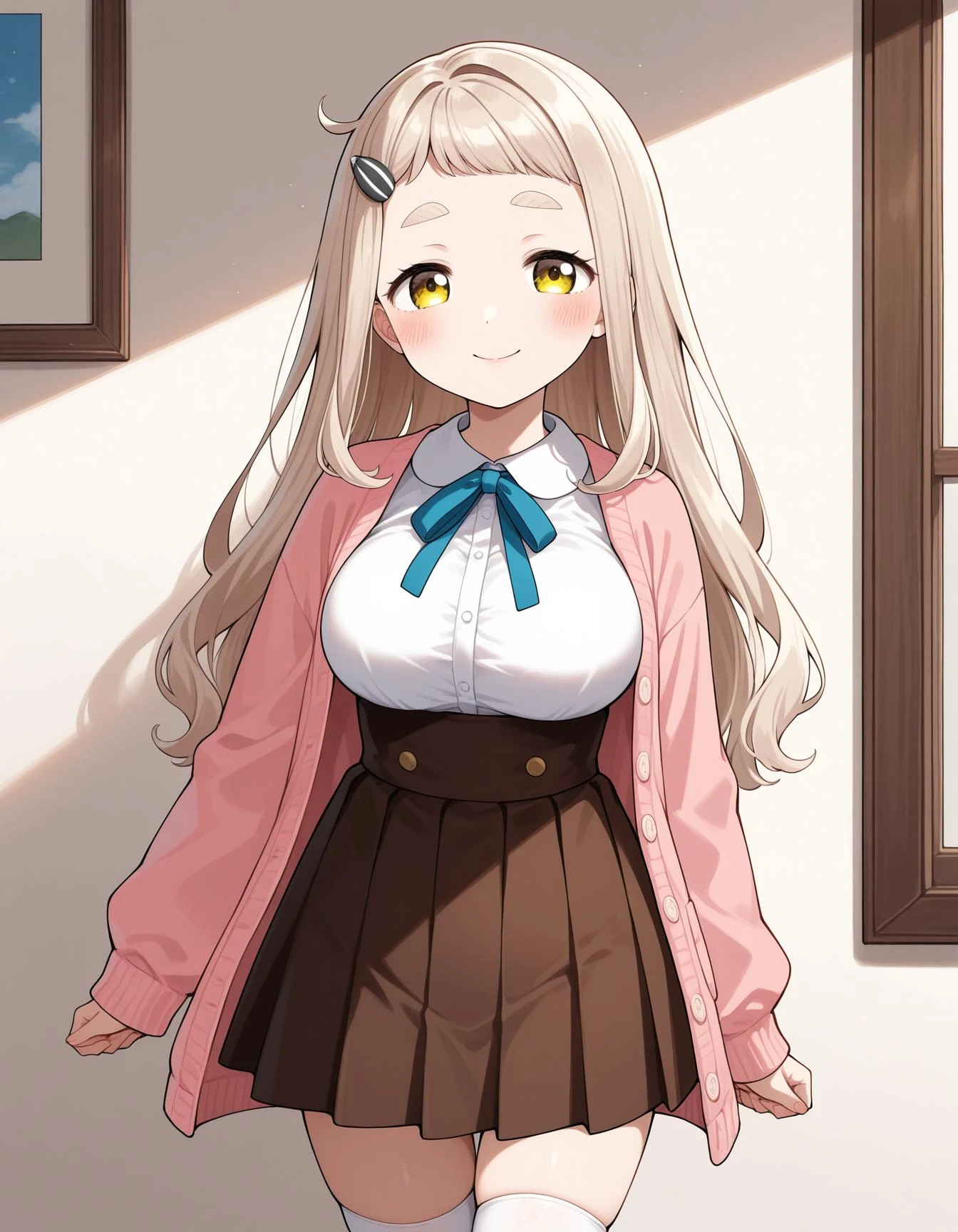 nijichima,large breasts,yellow eyes,drooping eyes,short eyebrows,light-brown hair,round face,disproportionate breasts,short stature,aged down,long hair,short bangs,hairclip,