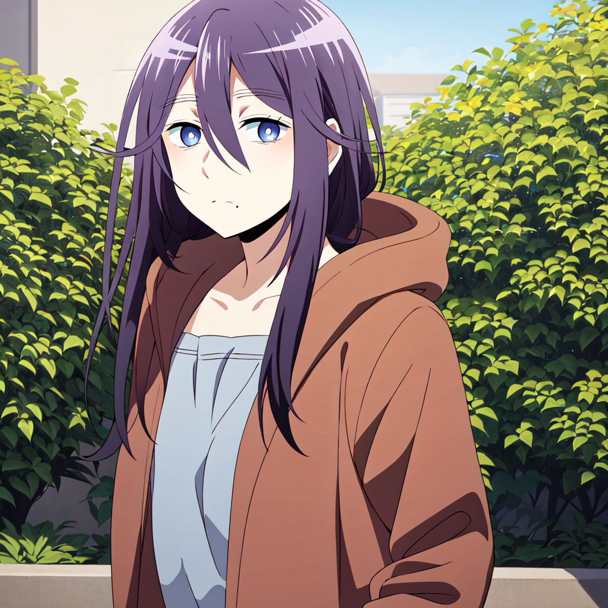 blue eyes, purple hair, mole, mole under mouth, long hair, hair between eyes