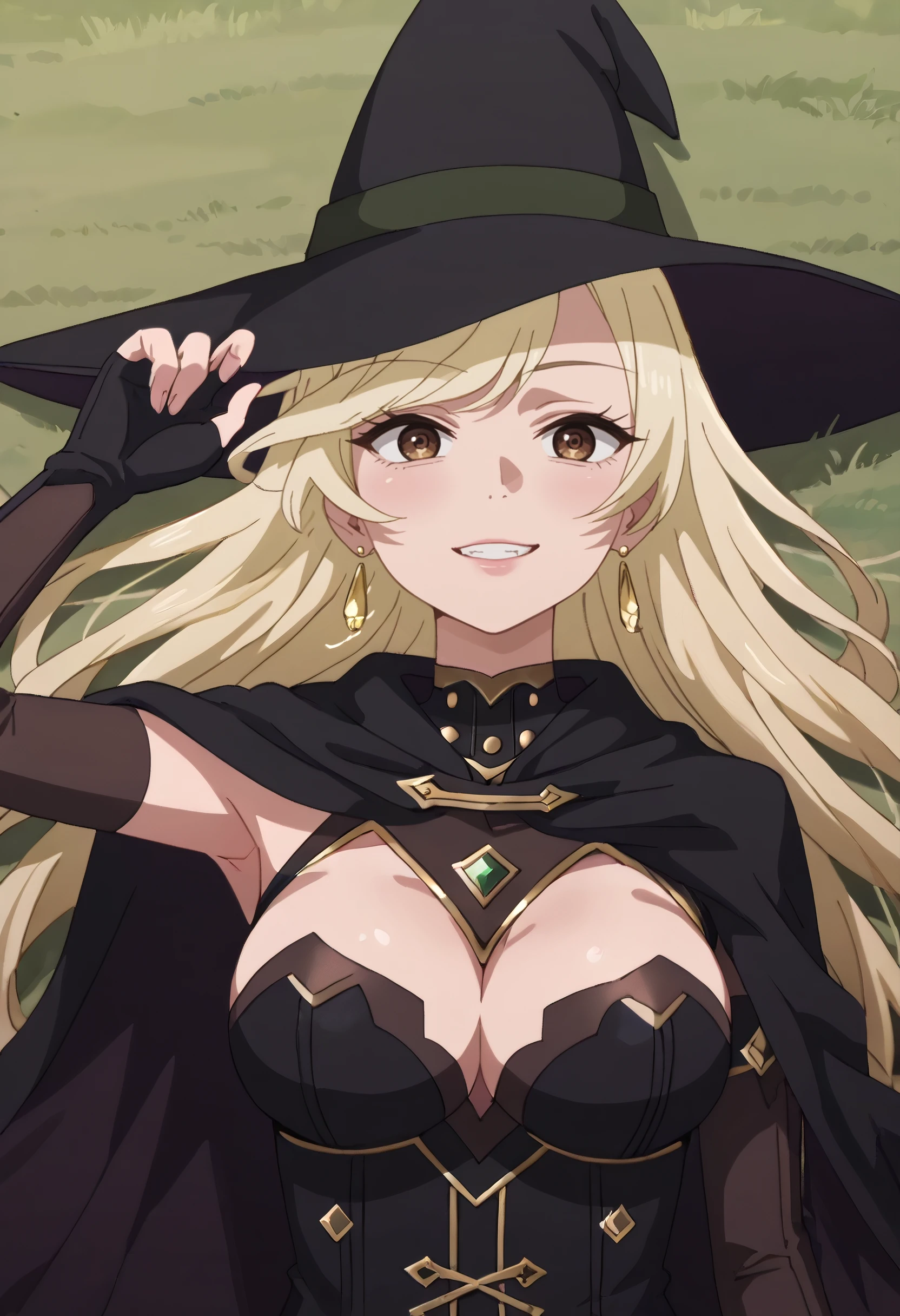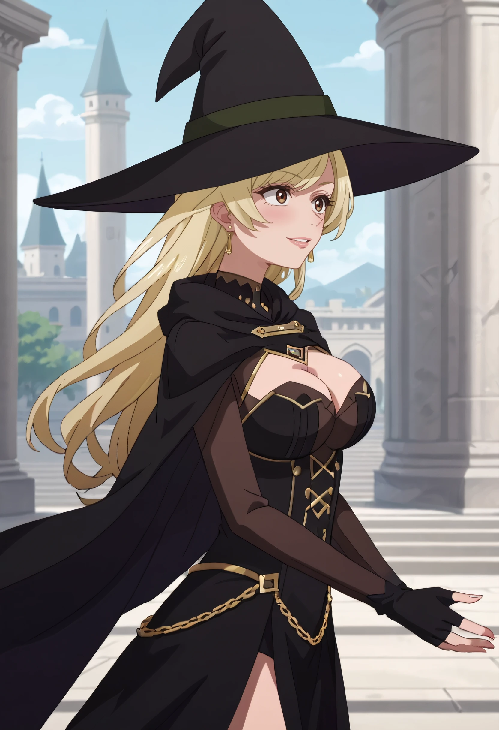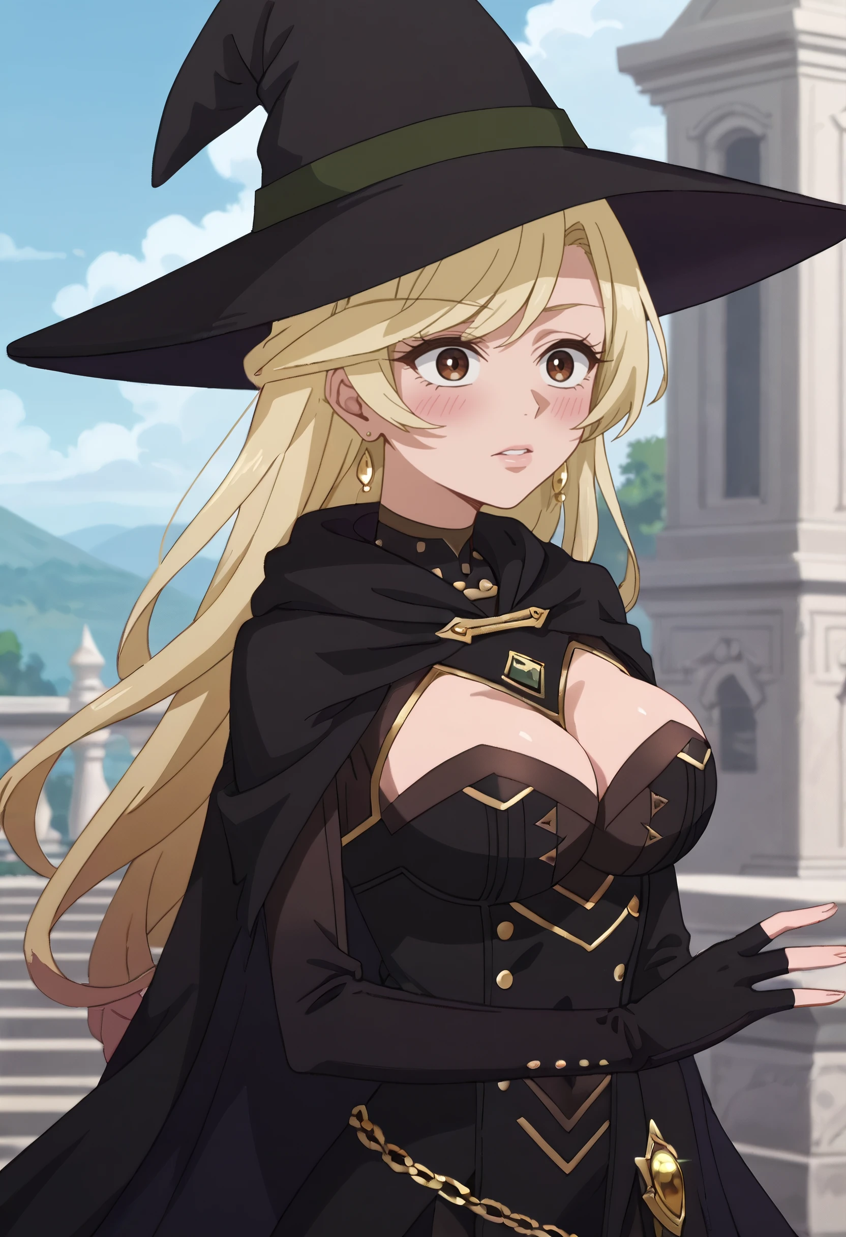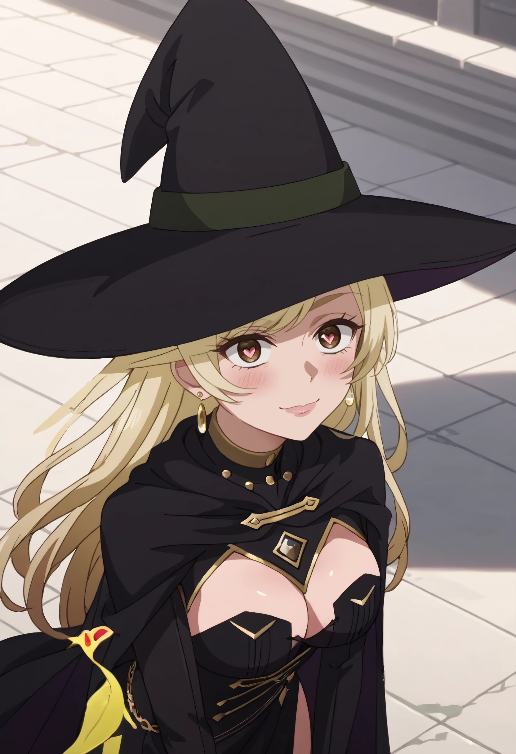 hat, witch hat, cape, gloves, witch, cleavage, black headwear, fingerless gloves, black gloves, dress, black dress, black cape, heart earrings, long sleeves,