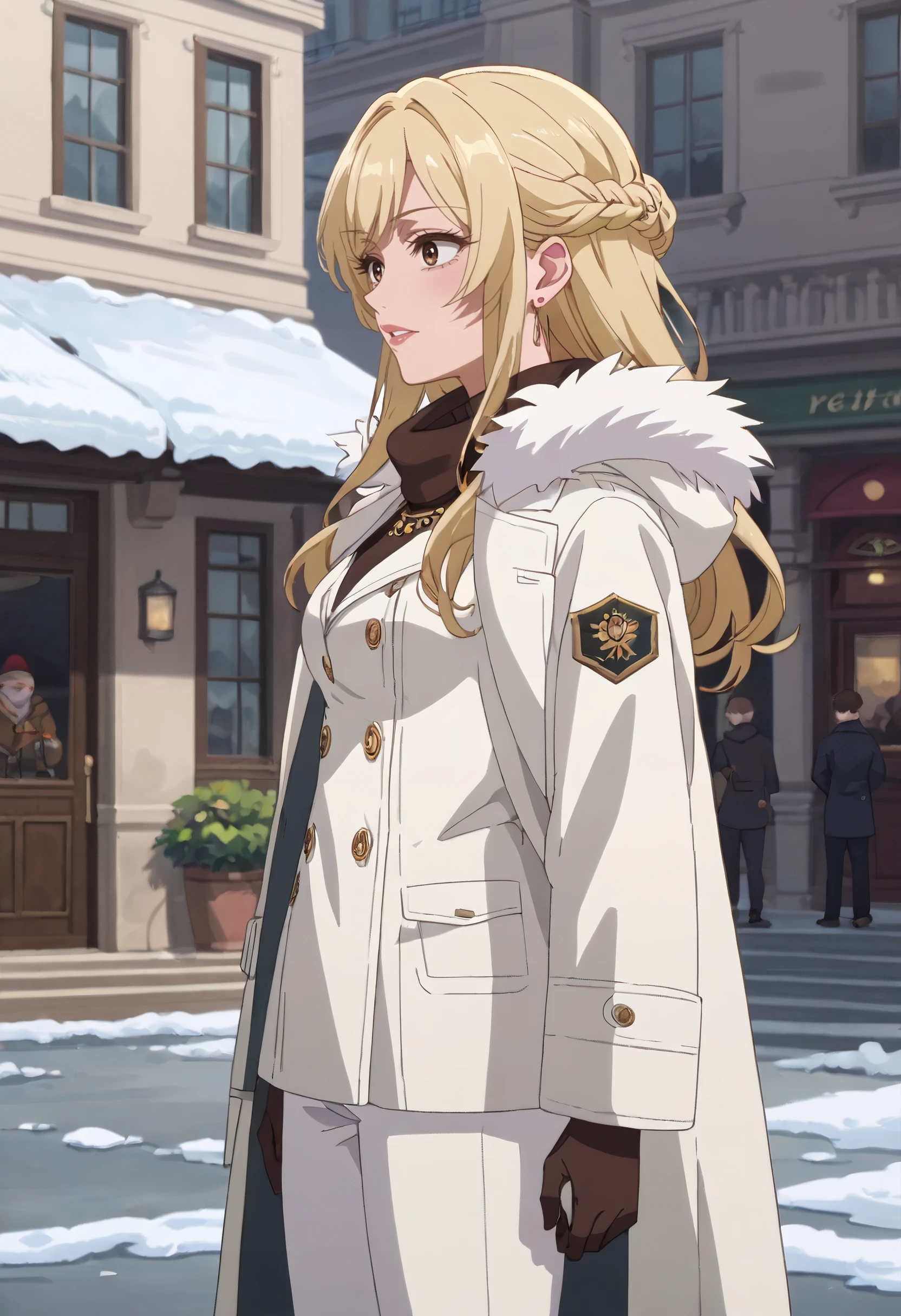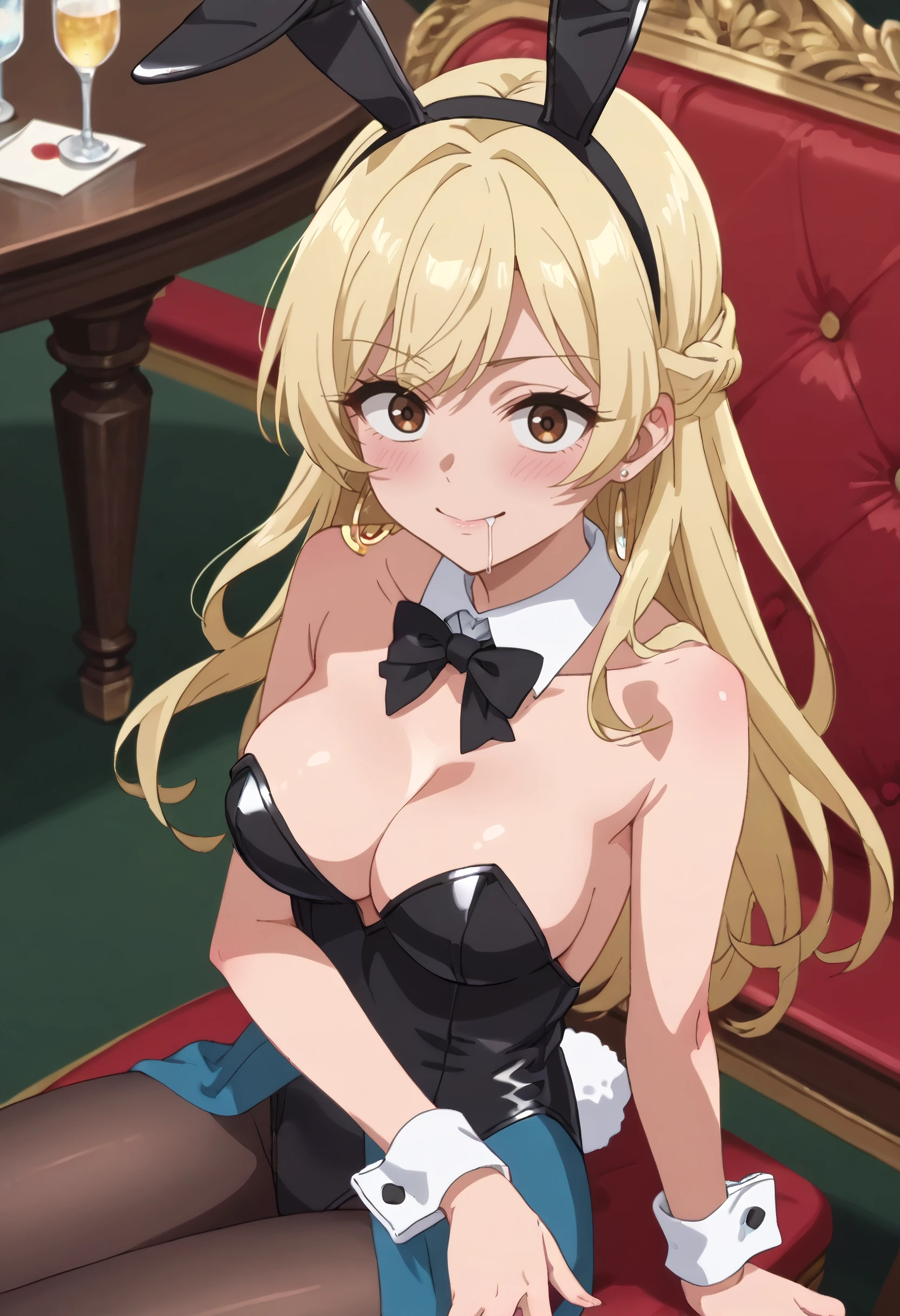 A4OMelissa, blonde hair, long hair, brown eyes, eyebrows visible through hair, bangs, earrings, jewelry,