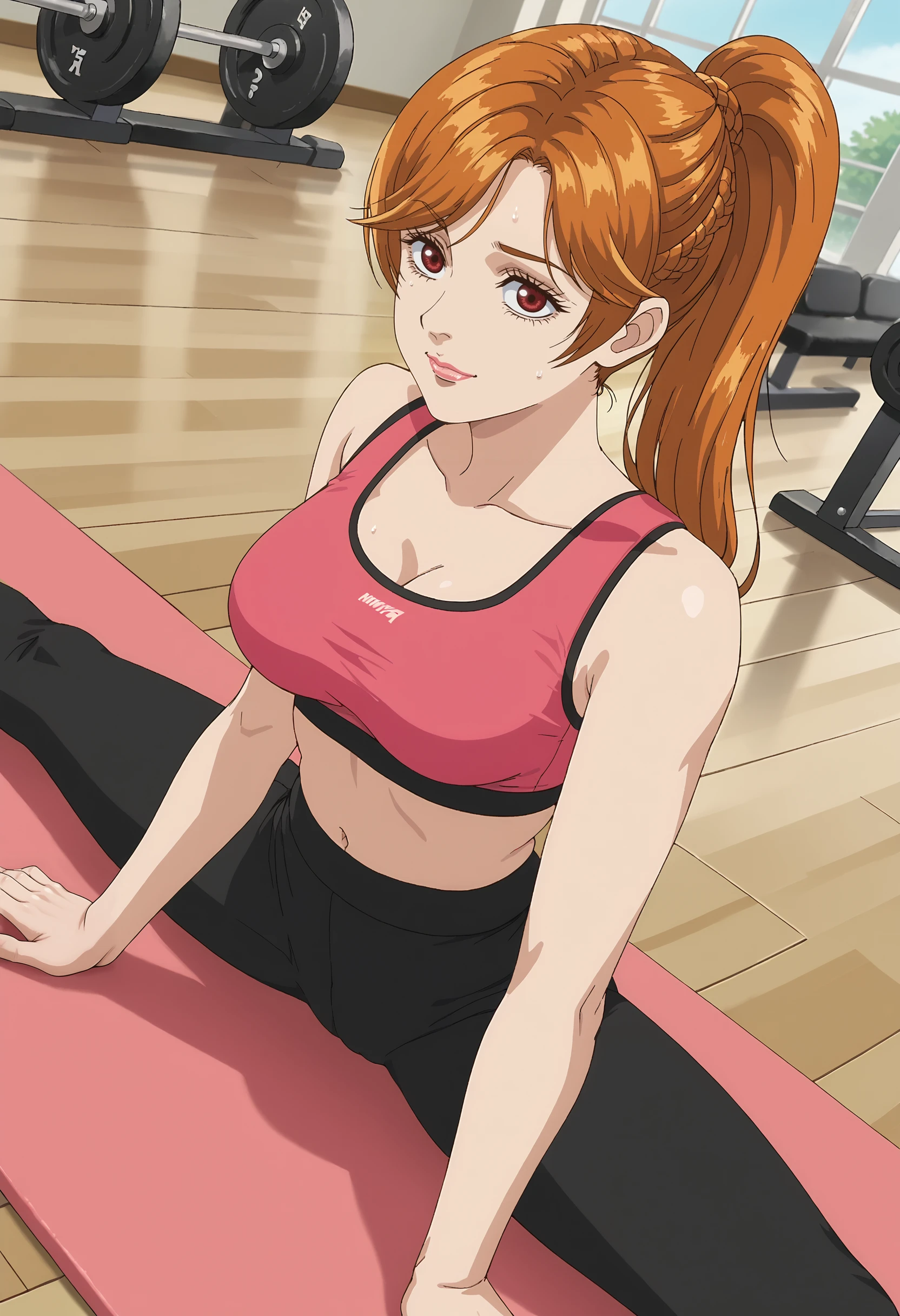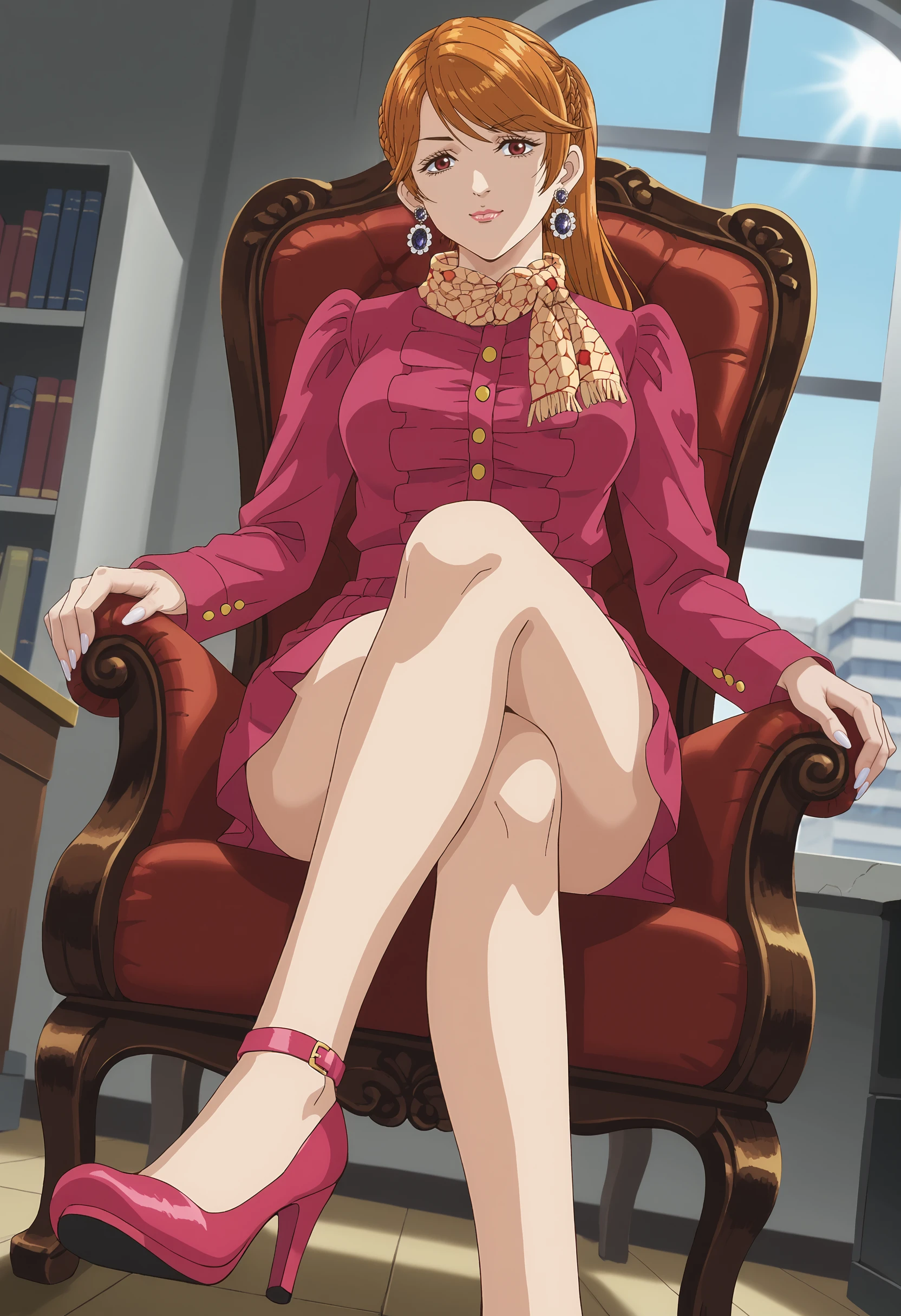 TrillionKirihime, long hair, orange hair, swept bangs, braid, red eyes, ponytail, lipstick, nail polish — Removing the ponytail tag gives you her alternate hairstyle from the show, I also left lipstick and nail polish as "appearance" as she's never seen without it on the show!