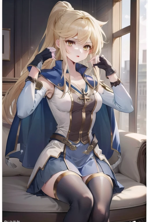Outfit: cap, blue cape, collared cape, dress, gloves, fingerless gloves, thighhighs, skirt, blue skirt