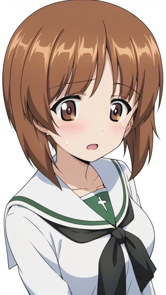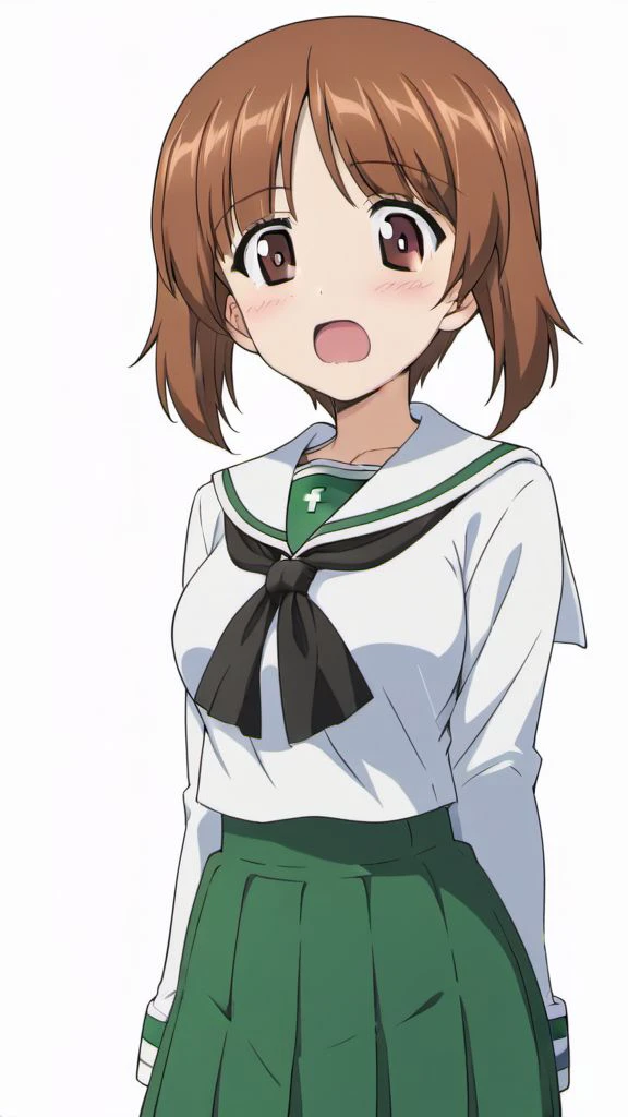 1girl, , nishizumi miho, girls und panzer, brown eyes, brown hair, short hair, , breasts, neckerchief, school uniform, serafuku, shirt, skirt, black neckerchief, green skirt, long sleeves, ooarai school uniform,