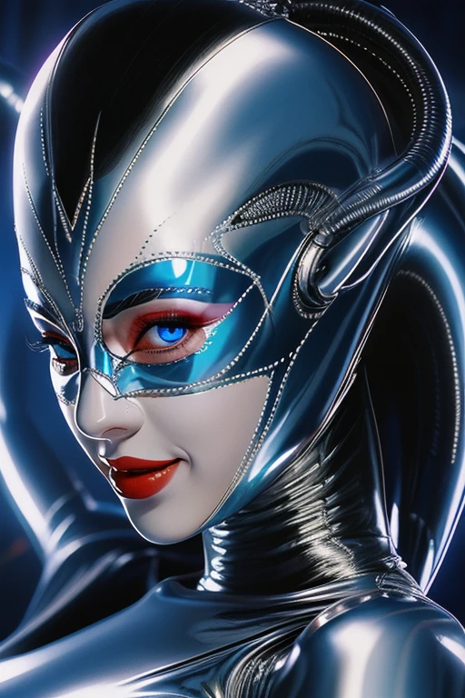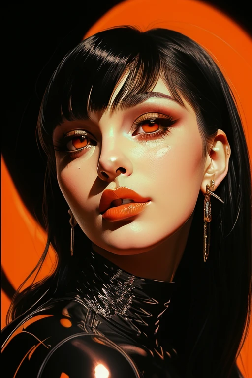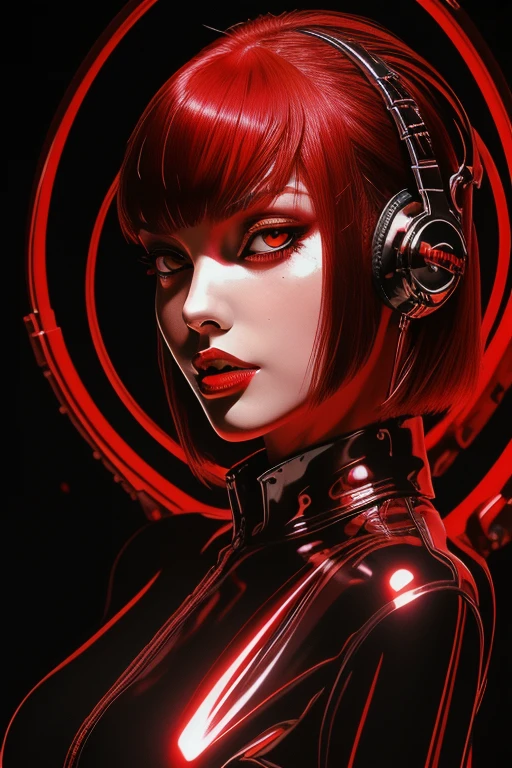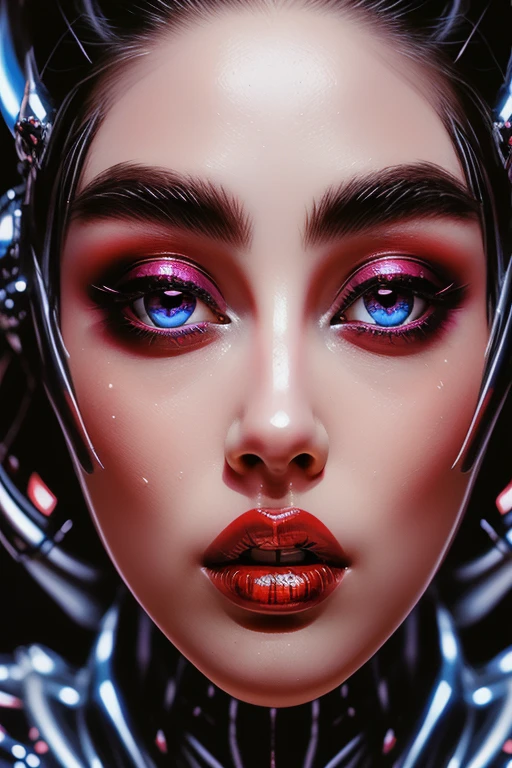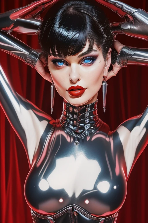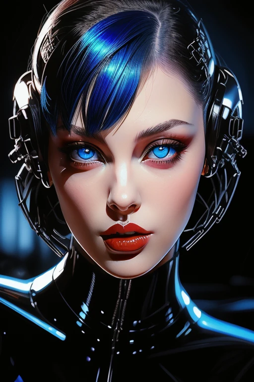 pinup art style, shiny, 1girl, solo, looking_at_viewer, short_hair, blue_eyes, black_hair, multicolored_hair, parted_lips, lips, makeup, lipstick, portrait, red_background, close-up, red_lips