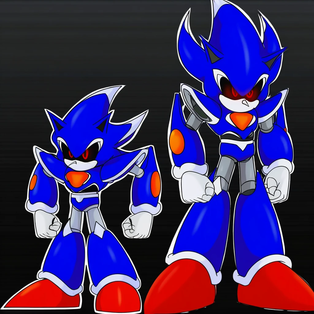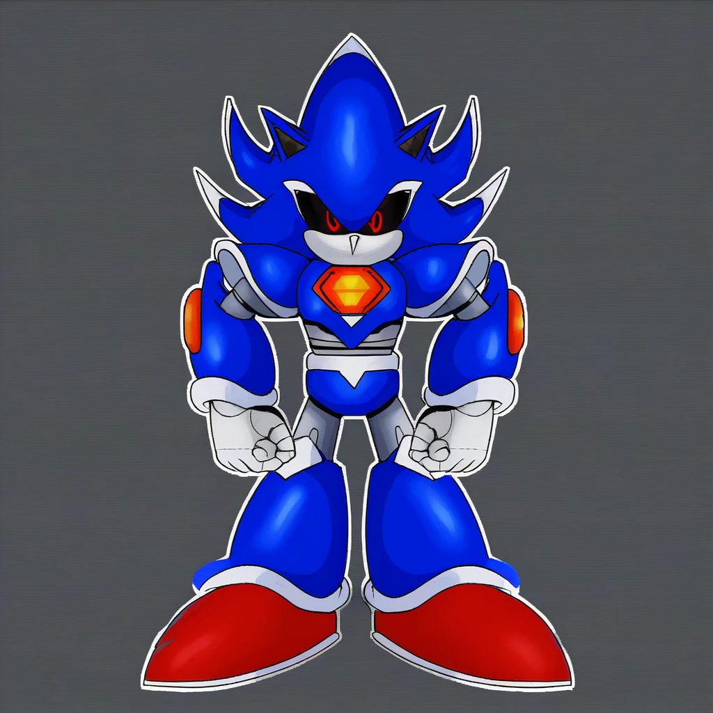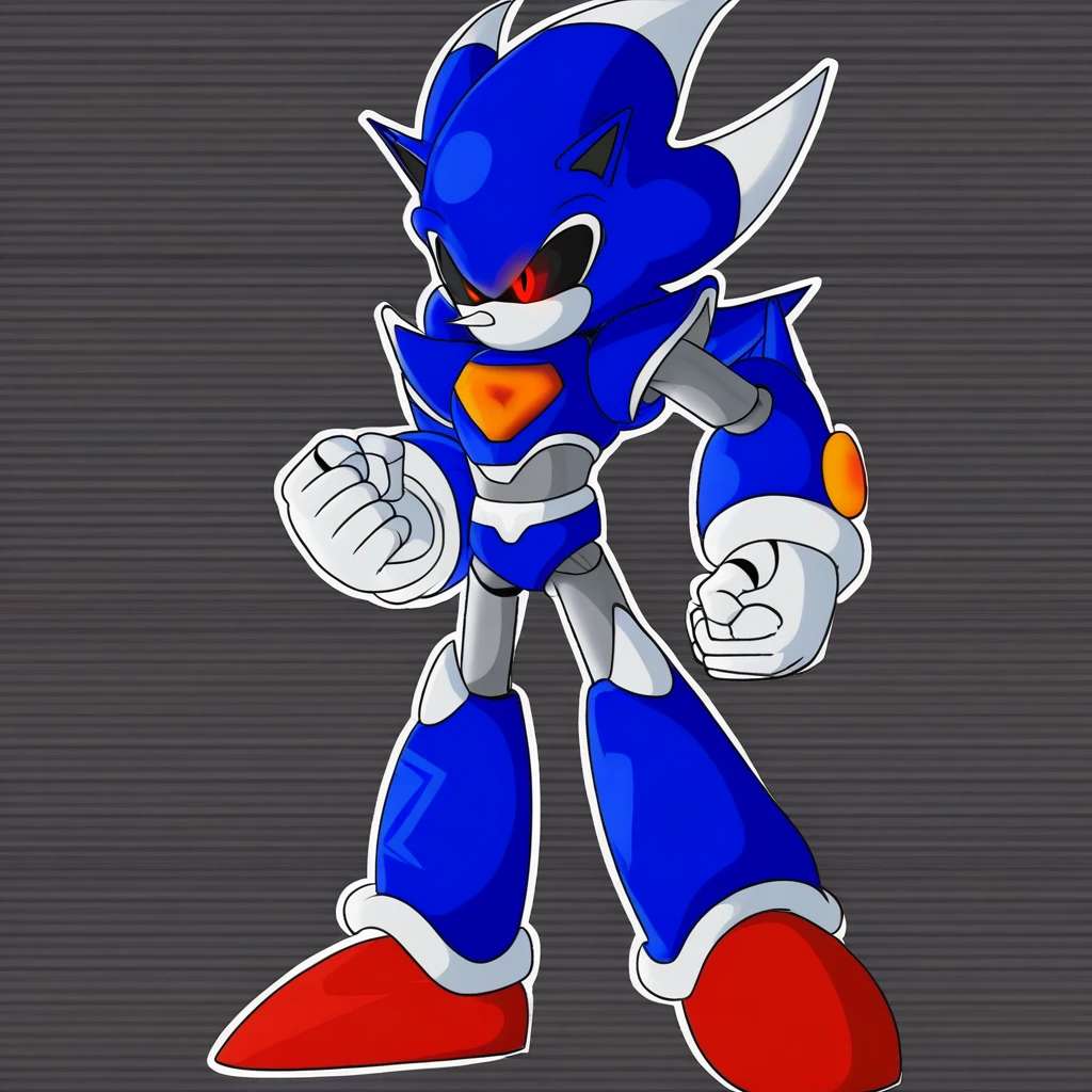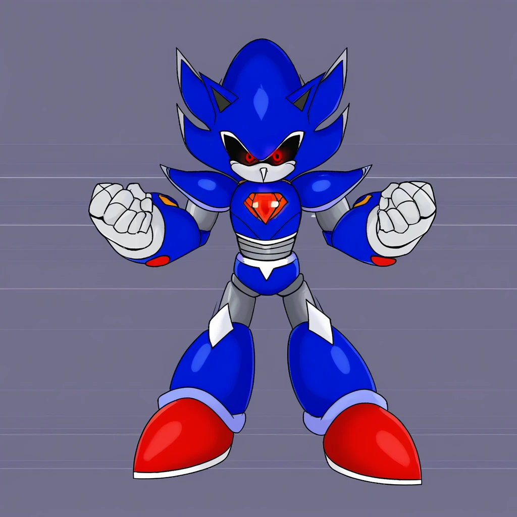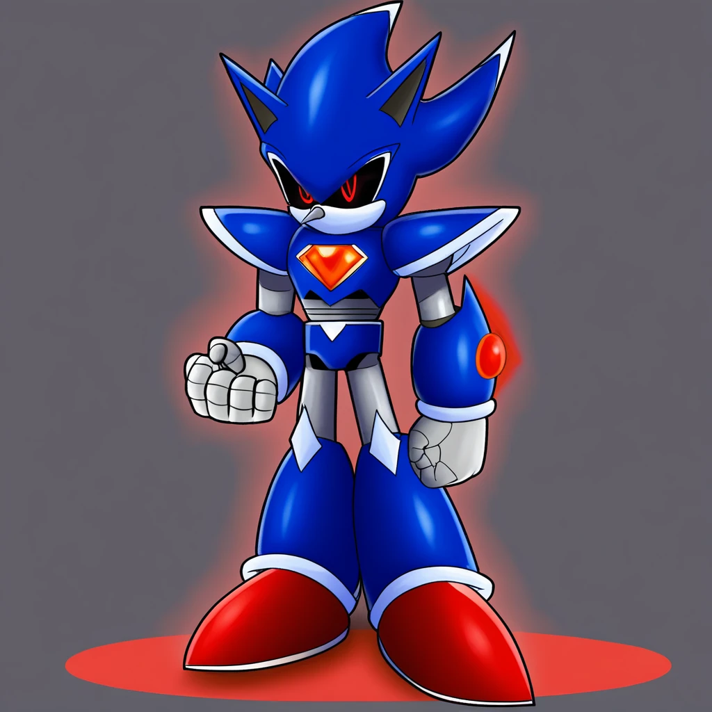 Metallix, black sclera, robot joints, red shoes, white spikes on its edges, blue metal skin, red energy core, red orbs on forearms, white hands, pointy nose, hedgehog ears, solo, robot, red eyes, no mouth