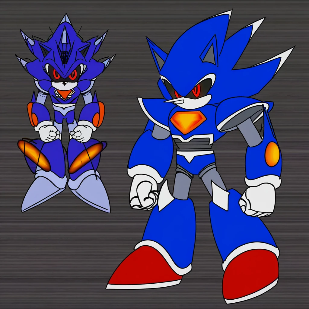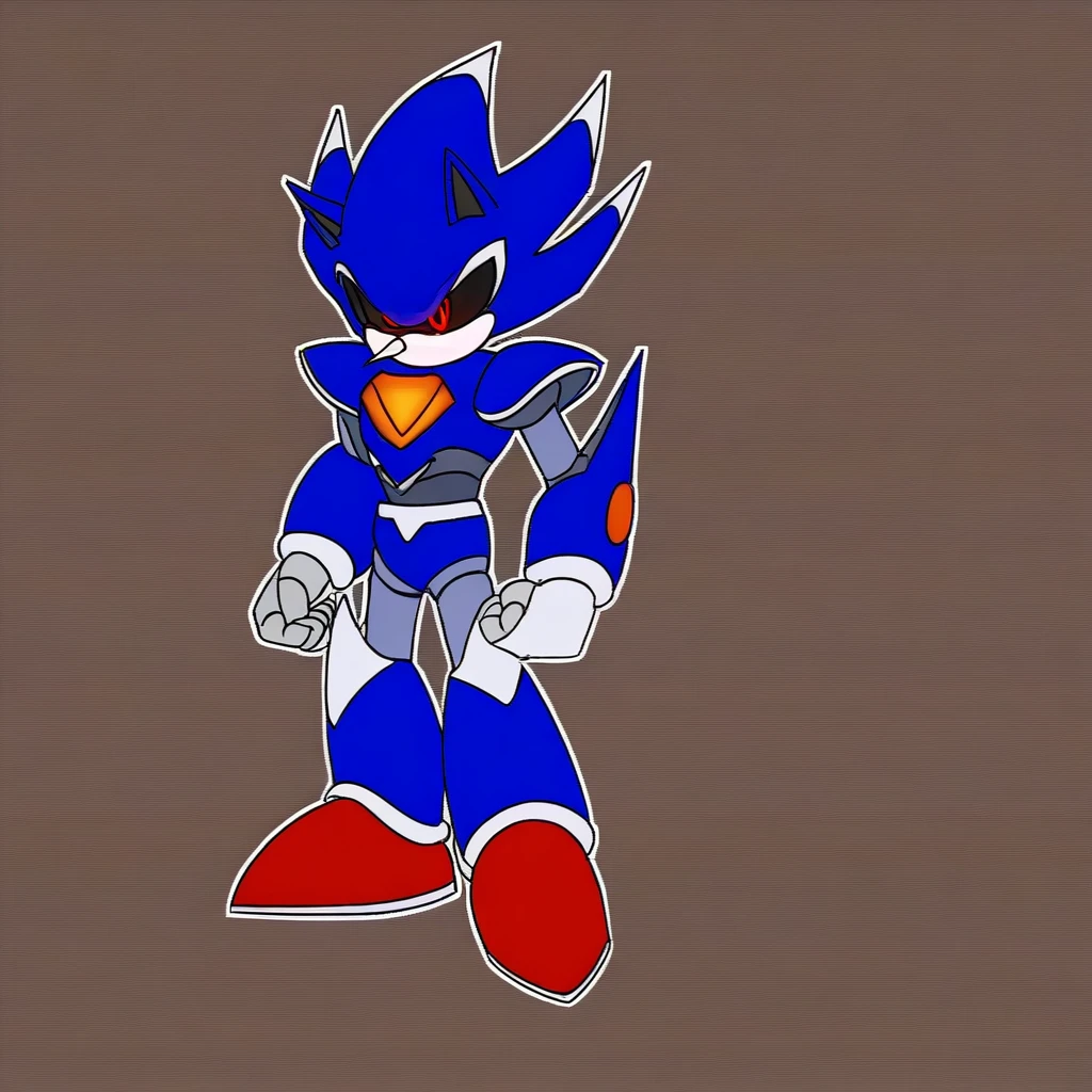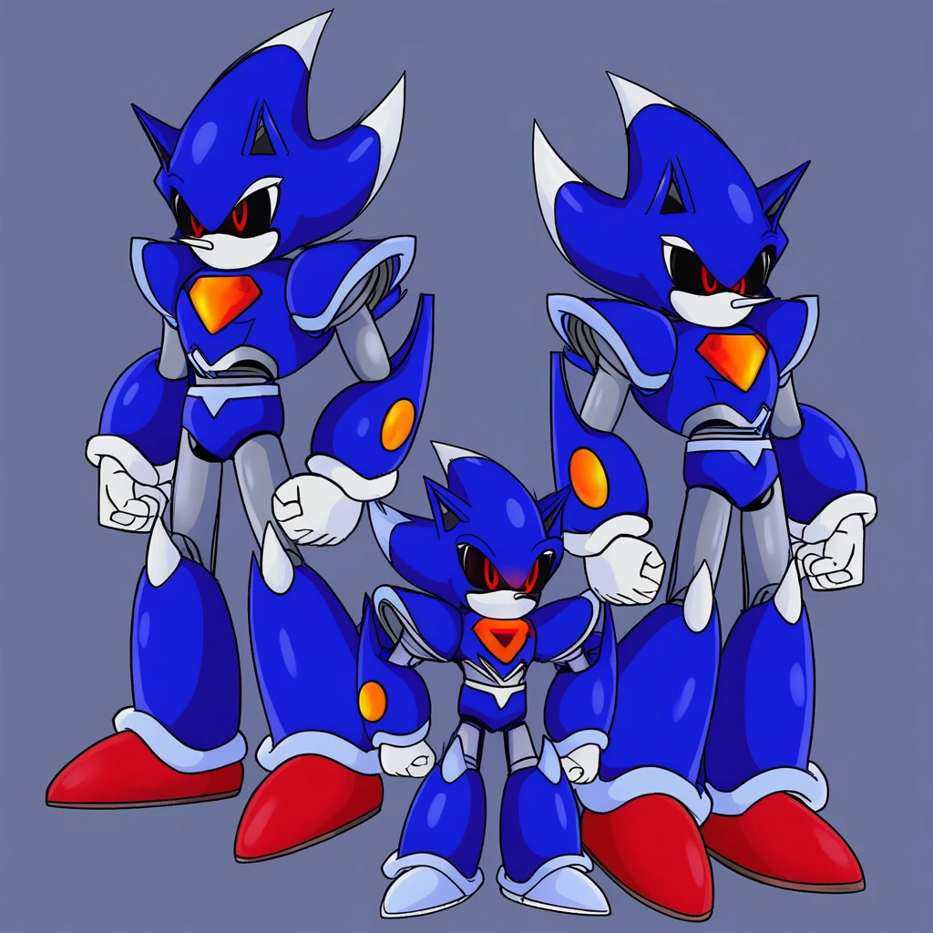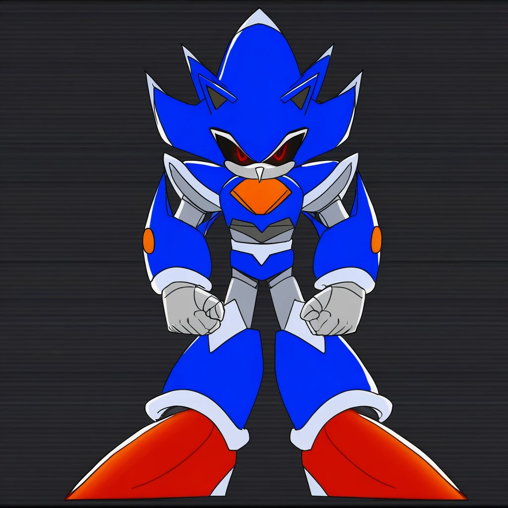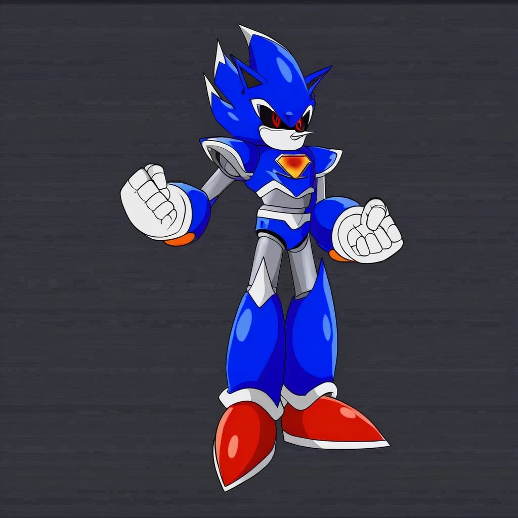 Metallix, black sclera, robot joints, red shoes, white spikes on its edges, blue metal skin, red energy core, red orbs on forearms, white hands, pointy nose, hedgehog ears, solo, robot, red eyes, no mouth