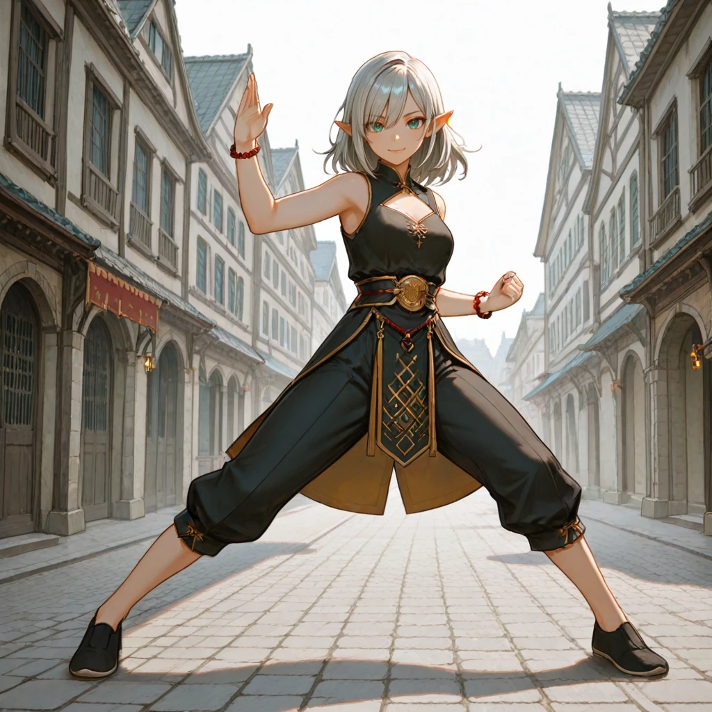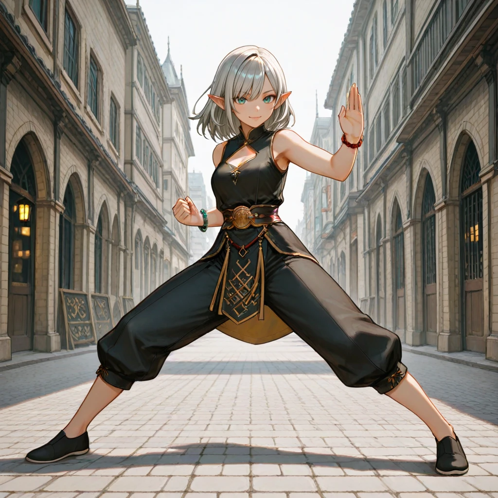 Elara_Sylvania, black sleeveless chinese clothes, pants, shoes, band, bracelet,