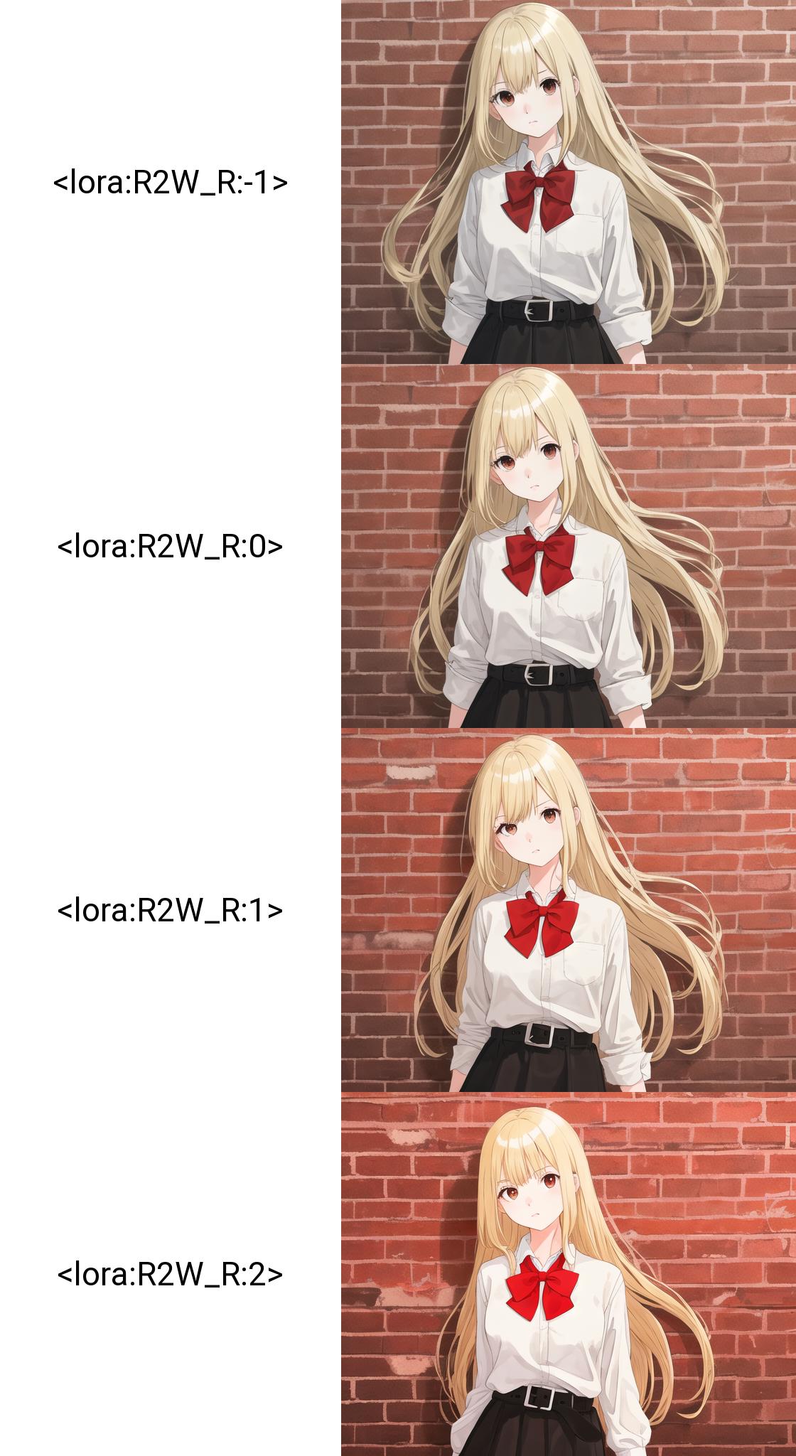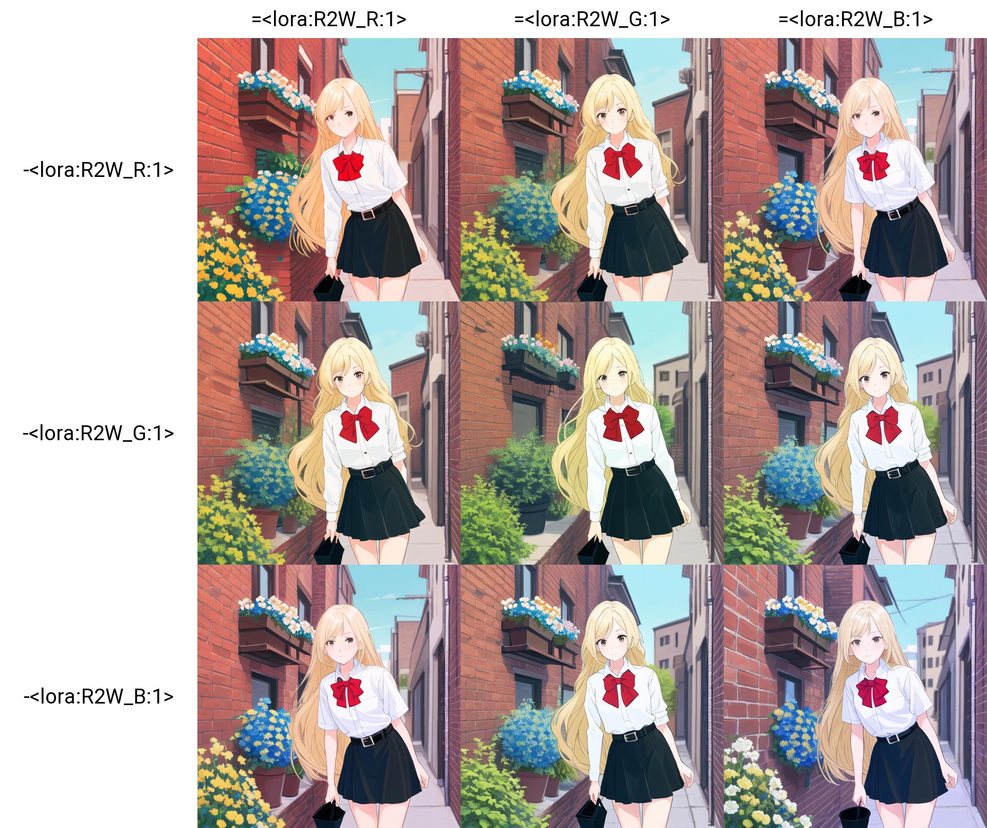 These three Loras can respectively increase the proportion of red, green, or blue in the image. The higher the weight, the more obvious the effect.