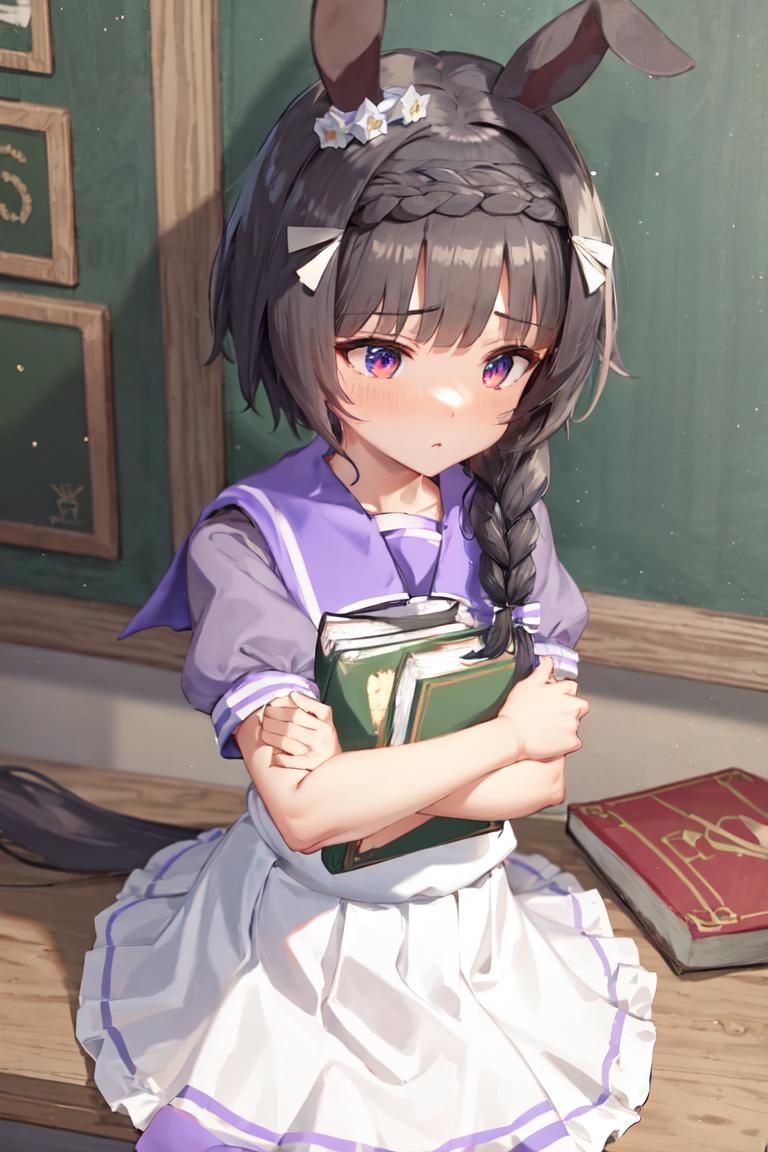 1girl, animal ears, horse ears, horse girl, long hair, official alternate costume, single braid, crown braid, purple hair, bangs, short hair, green eyes, braided ponytail, blue eyes, simple background, solo, horse tail, braid, medium hair, grey hair, black hair, blue hair, brown hair, low ponytail, blunt bangs