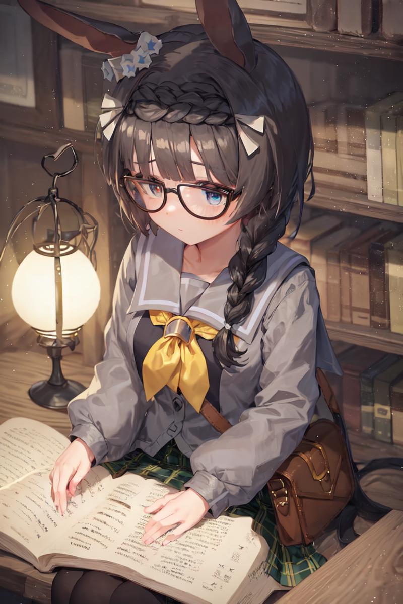 black-framed eyewear, glasses, tracen school uniform, ear ornament, hairclip, winter uniform, puffy long sleeves, sailor collar, purple shirt, white bowtie, horseshoe ornament, purple skirt, pleated skirt, purple thighhighs, brown footwear, loafers