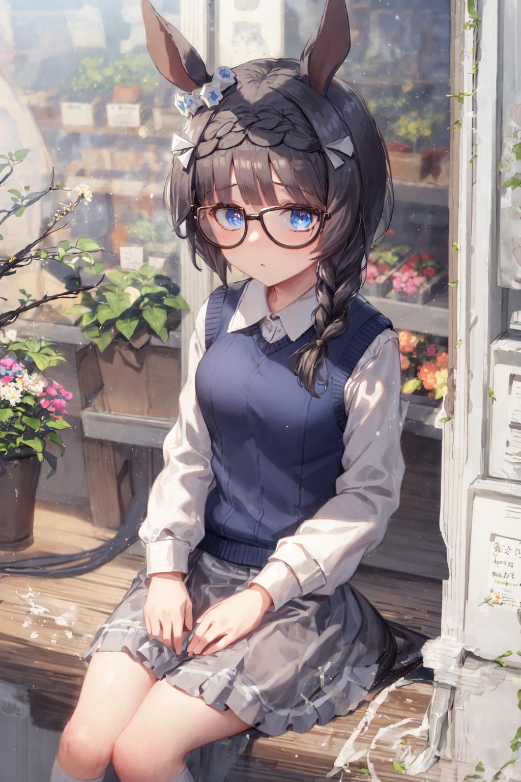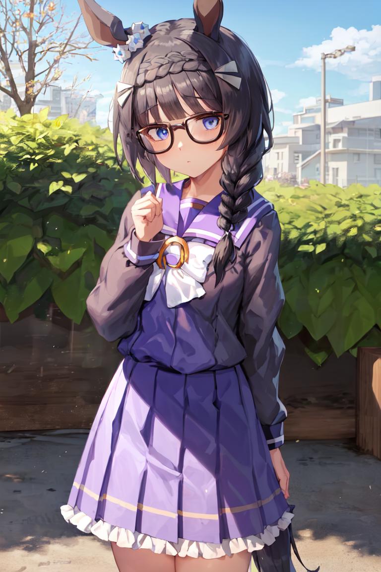 black-framed eyewear, glasses, tracen school uniform, summer uniform, serafuku, puffy short sleeves, purple bowtie, horseshoe ornament, sailor collar, sailor shirt, purple shirt, white skirt, pleated skirt, frilled skirt, miniskirt, zettai ryouiki, white thighhighs, brown footwear, loafers