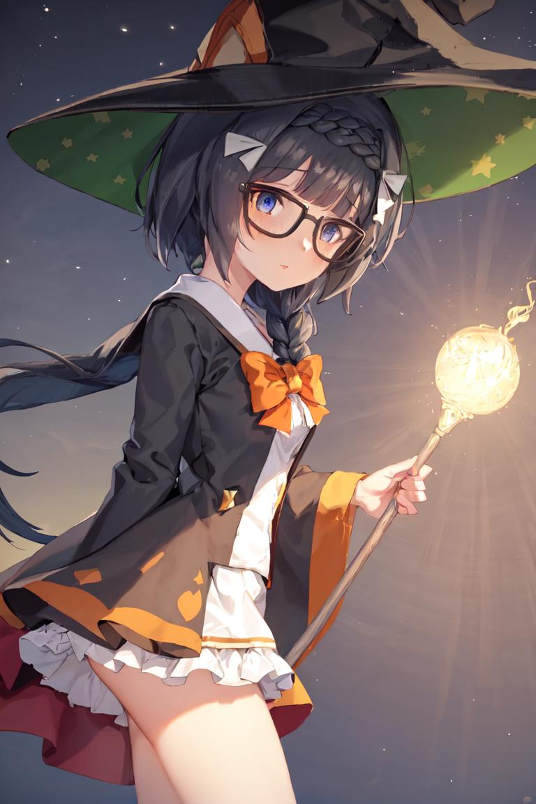 official alternate costume, halloween costume, hairclip, hair bow, blue bow, witch hat, star print, ears through headwear, black headwear, glasses, black-framed eyewear, black robe, white shirt, orange bowtie, center frills, long sleeves, black skirt, striped thighhighs, black footwear, boots