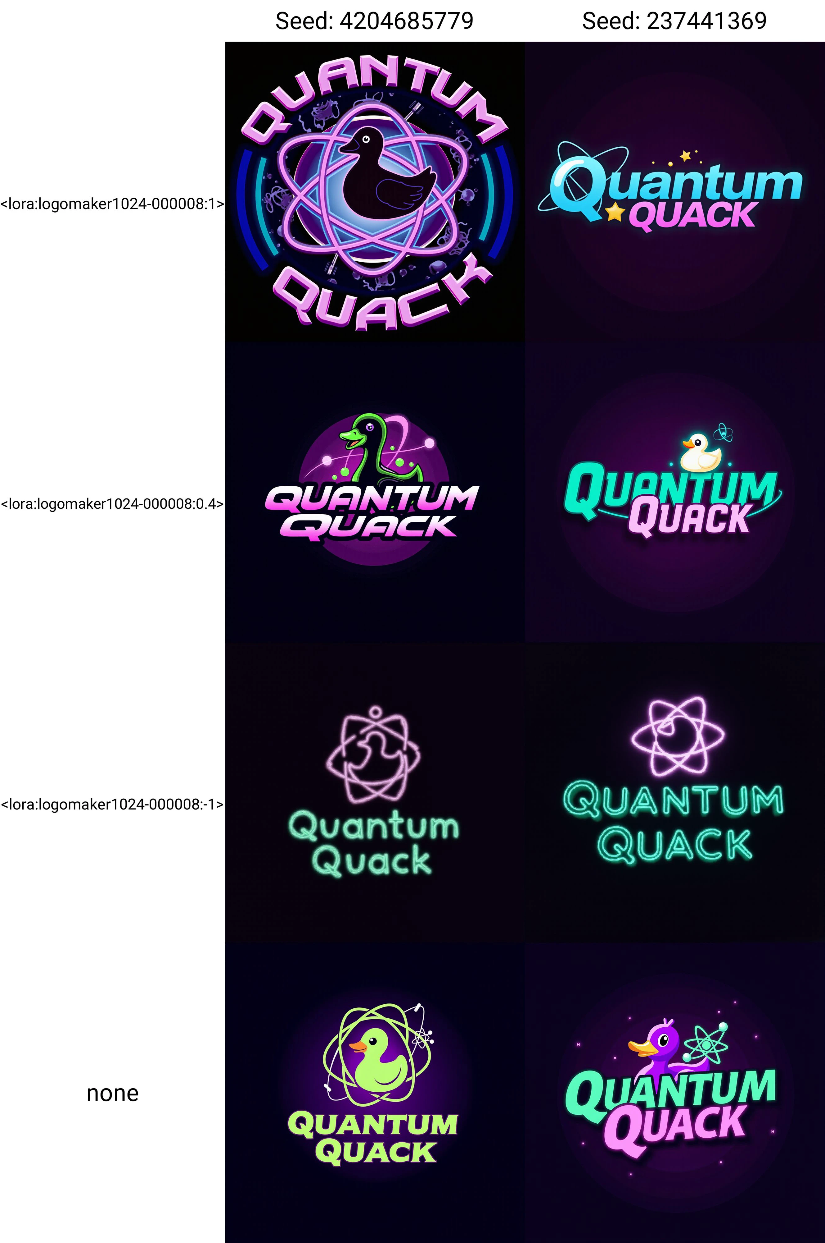 Company logo by LogoMaker1024, the Bubble logo, which consists of blue and white text with a transparent bubble icon. The text reads "Bubble" in rounded, white lettering on a sky blue background. The bubble icon floats above the text, reflecting rainbow colors.Company logo by LogoMaker1024, the Anchor logo, which consists of deep blue and white text with a nautical anchor icon. The text reads "Anchor" in sturdy, white lettering on a navy blue background. The anchor icon replaces the "A" in the text, with a rope wrapped around it.Company logo by LogoMaker1024, the Quantum Quack logo, which consists of a vibrant purple and neon green text with a duck-shaped atom icon. The text reads "Quantum Quack" in futuristic, neon green lettering on a deep purple background. The duck-shaped atom icon has electrons orbiting around it in an erratic pattern, placed above the text.Best generation settings