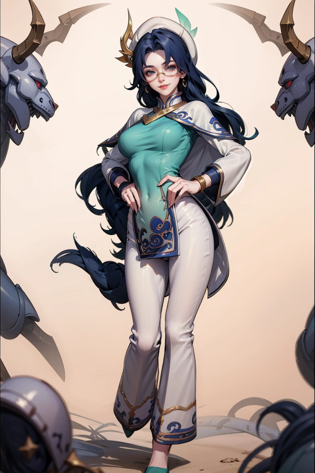 ,1girl, solo, long hair, single braid, head out of frame,large breast, looking at phone, smile, bangs, hair ornament, closed mouth, blue hair, (hair tied at the ends:1.5), yellow glasses, shiny, shiny hair, official alternate costume, parted bangs, shoulder armor, jewelry,yellow glasses, lips,yellow semi-rimless eyewear,yellow under-rim eyewear, yellow-framed eyewear:1.2, red lips,white pants, aqua nails ,high heels, capelet,hat,horn,nail polish,