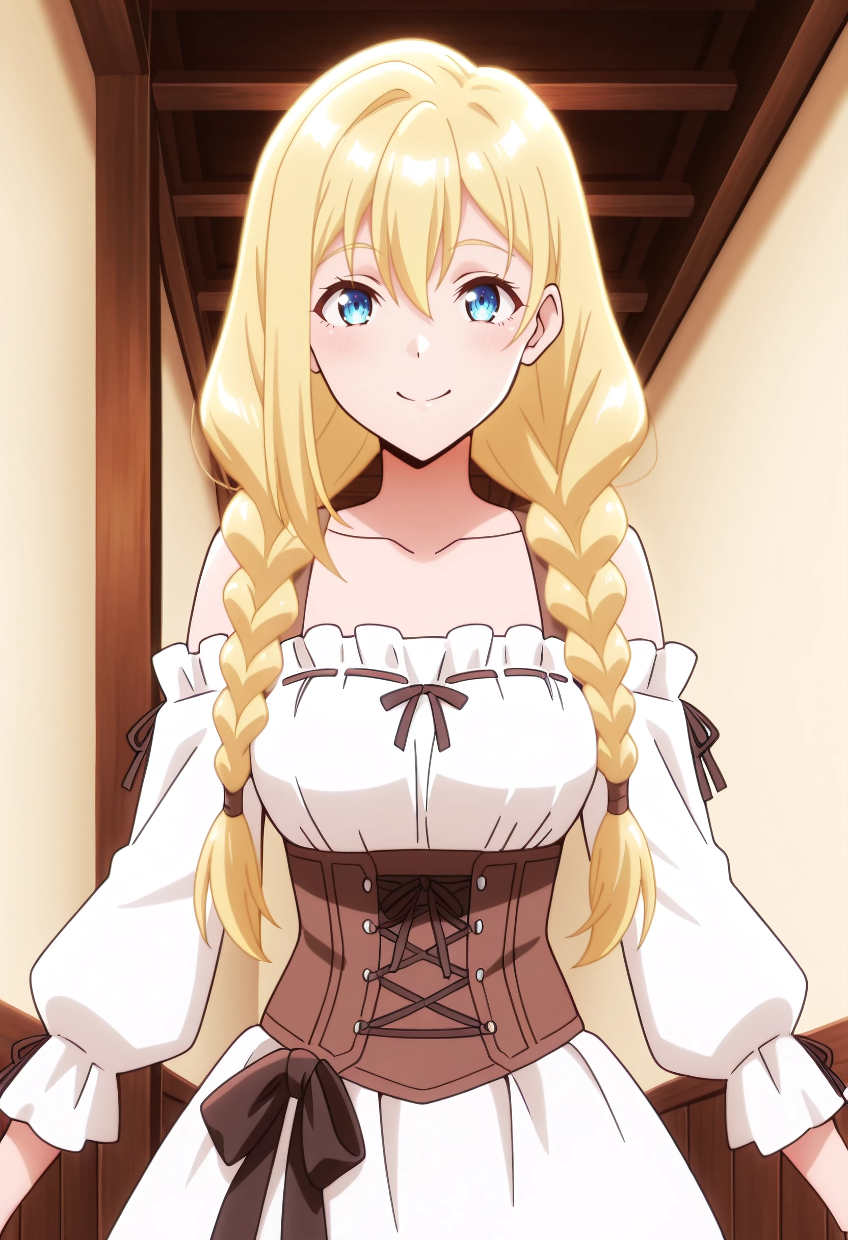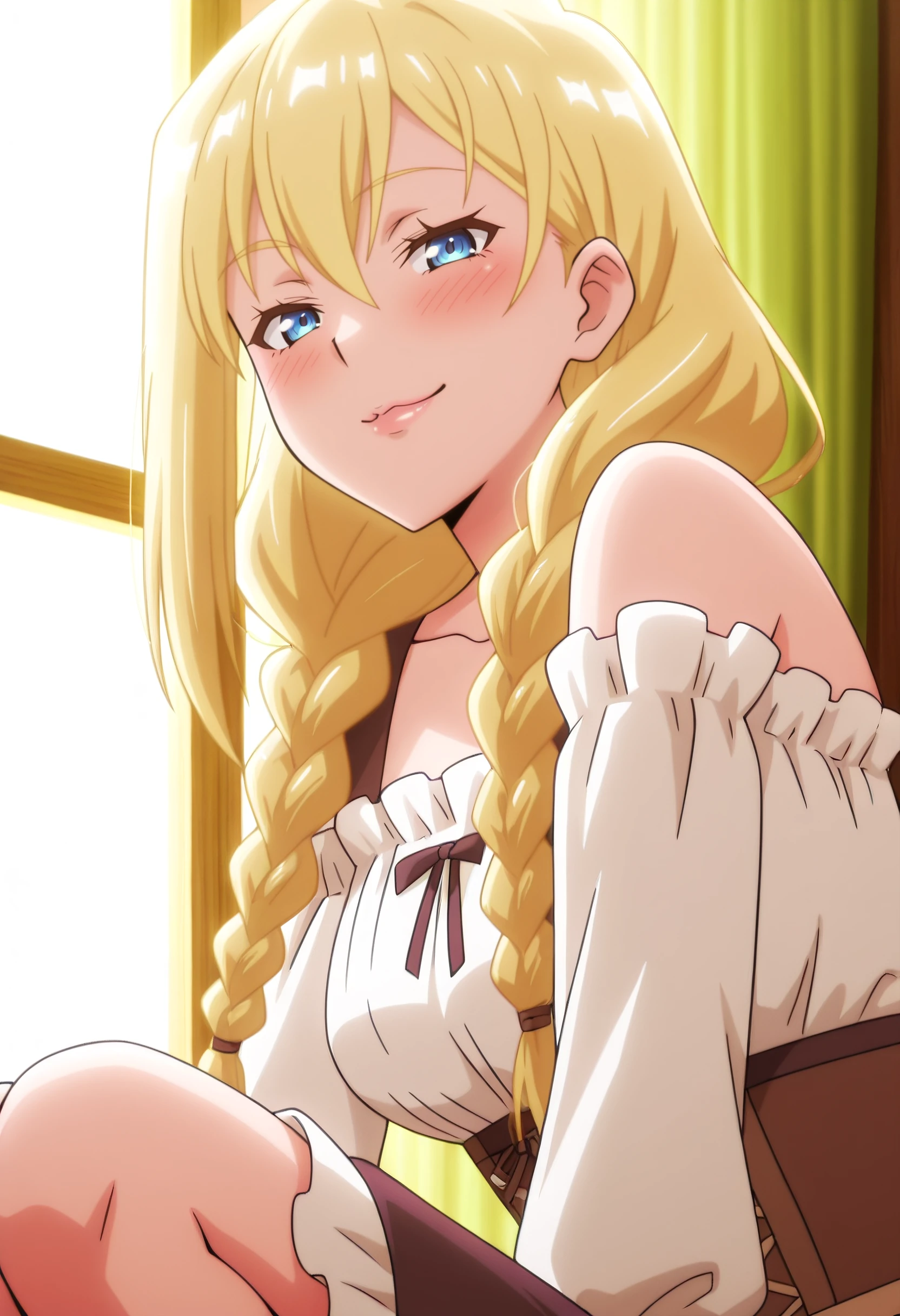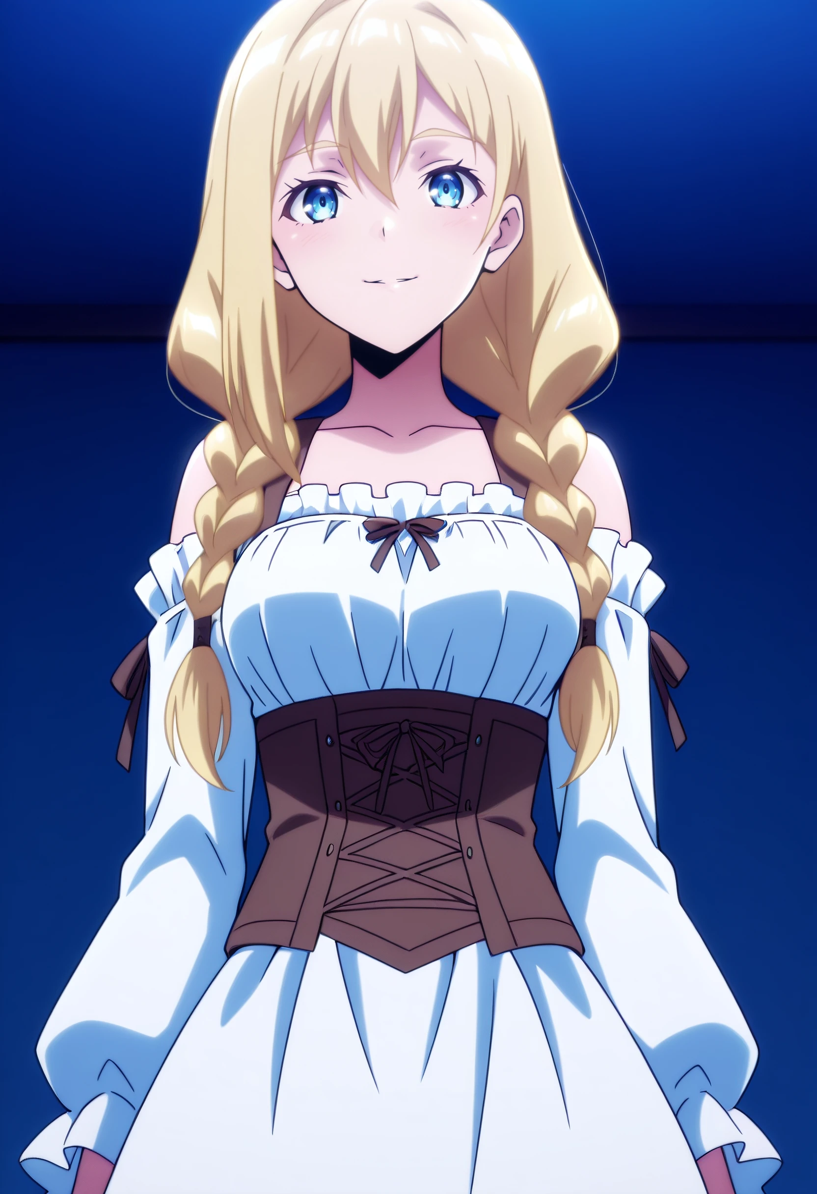 RoxyWhiteDress, bare shoulders, dress, long sleeves, frills, braid, collarbone, detached sleeves, twin braids, corset, hair over shoulder, off shoulder, frilled sleeves, white dress, underbust, white shirt, bow, skirt, ribbon, puffy sleeves, off-shoulder dress,