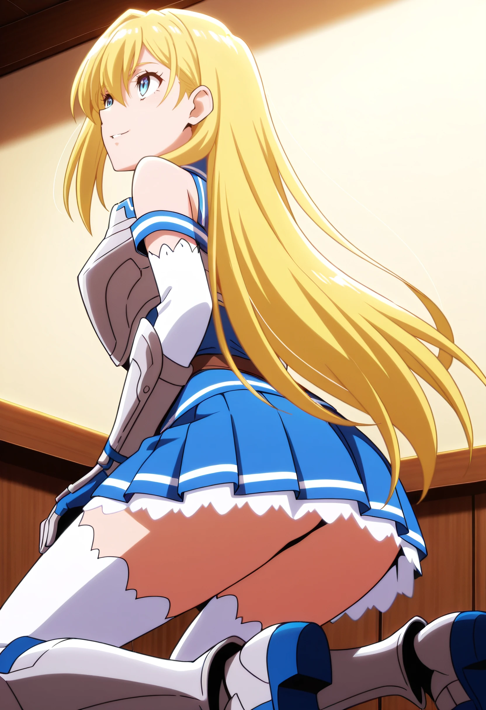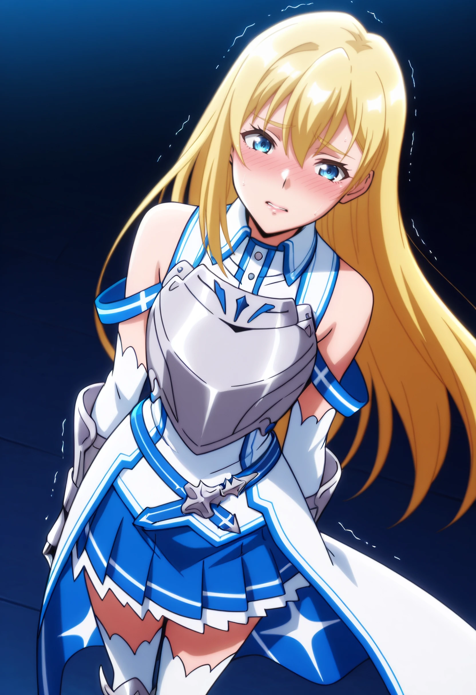 RoxyArmor, armor, gloves, elbow gloves, bare shoulders, skirt, detached sleeves, white gloves, thighhighs, breastplate, shirt, dress, gauntlets, armored dress, sleeveless, blue skirt, white legwear, pleated skirt, boots, highleg, armored boots,