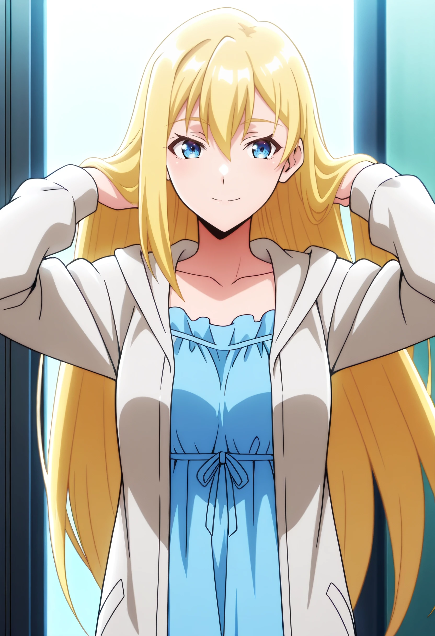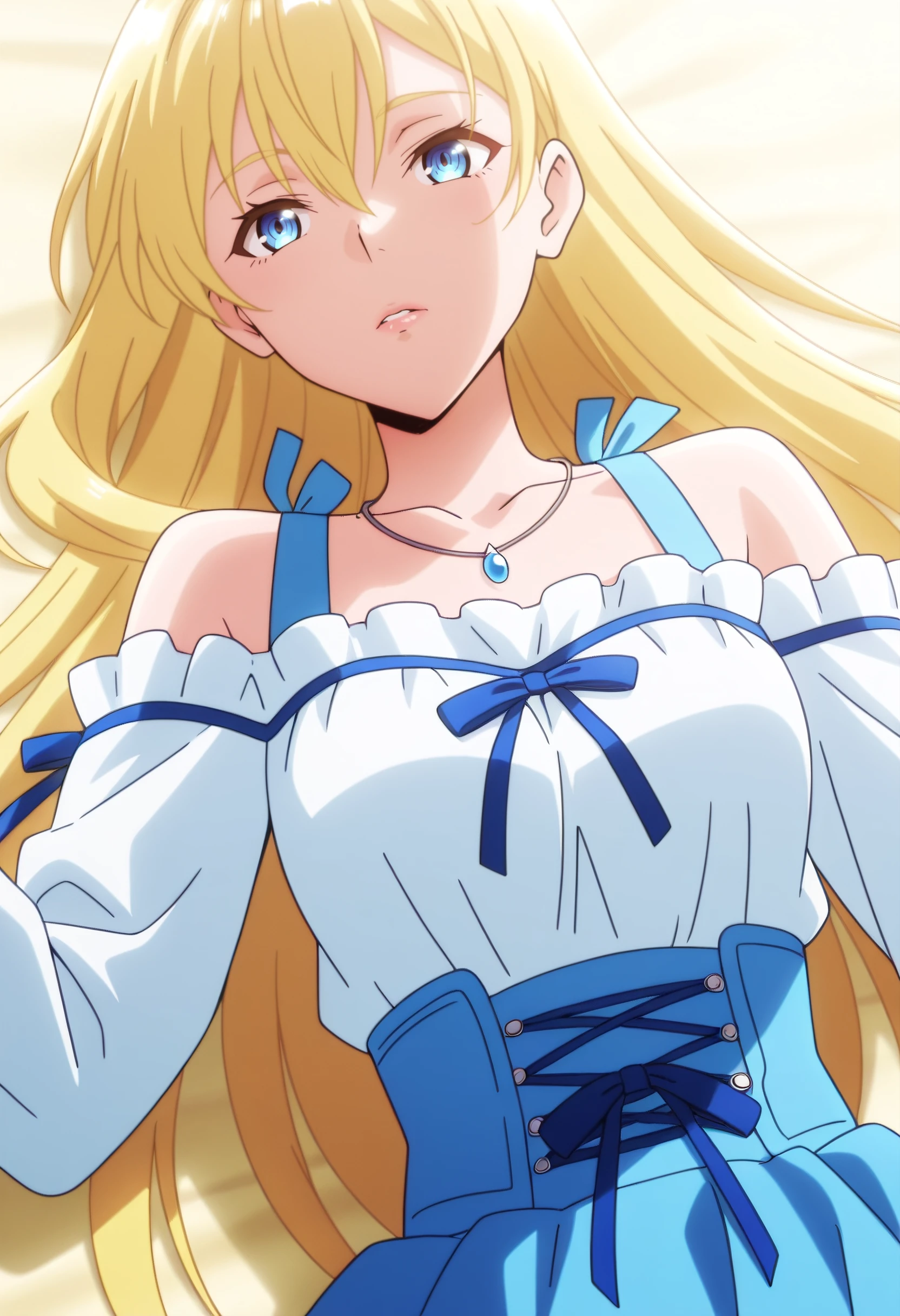 RoxyBlueDress, dress, long sleeves, collarbone, bare shoulders, sleeveless, blue dress, blue ribbon, blue bow, jacket, jewelry, necklace, frills, casual, ribbon, puffy sleeves, blue skirt, white jacket,