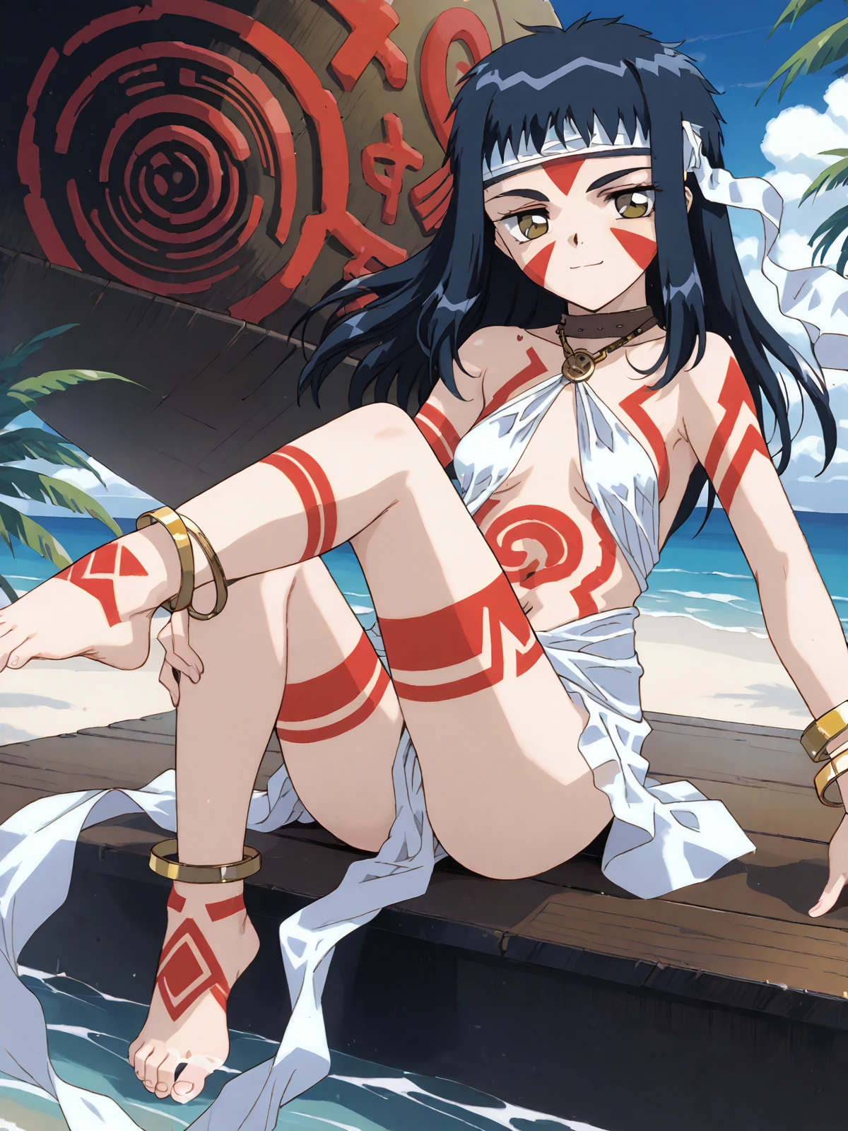 score_9, score_8_up, score_7_up, source_anime, traditional media, 1990s \(style\), retro artstyle, high res image, best quality, cute face, wet skin, clear skin, shiny hair, ultra detailed eyes, 1girl, shimabara yuuhi lifting one leg to show the soles👣 arch of the foot palm, foot on viewer, blue black hair, short disheveled bangs, jagged cowlick, long locks, medium long hair, thick eyebrows, raised eyebrow, squinting, half opened one eye, sharp golden eyes, small breasts, solo, (provocation, evil smile, smug:0.8), (5toes), between toes, spread toes, toenails, feet, blush, ass visible through thighs, armpit, navel, collarbone, ribs, skinny, sweat, steam, stuffy smell, translucent skin, dynamic pose, lips gloss, red tribal tattoo swirls spin pattern all over body, red body markings, bodypaint, full-body tattoo, body writing, red facepaint, red facial tattoo, swirl breasts tattoo, swirl belly tattoo, chest tattoo, arm tattoo, leg tattoo, thigh tattoo, shoulder tattoo, butt tattoo, tribal tattoo, tribal, white ribbon forehead (hachimaki:2) headband, white criss-cross halter neck, white loincloth, white sarong, golden anklet, golden armlet, golden bangle, golden bracelet, golden choker, (outdoors:1.5), cluttered and detailed background, beautiful detailed background, palm tree, cloud, cloudy sky, sea, summertime on tropical beach, Angkor Wat on an island in the distance, midnight jungle, inside a private lounge, (one leg up:0.8), (foot focus), (cowboy shot), dutch angle,<lora:pony_bad_aio:-1><lora:shimabara_yuuhi_neo_ranga_Pony_lora_v20240901-weights_epoch_28+43:1>