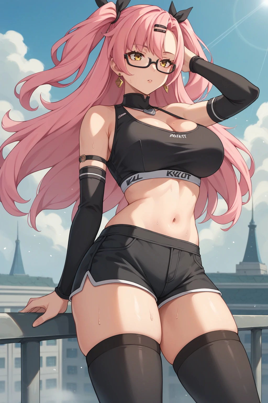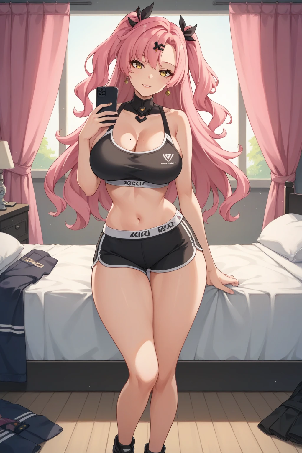 KJOnicole, two side up, pink hair, yellow eyes, long hair, thick thighs, curvy, hair ornament, mole on breast,