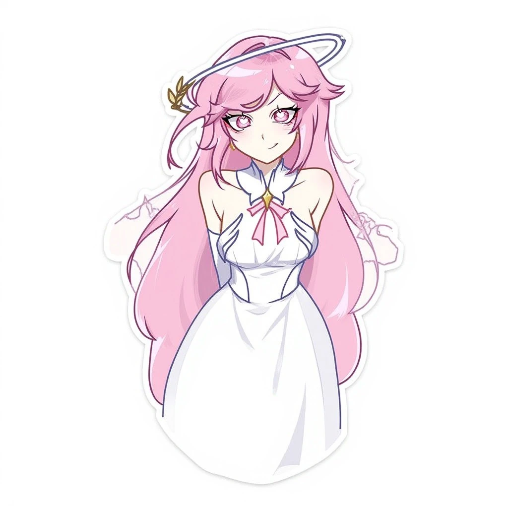 1girl,long hair,pink hair,pink eyes,detached collar,neck ribbon,pink ribbon,white dress,strapless dress,white dress,detached sleeves,halo