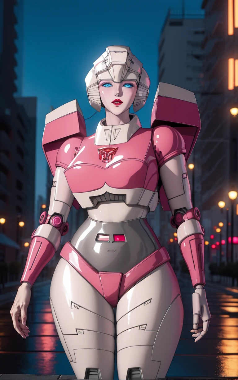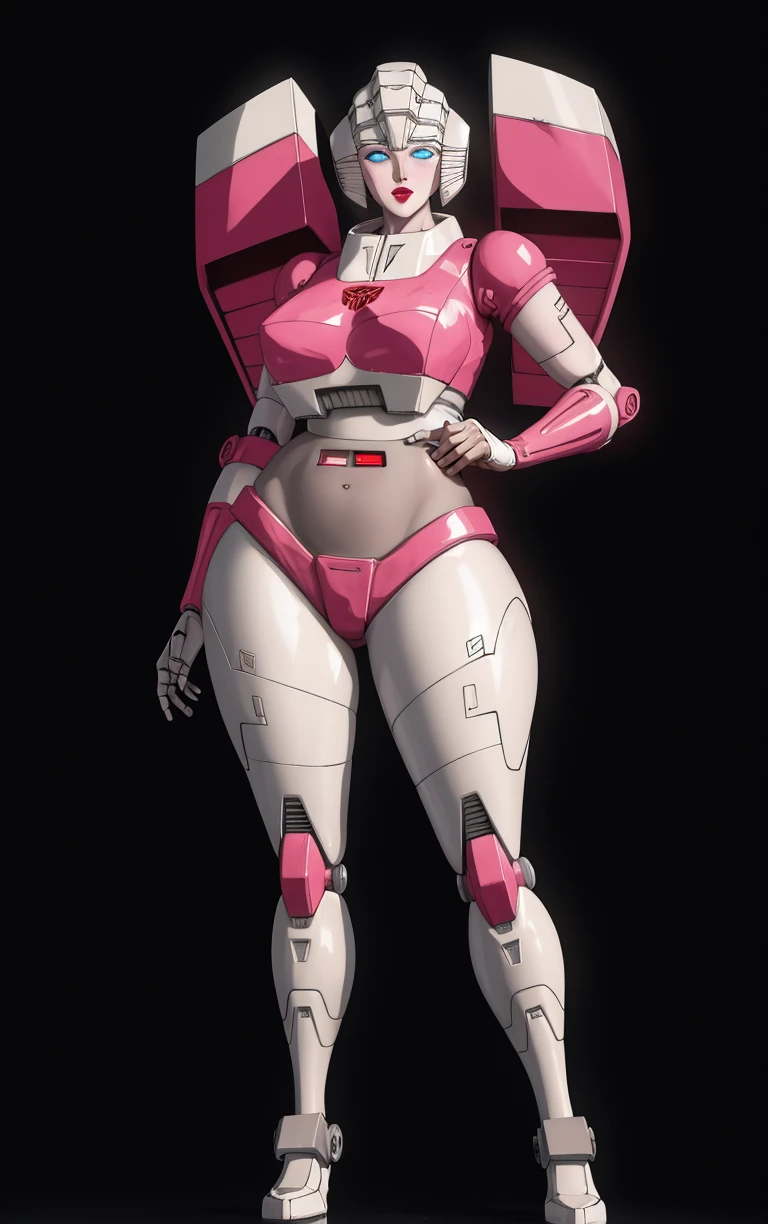1girl, autobot, blue eyes, helmet, mecha, no humans, pink top, red lips, shiny, insignia, pink panties, lipstick, breasts, glowing eyes, medium breasts, wide hips, makeup, navel, thick thighs, robot girl,