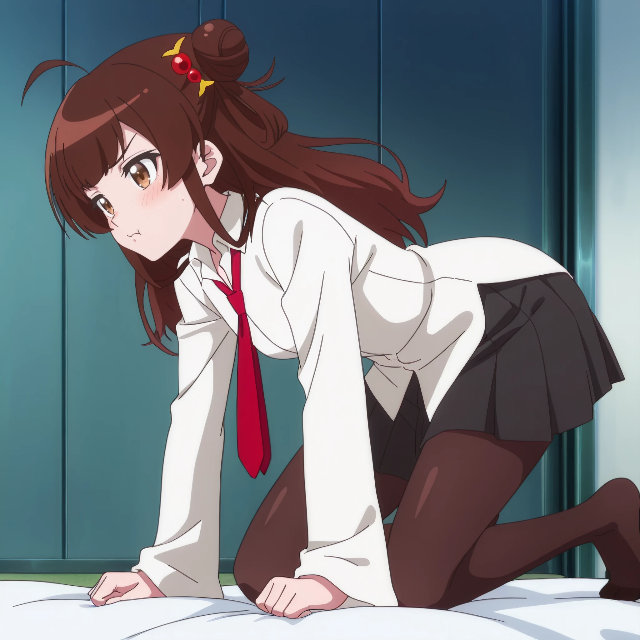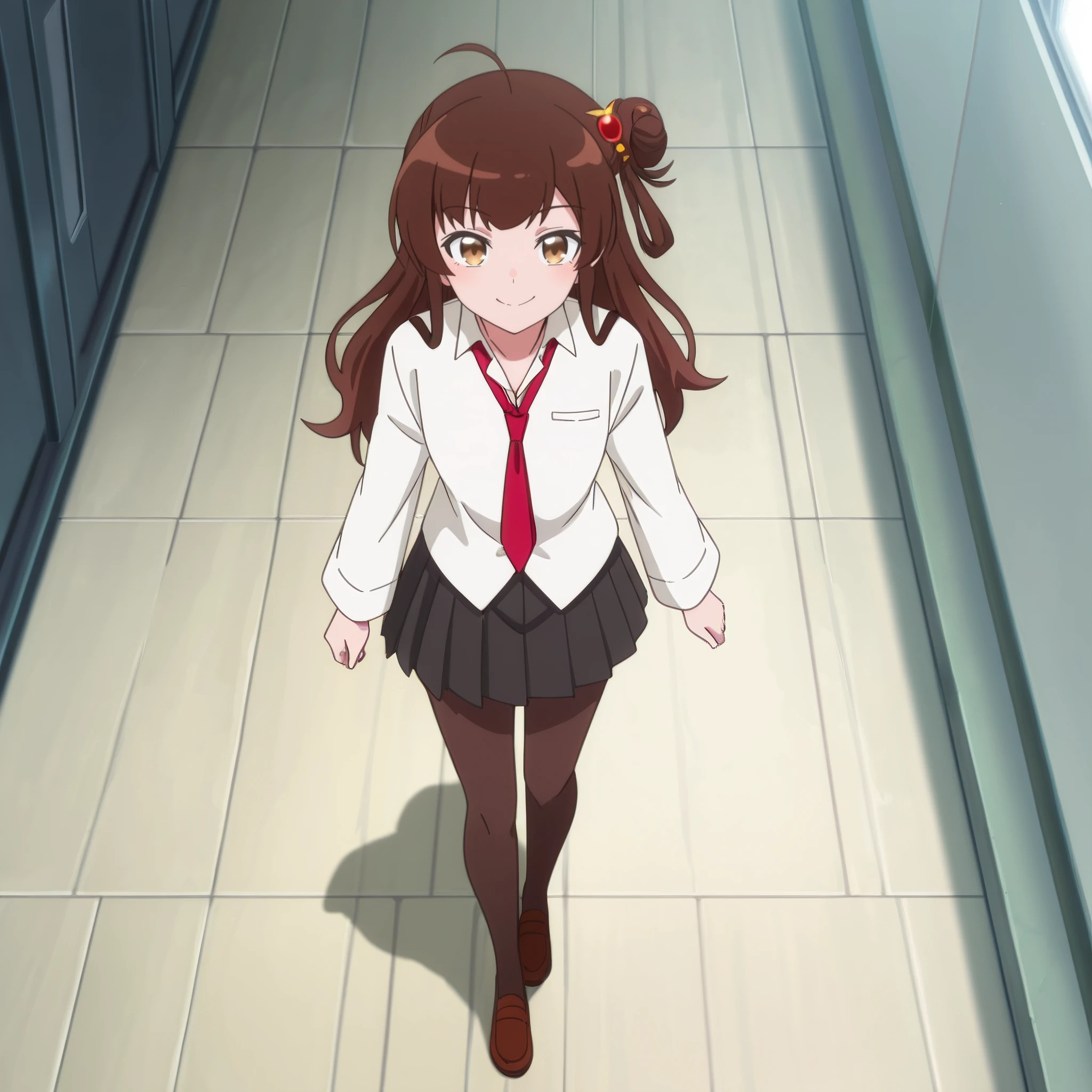 MegOutfit, shirt, white shirt, hair ornament, necktie, collared shirt, red necktie, school uniform, long sleeves, skirt, pantyhose, pleated skirt, black skirt, wing collar, wide sleeves, black legwear,