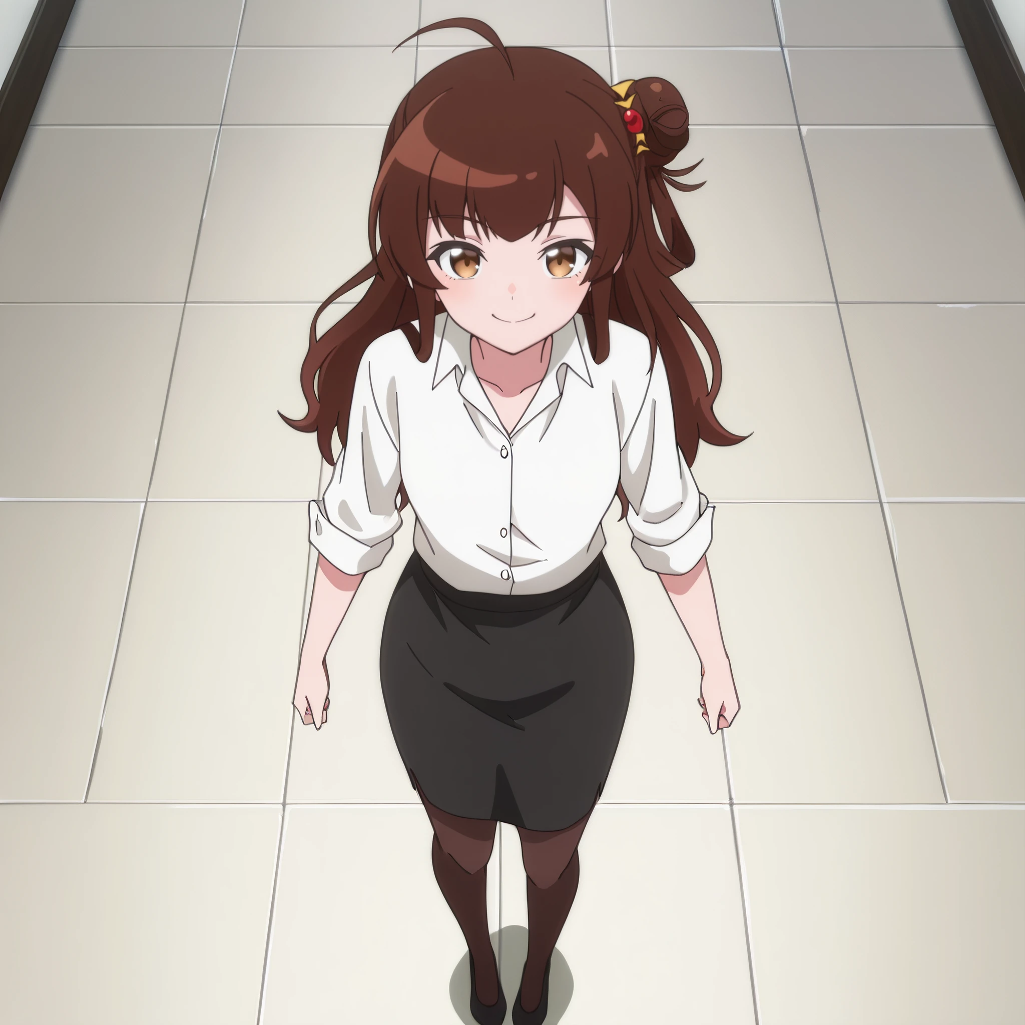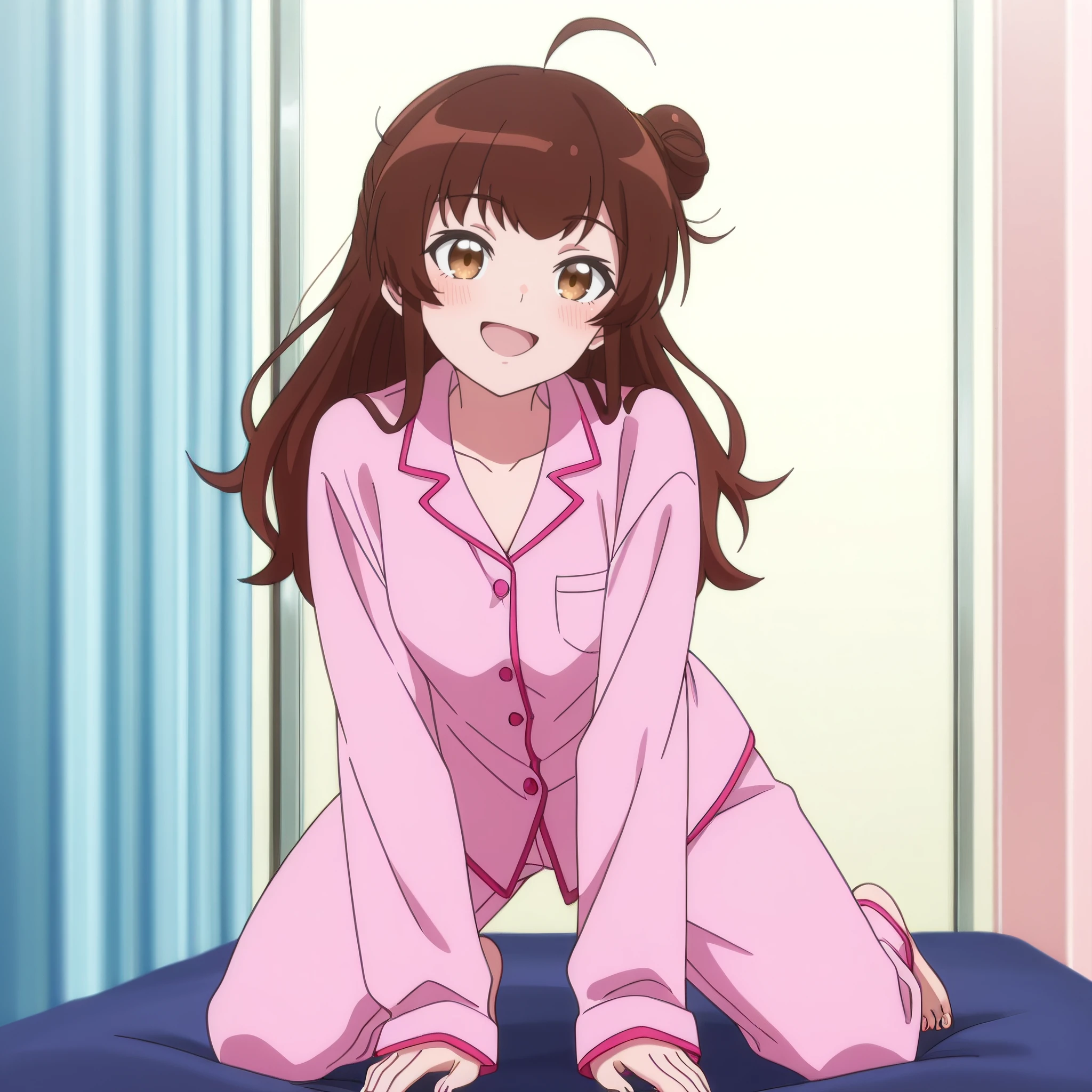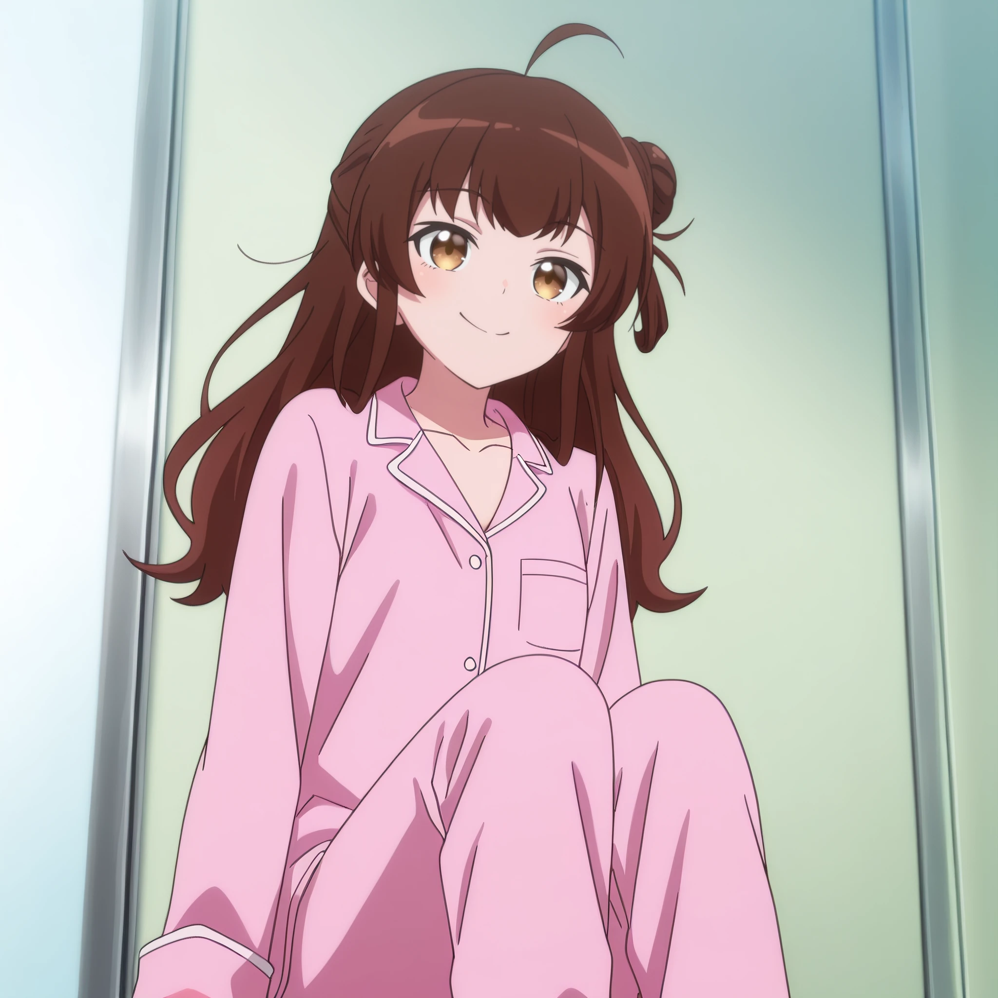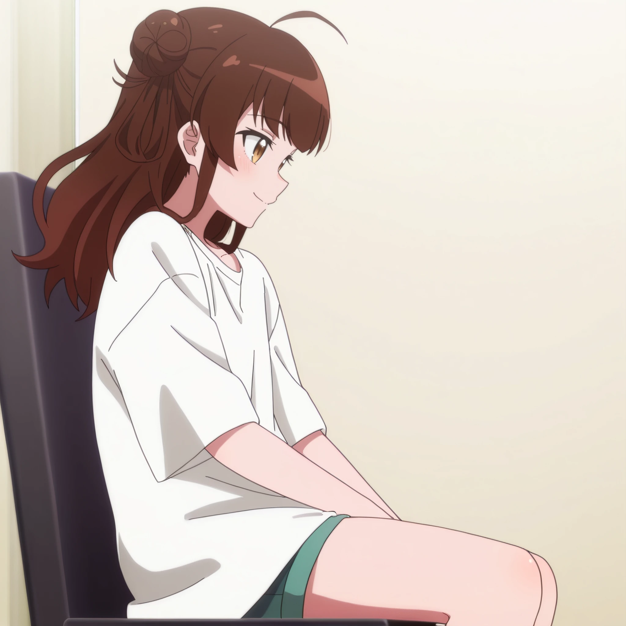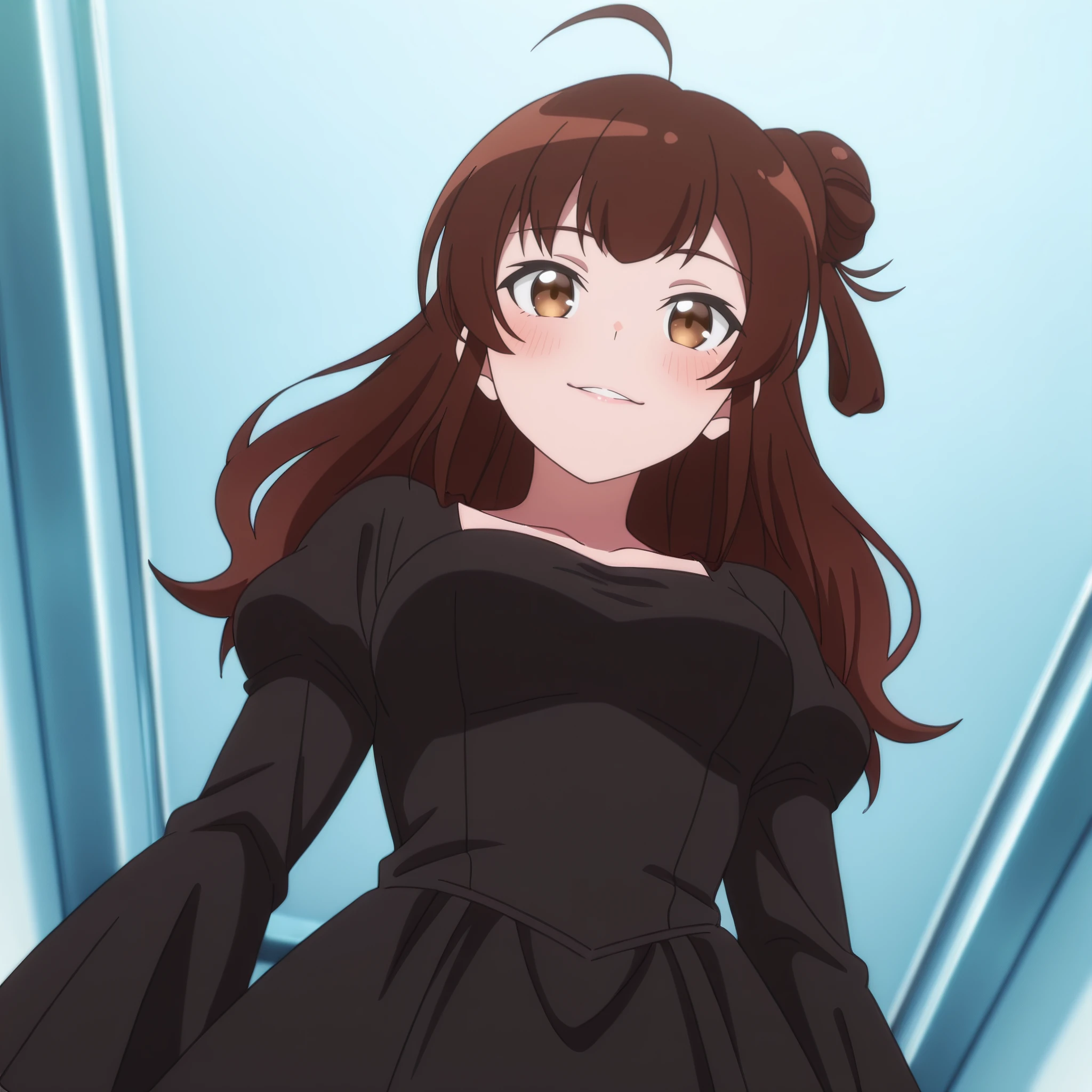 AMGMeg, brown hair, long hair, bangs, brown eyes, eyebrows visible through hair, ahoge, hair bun, side bun,