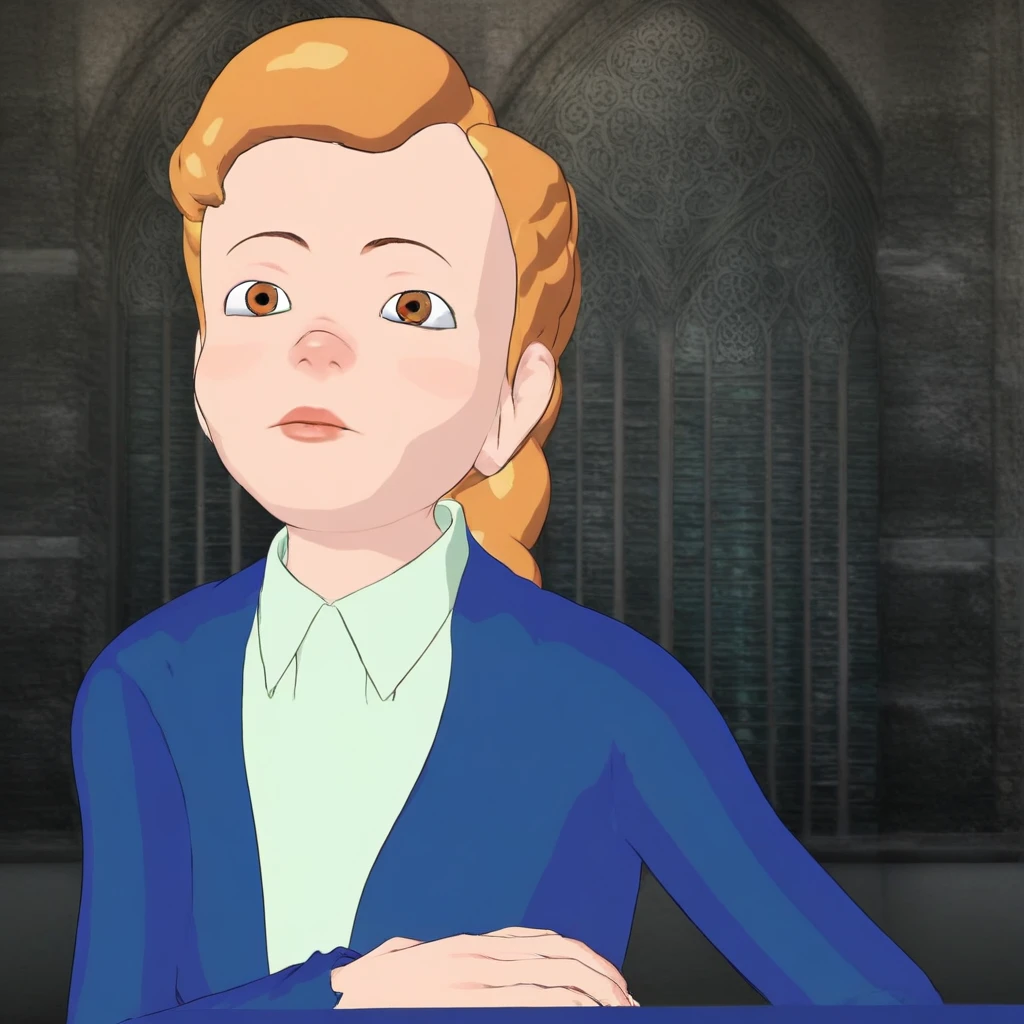 Triggers: ginger hair, long single braid, white collared shirt, women's blue top suit, long green skirt, blue women's shoes with low heels, slim body, small breasts, medium ass, brown eyes, red lips, beautiful five fingers on one handThe model was trained on the Pony Diffusion V6 XL
