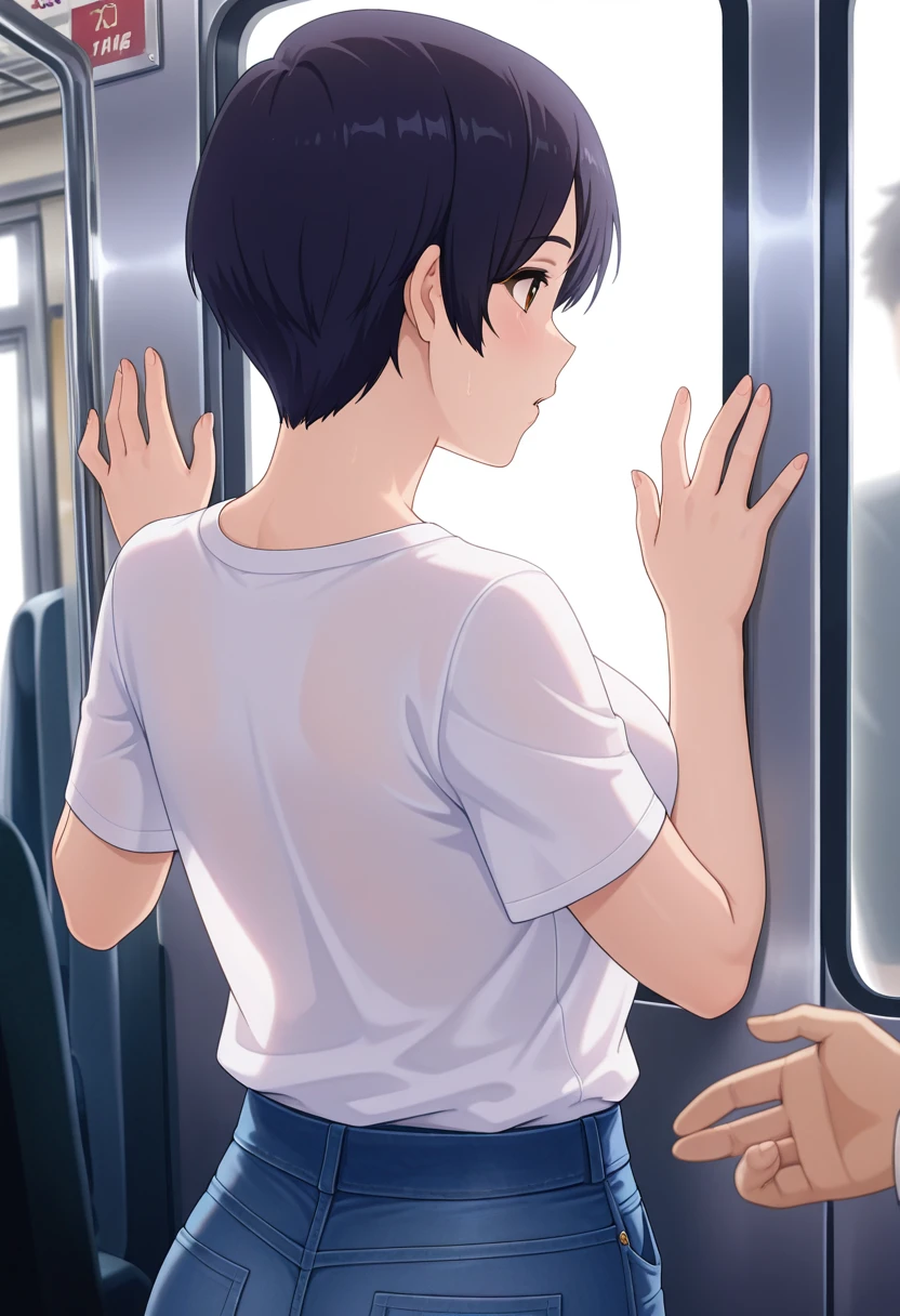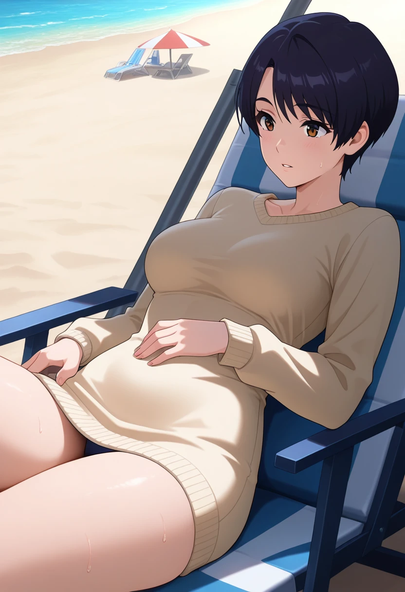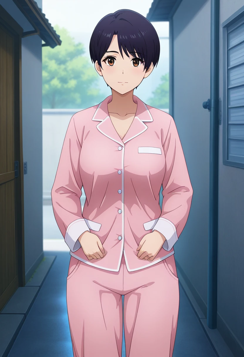 honokaww, mature female, brown eyes, black hair, short hair, asymmetrical bangs,