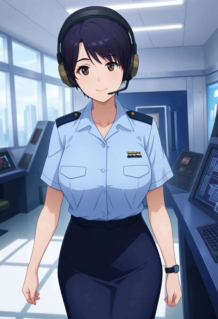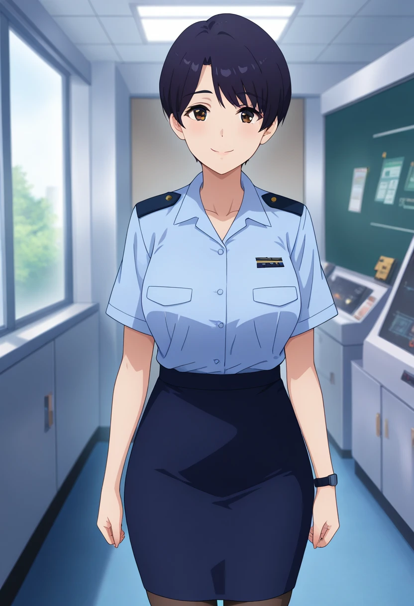 military uniform, blue collared shirt, short sleeves, wristwatch, dark blue pencil skirt, long skirt, pantyhose, pumps, high heels,