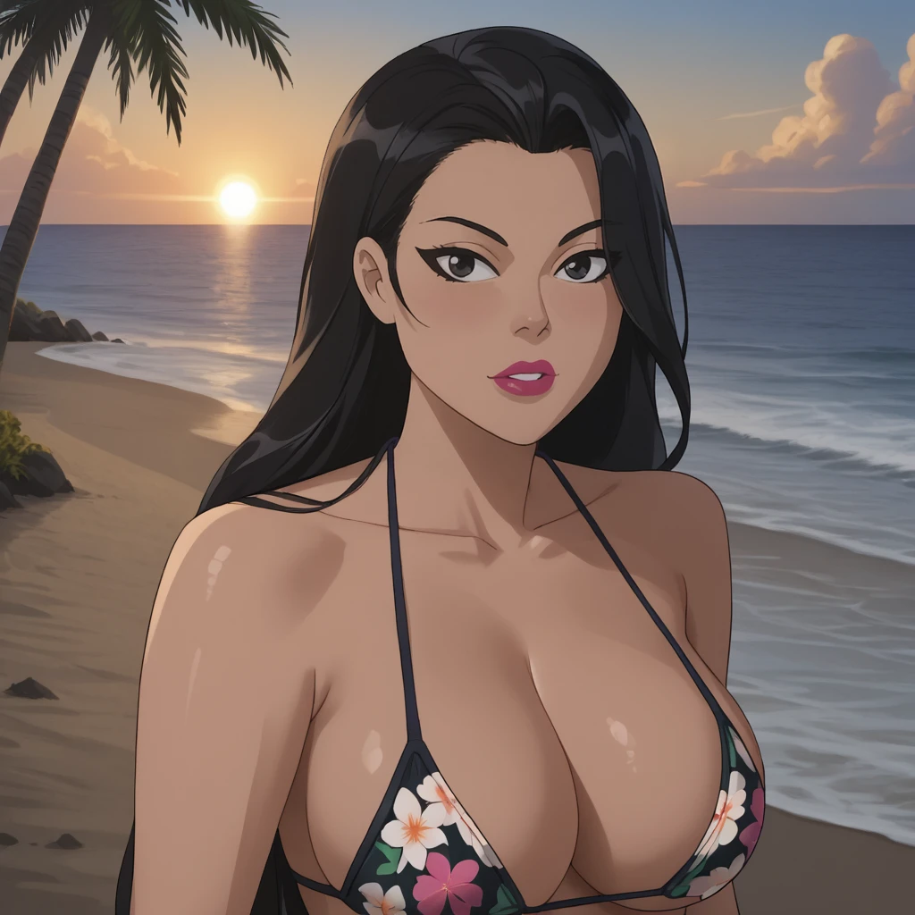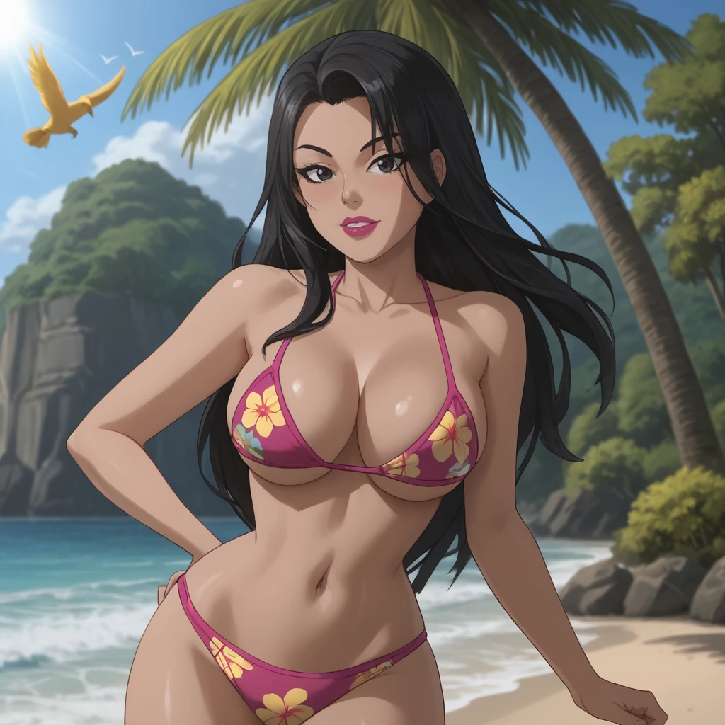 Trigger : HuntressDcau, 1girl, mask, lipstick, thighhighs, cape, long hair, dark-skinned female, navel, makeup, midriff, black hair, superhero, elbow gloves, dark skin, belt, perfect eyes, cowboy shot