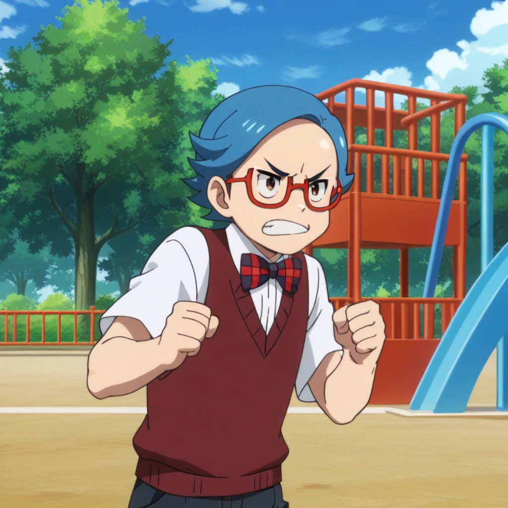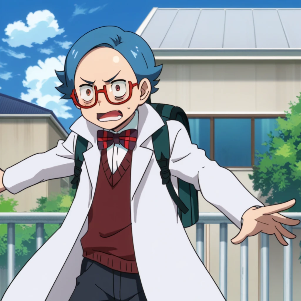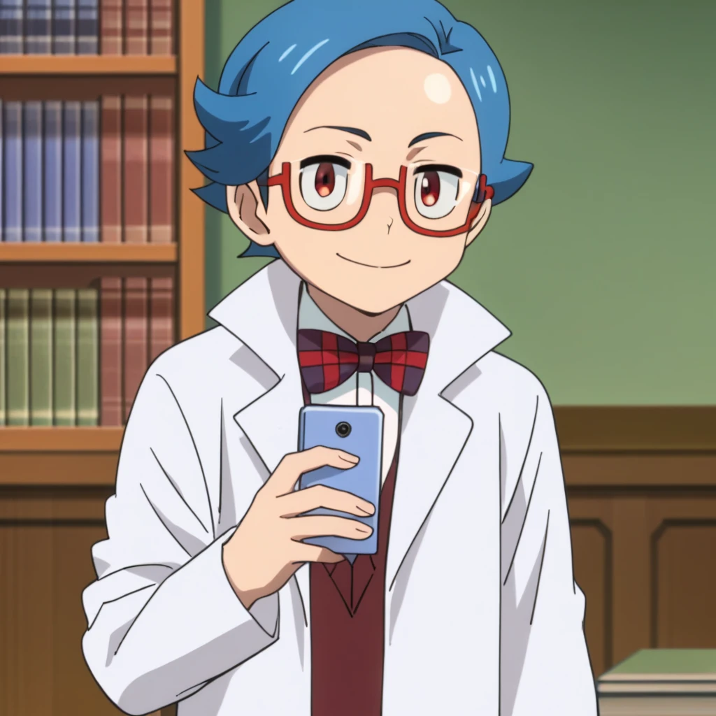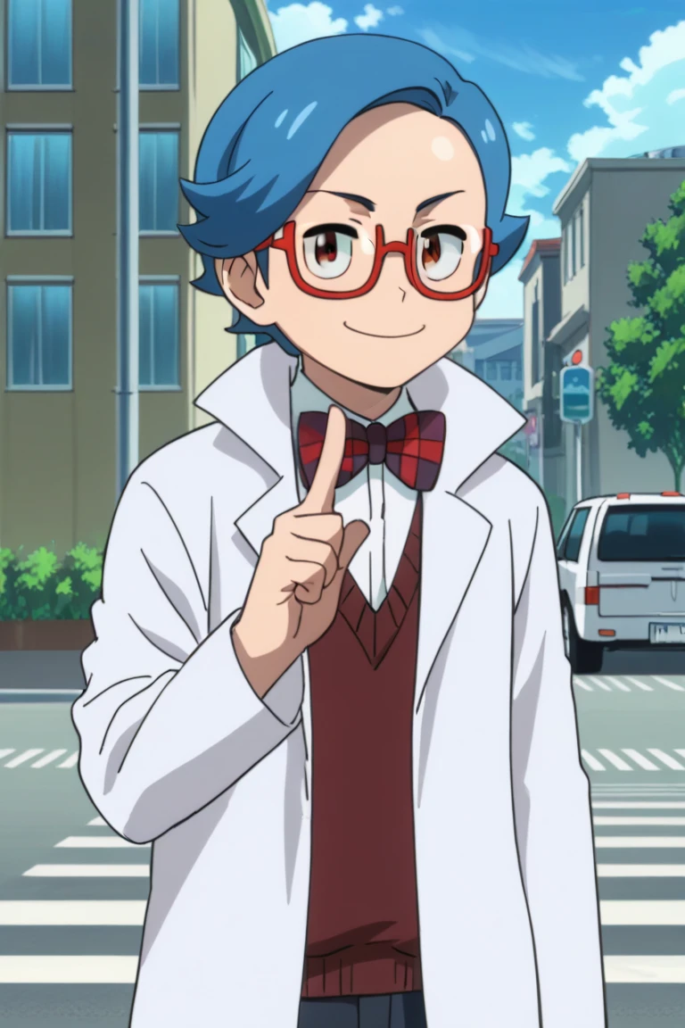Prompts: male, blue hair, multicolored eyes, brown eyes, red eyes, glasses, labcoat, bowtie, white shirt, sweater vest, pants, brown loafers, indoors (bookstore/bookshelf/books/counter/monitor/painting (object)), outdoors (city/sky/building/street/crosswalk/traffic light/bush/tree/car/truck), outdoors (park/blue sky/cloud/house/tree/railing/jungle gym/slide), holographic interface