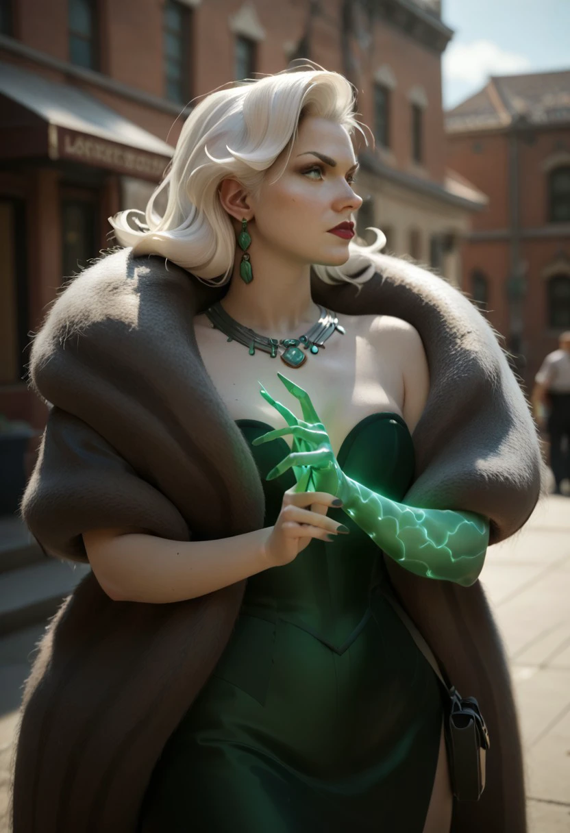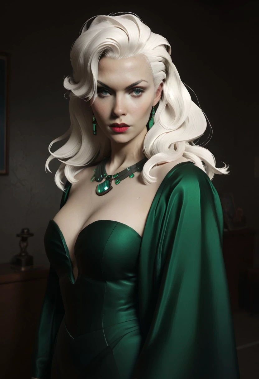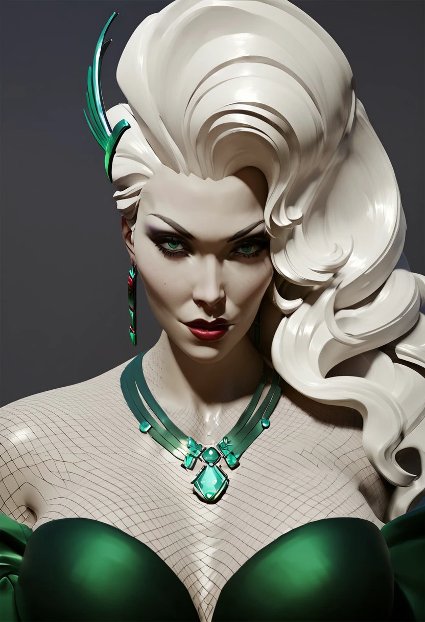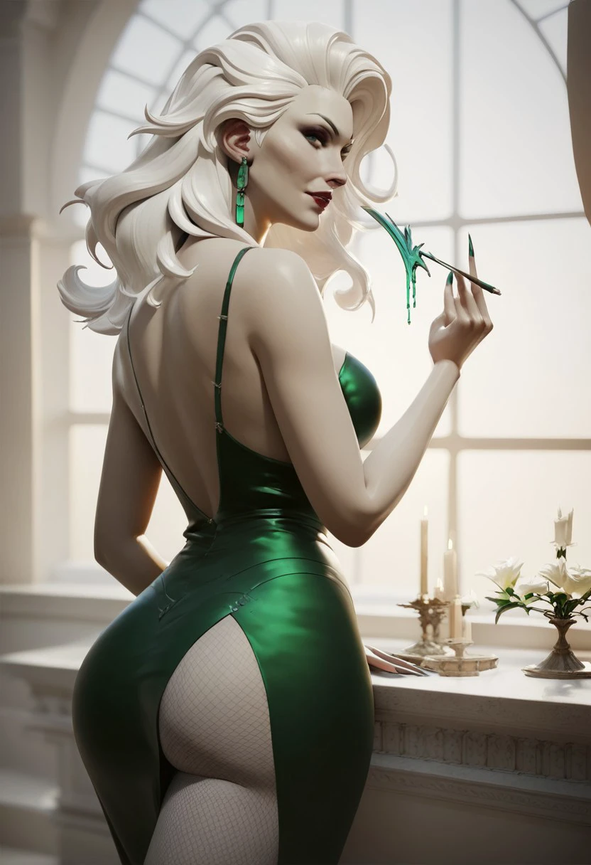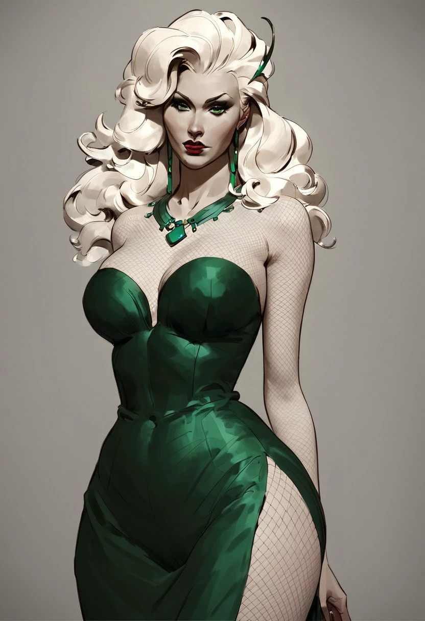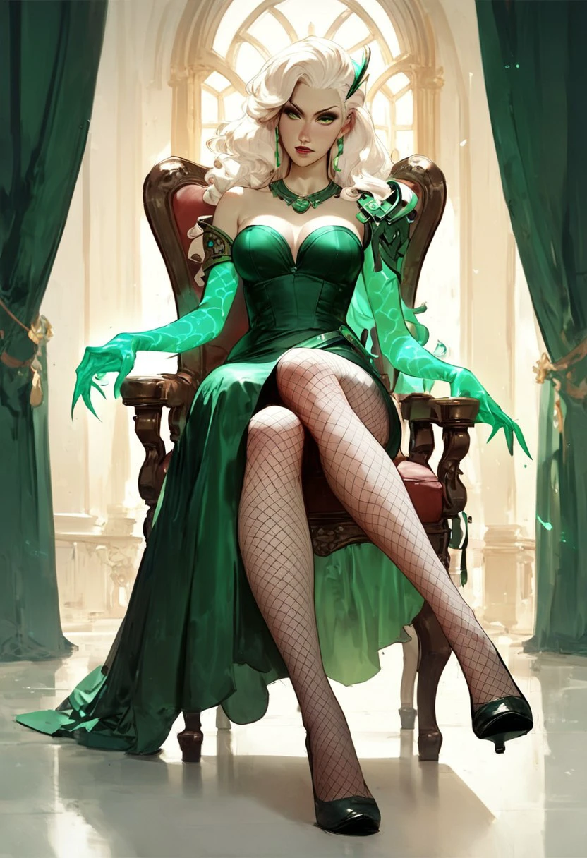 green eyes, white hair, green long dress, fishnets, pantyhose, high heels, green jewelry