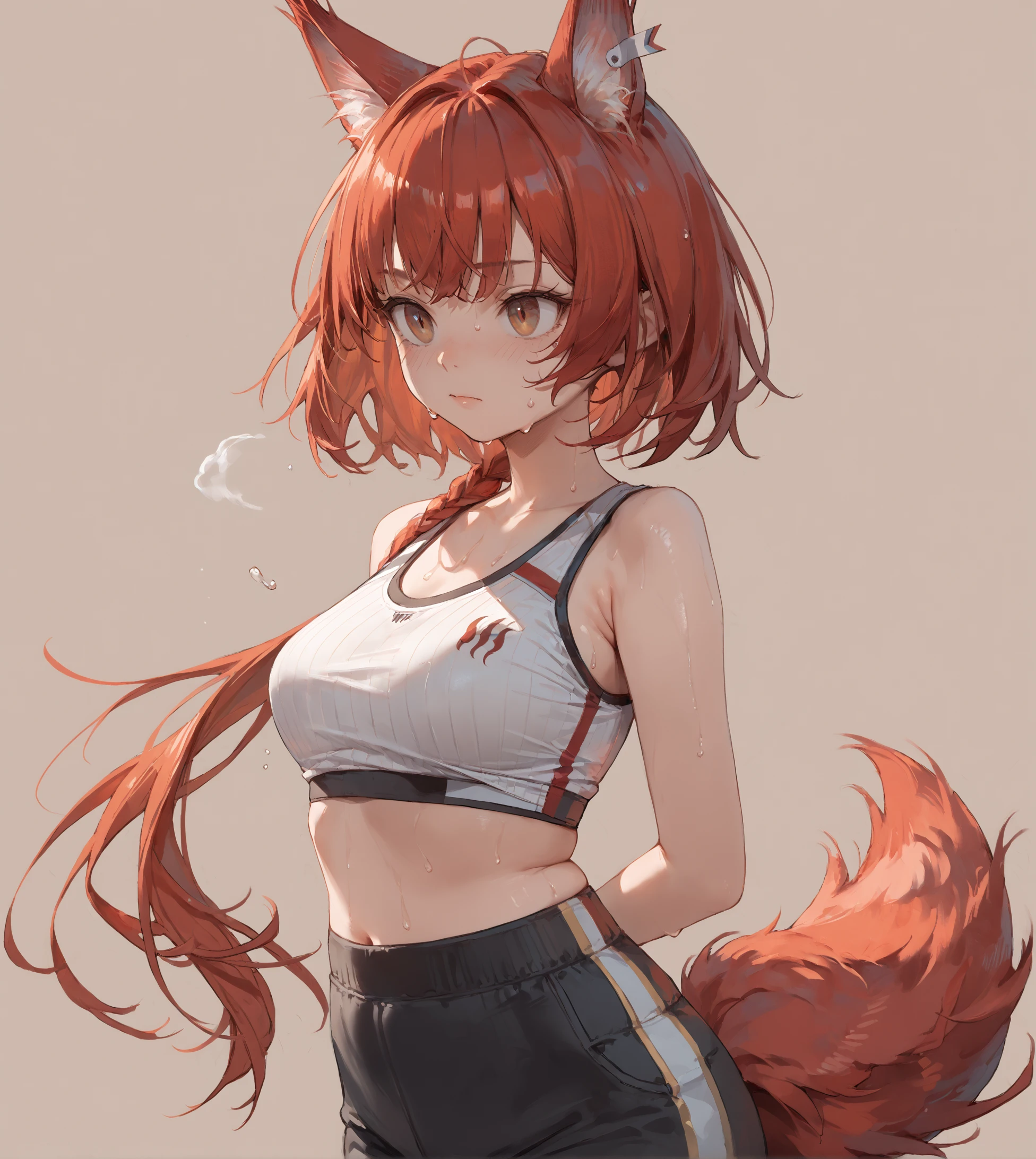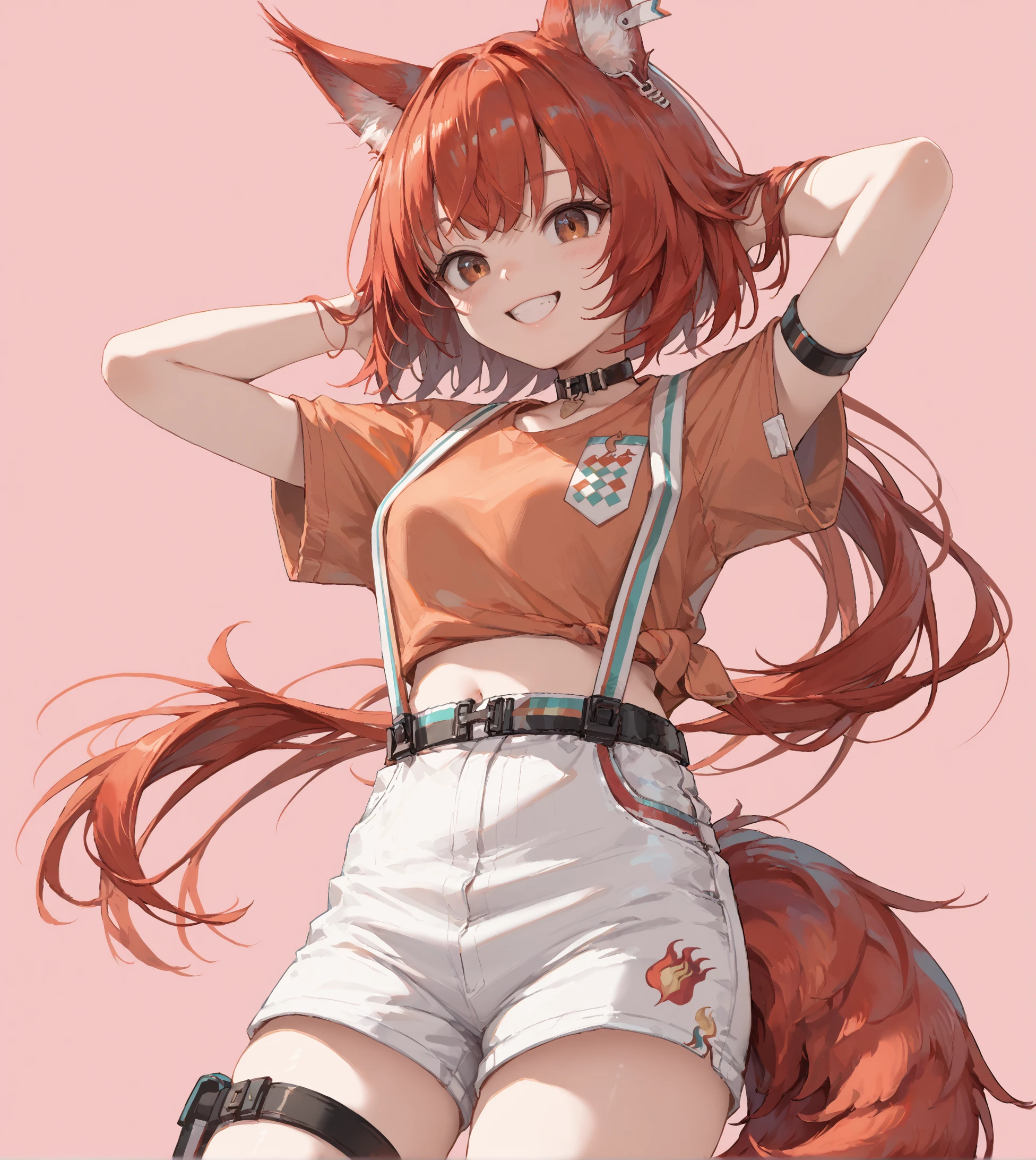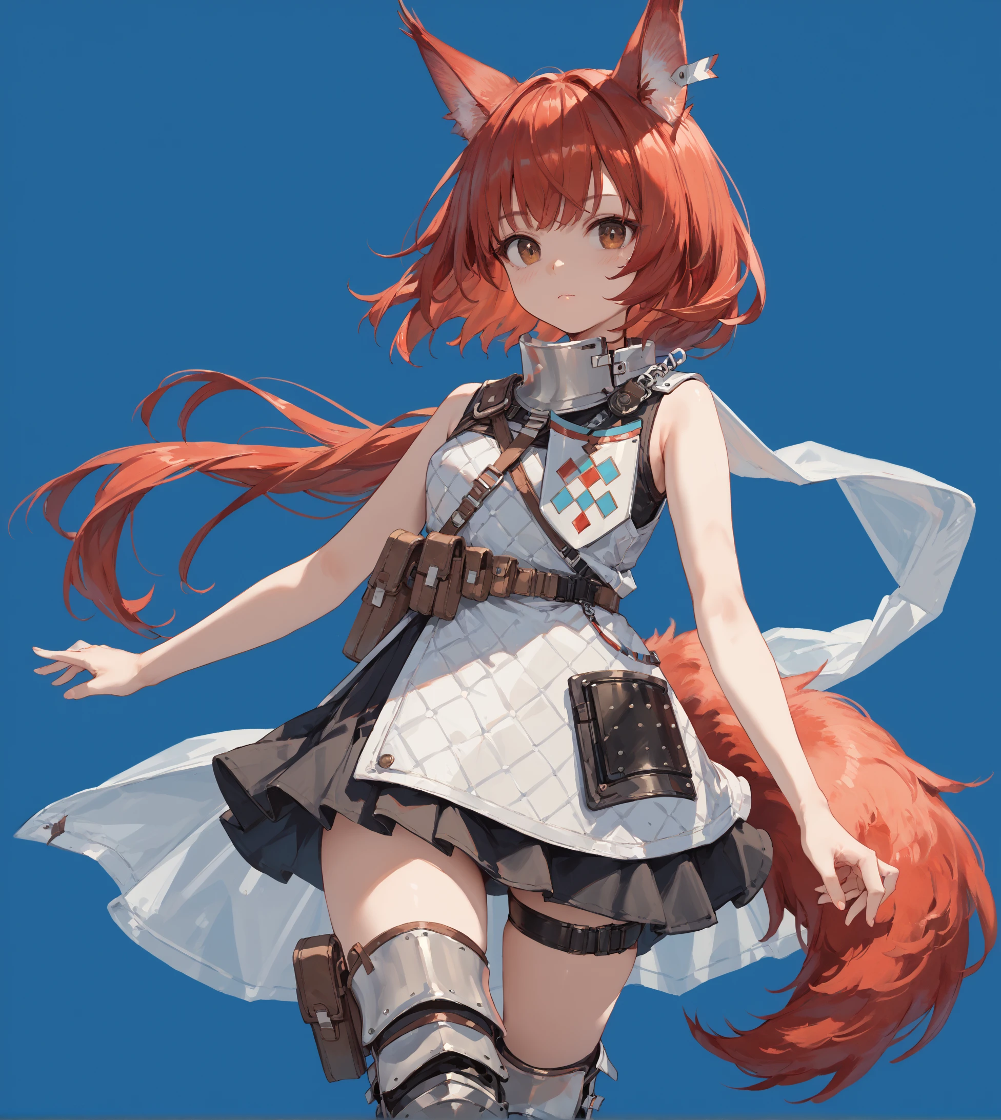 1girl, solo, flametail, red hair, long hair, animal ears, brown eyes, squirrel tail, Standart outfit: